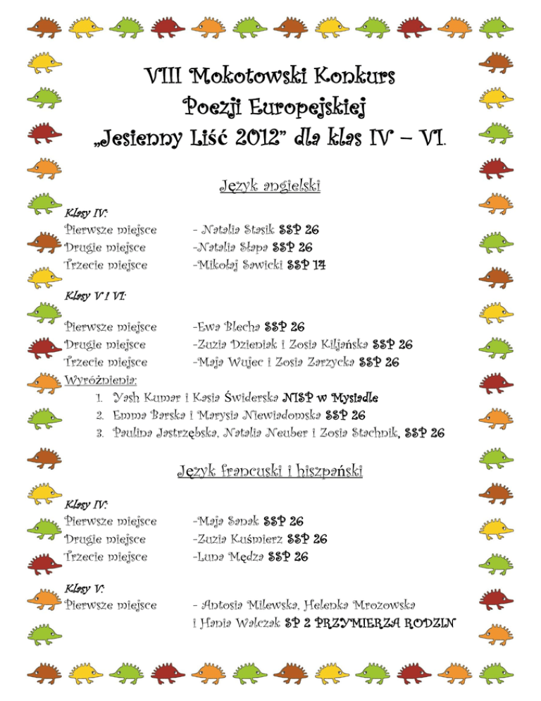 VIII Mokotowski Konkurs Poezji Europejskiej „Jesienny Liść 2012” dla klas IV – VI. Język angielski Klasy IV: Pierwsze miejsce Drugie miejsce Trzecie miejsce - Natalia Stasik SSP 26 -Natalia Słapa SSP 26 -Mikołaj Sawicki SSP 14 Klasy V i VI: Pierwsze miejsce -Ewa Blecha SSP 26 Drugie miejsce -Zuzia Dzieniak i Zosia Kiljańska SSP 26 Trzecie miejsce -Maja Wujec i Zosia Zarzycka SSP 26 Wyróżnienia: 1. Yash Kumar i Kasia Świderska NISP w Mysiadle 2. Emma Barska i Marysia Niewiadomska SSP 26 3. Paulina Jastrzębska, Natalia Neuber i Zosia Stachnik, SSP 26 Język francuski i hiszpański Klasy IV: Pierwsze miejsce Drugie miejsce Trzecie miejsce -Maja Sanak SSP 26 -Zuzia Kuśmierz SSP 26 -Luna Mędza SSP 26 Klasy V: Pierwsze miejsce - Antosia Milewska, Helenka Mrozowska i Hania Walczak SP 2 PRZYMIERZA RODZIN Drugie miejsce Trzecie miejsce -Maksymilian Hojka, Antek Klamka i Martyna Madej SP 2 PRZYMIERZA RODZIN -Zosia Kowalik i Jaśmina Orłowska SSP 26 -Ksawery Struss i Kalina Światełko-Nachtlicht SSP 26 Klasy VI: Pierwsze miejsce Drugie miejsce Trzecie miejsce -Jasmin Mmerole i Pola Osińska SP 2 PRZYMIERZA RODZIN -Aleks Bernaciak SSP 14 -Pola Ciszewska i Julia Kulawska SSP 14 Język niemiecki Klasy V: Pierwsze miejsce Drugie miejsce Trzecie miejsce -Aleks Kurak i Mikołaj Kaleński-Jaśkiewicz SPN 49 -Gabrysia Kingston SP 2 PRZYMIERZA RODZIN -Zuzia Bal SPN 49 Klasy VI: Pierwsze miejsce Drugie miejsce Trzecie miejsce -Józek Szafrański SP 2 PRZYMIERZA RODZIN - Karolina Kotłowska i Zuzia Opuchlik SSP 26 -Emilia Makarenko, Witek Kraszewski i Krzyś Sapała SP 2 PRZYMIERZA RODZIN -Ola Tokarska SSP 26 -Marysia Kawczyńska i Weronika Kopeć SPN 49 VIII Mokotowski Konkurs Poezji Europejskiej „Jesienny Liść 2008” dla klas IV – VI GRAND PRIX Klasy IV: ZŁOTY LIŚĆ: Natalia Stasik SSP 26 SREBRNY LIŚĆ: Natalia Słapa SSP 26 Klasy V: ZŁOTY LIŚĆ: Zuzia Dzieniak i Zosia Kiljańska SSP 26 SREBRNY LIŚĆ: Maja Wujec i Zosia Zarzycka SSP 26 Ewa Blecha SSP 26 Klasy VI: ZŁOTY LIŚĆ: SREBRNY LIŚĆ: Karolina Kotłowska i Zuzia Opuchlik SSP 26 Kacper Mielczarek SSP 26