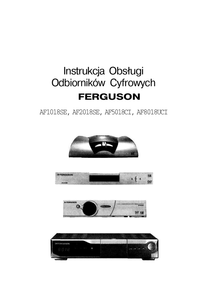 Instrukcja Obsługi Odbiorników Cyfrowych FERGUSON AF1018SE, AF2018SE, AF5018CI, AF8018UCI SPIS^REŚCI 1. BEZPIECZEŃSTWO 2. OPIS ODBIORNIKA 2.1 PANEL PRZEDNI AF 2018 SE 2.2 ŚCIANKA TYLNA ODBIORNIKA AF2018 SE 2.3 PANEL PRZEDNI AF 1018 SE 2.4 ŚCIANKA TYLNA AF 1018 SE 2.5 PANEL PRZEDNI AF 8018 UCI 2.6 ŚCIANKA TYLNA AF 801 SUCI 2.7 PANEL PRZEDNI AF 5018 Cl 2.8 ŚCIANKA TYLNA AF 5018 Cl 2.9 PILOT ZDALNEGO STEROWANIA 3. PODŁĄCZENIE ODBIORNIKA 3 4 4 5 5 6 6 7 7 8 9 4. USTAWIENIA l OBSŁUGA ODBIORNIKA 4.1 INSTALACJA ODBIORNIKA 4.1.1. USTAWIENIE JĘZYKA 4.1.2 EDYCJA SATELITY 4.1.3 USTAWIENIE ANTENY 4.1.4 AUTOMATYCZNE WYSZUKIWANIE 4.1.5 USTAWIENIA CZASU 4.2 USTAWIENIA W CELU POSZUKIWANIA KANAŁU 4.2.1 POSZUKAJ KANAŁ 4.2.2 USTAWIENIA ANTENY 4.2.3 RĘCZNE WYSZUKIWANIE 4.2.4 AUTOMATYCZNE WYSZUKIWANIE 4.3 EDYCJA 4.3.1 EDYCJA PROGRAMU 4.3.2 EDYCJA SATELITY 4.3.3 EDYCJA TRANSPONDERA 4.4 USTAWIENIA 4.4.1 USTAWIENIE JĘZYKA 4.4.2 USTAWIENIE GRAFIKI 4.4.3 USTAWIENIE WYJŚĆ 4.4.4 USTAWIENIE CZASU 4.4.5 KONTROLA BLOKAD 4.5 NARZĘDZIA 4.5.1 INFORMACJE 4.5.2 POZIOM SYGNAŁU 4.5.3 USTAWIENIA FABRYCZNE 4.5.4 GRY 4.6 WAŻNE PRZYCISKI 4.6.1 PRZYCISK INFO 4.6.2 PRZYCISK O.K 4.6.3 PRZYCISK GROUP 4.6.4 PRZEWODNIK PROGRAMÓW 4.6.5 WYBÓR SYGNAŁU AUDIO 5. 6. 7. 8. 9. 10. MAPA MENU AKTUALIZACJA OPROGRAMOWANIA l LISTY PROGRAMÓW EDYCJA LISTY PROGRAMÓW PRZY UŻYCIU KOMPUTERA ROZWIĄZYWANIE DROBNYCH PROBLEMÓW SŁOWNIK NIEKTÓRYCH TERMINÓW DANE TECHNICZNE 10 11 11 11 12 13 13 15 15 16 16 17 17 18 18 20 20 22 22 23 23 24 24 24 25 25 26 27 28 29 29 30 1. BEZPIECZEŃSTWO Przed uruchomieniem odbiornika zalecamy zapoznanie się z niniejszą instrukcją obsługi. Nie zdejmować obudowy odbiornika. Dotknięcie wnętrza odbiornika może spowodować porażenie prądem. Do czyszczenia odbiornika używać wyłącznie miękkiej ścierki i delikatnych płynów zmywających. W przypadku kiedy odbiornik nie jest używany dłuższy czas oraz podczas wyładowań atmosferycznych zalecamy wyłączenie przewodu zasilającego z gniazdka. Nie łącz lub modyfikuj przewodów kiedy odbiornik jest pod napięciem. Nie dotykać uszkodzonego przewodu zasilającego mokrą ręką. Może to spowodować porażenie prądem. Odbiornik umiejscowić w dobrze wentylowanym i nie gorącym miejscu. Nigdy nie stawiać innego sprzętu elektronicznego na odbiorniku. Nie blokować otworów wentylacyjnych odbiornika. Podczas podłączania kabli odbiornik musi być wyłączony z sieci. Nie ustawiać odbiornika w otoczeniu przedmiotów (takich jak wazy) narażających odbiornik na możliwość kapania wody na niego lub wręcz zalanie. UWAGA! Jedynym sposobem na całkowite odizolowanie odbiornika od napięcia 220 V iest wyiecie wtyczki z gniazdka. 2. OPIS ODBIORNIKA 2.1 PANEL PRZEDNI AF2018SE A. B. C. D. Przycisk czuwania: Uruchamianie lub przełączanie w stan czuwania. CH A /CH T: Przyciski zmiany programów Czujnik fal podczerwieni: Odbiera sygnały wysyłane z pilota zdalnego sterowania Wyświetlacz: Wyświetla status użytkowania odbiornika. Numer programu TV lub radiowego. W stanie czuwania wyświetla czas. 2.2. ŚCIANKA TYLNA ODBIORNIKA AF 2018 SE A. LNB OUT (Pętla Sygnału Konwertera): Wyjście sygnału z konwertera dla połączenia innego odbiornika satelitarnego. B. LNB IN (13,5/18V 500 mA MAX): Wejście sygnału z konwertera (przewód koncentryczny). C. TV/VCR SCART: Gniazda typu SCART do podłączenia odbiornika z telewizorem i magnetowidem D. RS-232: Port szeregowy do uaktualniania wersji programu. E. AUDIO: Wyjście typu CINCH lewego i prawego kanału stereo do podłączenia ze sprzętem Audio, 2.3 BANEL PRZEDNI AF 1018 SE A. Przycisk czuwania: Uruchamianie lub przełączanie w stan czuwania B. CHA/CH T: Przyciski zmiany programów C. Diody stanu pracy odbiornika 2.4 ŚCIANKA TYLNA ODBIORNIKA A. LNB OUT (Pętla Sygnału Konwertera): Wyjście sygnału z konwertera dla połączenia innego odbiornika satelitarnego B. LNB IN (13,5/18V 500 mA MAK): Wejście sygnału z konwertera (przewód koncentryczny) C. RS-232: Port szeregowy do uaktualnienia wersji programu i edycji programów D. TV/AUX SCART: Gniazda typu SCART do podłączenia odbiornika z telewizorem i magnetowidem E. AUDIO: Wyjście typu CINCH lewego i prawego kanału stereo do podłączenia ze sprzętem Audio F. Cyfrowe wyjście sygnału Audio Dolby ;j G. Wejście zewnętrznego czujnika podczerwieni 2.5 PAWEŁ PRZEDNI AF 8018 UCI A. Stand By: Dioda stanu pracy odbiornika B. Lock: Oznacza pojawienie się sygnału z anteny C. Remote: Czujnik fal podczerwieni, odbiera sygnały wysyłane z pilota zdalnego sterowania D. Przycisk czuwania: Uruchamianie lub przełączanie w stan czuwania E. Menu: wywołuje Główne Menu na ekranie telewizora F. OK: zatwierdza wybraną, podświetloną pozycję w menu, podczas oglądania TV lub słuchania programów radiowych wywołuje listę programów G. Exit: przywraca poprzednie menu lub powoduje opuszczenie bieżącego trybu pracy H. CHA/CH T, VOLA/VOLA: Przyciski zmiany programów, Przyciski ustawienia poziomu głosu 2.6 ŚCIANKA TYLNA AF 8018 UCI A. LNB OUT (Pętla Sygnału Konwertera): Wyjście sygnału z konwertera dla połączenia innego odbiornika satelitarnego B. LNB IN (13,5/18V 500 mA MAX): Wejście sygnału z konwertera (przewód koncentryczny) C. Wejście/Wyjście modulatora RF D. S/PDF: Wyjście cyfrowe sygnału Audio Dolby E. RS-232: Port szeregowy do uaktualnienia wersji programu i edycji programów <5| %• F. VIDEO: Wyjście typu CINCH . : G. AUDIO: Wyjście typu CINCH lewego i prawego kanału stereo do podłączenia ze sprzętem Audio H. TV/VCR SCART: Gniazda typu SCART do podłączenia odbiornika z telewizorem i magnetowidem l. 0/12 V: Wyjście typu CINCH 2 . O S ODBIORNIKA 2.7 PANEL PRZEDNI AF 5018 Cl A. B. C. D. Przycisk czuwania: Uruchamianie lub przełączanie w stan czuwania. CH A /CH T: Przyciski zmiany programów Czujnik fal podczerwieni: Odbiera sygnały wysyłane z pilota zdalnego sterowania Wyświetlacz: Wyświetla status użytkowan