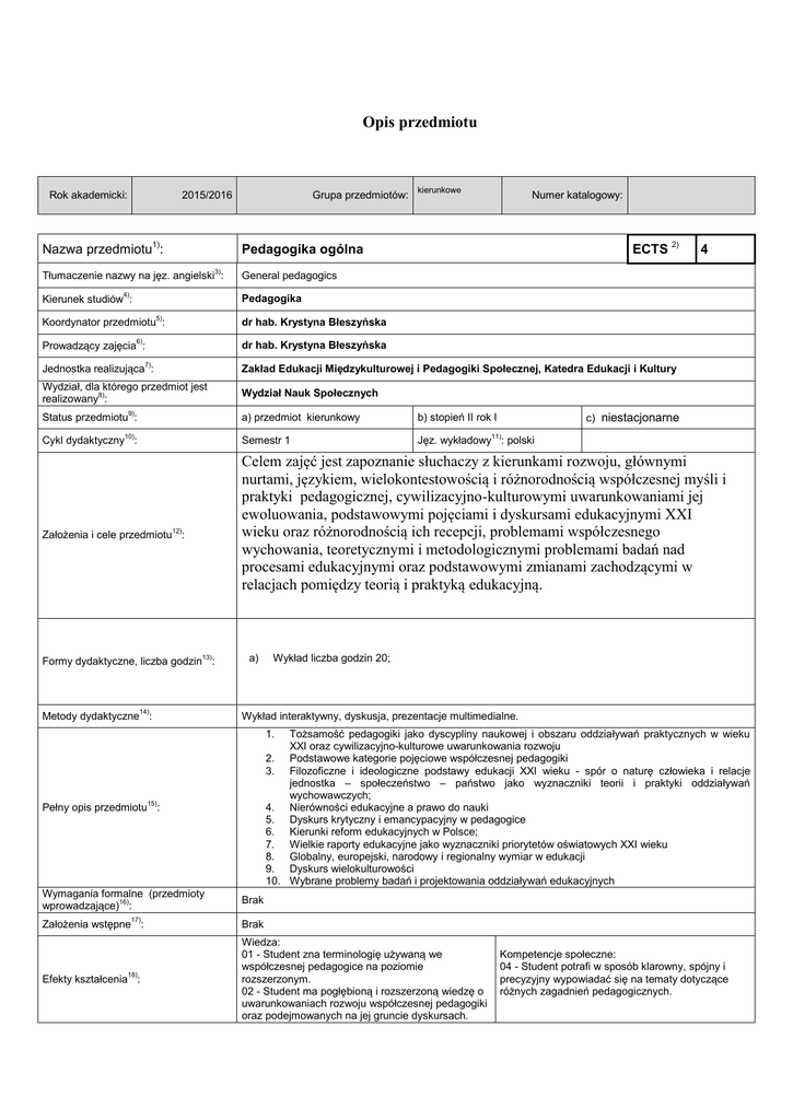 Opis przedmiotu Rok akademicki: Grupa przedmiotów: 2015/2016 Nazwa przedmiotu1): Pedagogika ogólna Tłumaczenie nazwy na jęz. angielski3): General pedagogics 4) Kierunek studiów : kierunkowe Numer katalogowy: ECTS 2) 4 Pedagogika Koordynator przedmiotu5): 6) dr hab. Krystyna Błeszyńska Prowadzący zajęcia : dr hab. Krystyna Błeszyńska Jednostka realizująca7): Zakład Edukacji Międzykulturowej i Pedagogiki Społecznej, Katedra Edukacji i Kultury Wydział, dla którego przedmiot jest realizowany8): Wydział Nauk Społecznych Status przedmiotu9): a) przedmiot kierunkowy 10) Cykl dydaktyczny : Założenia i cele przedmiotu12): Formy dydaktyczne, liczba godzin13): Metody dydaktyczne14): Semestr 1 b) stopień II rok I c) niestacjonarne 11) Jęz. wykładowy : polski Celem zajęć jest zapoznanie słuchaczy z kierunkami rozwoju, głównymi nurtami, językiem, wielokontestowością i różnorodnością współczesnej myśli i praktyki pedagogicznej, cywilizacyjno-kulturowymi uwarunkowaniami jej ewoluowania, podstawowymi pojęciami i dyskursami edukacyjnymi XXI wieku oraz różnorodnością ich recepcji, problemami współczesnego wychowania, teoretycznymi i metodologicznymi problemami badań nad procesami edukacyjnymi oraz podstawowymi zmianami zachodzącymi w relacjach pomiędzy teorią i praktyką edukacyjną. a) Wykład liczba godzin 20; Wykład interaktywny, dyskusja, prezentacje multimedialne. Tożsamość pedagogiki jako dyscypliny naukowej i obszaru oddziaływań praktycznych w wieku XXI oraz cywilizacyjno-kulturowe uwarunkowania rozwoju 2. Podstawowe kategorie pojęciowe współczesnej pedagogiki 3. Filozoficzne i ideologiczne podstawy edukacji XXI wieku - spór o naturę człowieka i relacje jednostka – społeczeństwo – państwo jako wyznaczniki teorii i praktyki oddziaływań wychowawczych; 4. Nierówności edukacyjne a prawo do nauki 5. Dyskurs krytyczny i emancypacyjny w pedagogice 6. Kierunki reform edukacyjnych w Polsce; 7. Wielkie raporty edukacyjne jako wyznaczniki priorytetów oświatowych XXI wieku 8. Globalny, europejski, narodowy i regionalny wymiar w edukacji 9. Dyskurs wielokulturowości 10. Wybrane problemy badań i projektowania oddziaływań edukacyjnych 1. Pełny opis przedmiotu15): Wymagania formalne (przedmioty wprowadzające)16): Brak Założenia wstępne17): Brak 18) Efekty kształcenia : Wiedza: 01 - Student zna terminologię używaną we współczesnej pedagogice na poziomie rozszerzonym. 02 - Student ma pogłębioną i rozszerzoną wiedzę o uwarunkowaniach rozwoju współczesnej pedagogiki oraz podejmowanych na jej gruncie dyskursach. Kompetencje społeczne: 04 - Student potrafi w sposób klarowny, spójny i precyzyjny wypowiadać się na tematy dotyczące różnych zagadnień pedagogicznych. Umiejętności: 03 - Student potrafi wykorzystywać i integrować wiedzę teoretyczną z zakresu pedagogiki oraz powiązanych z nią dyscyplin w celu analizy złożonych problemów edukacyjnych, wychowawczych i opiekuńczych. Sposób weryfikacji efektów kształcenia19): Egzamin pisemny– 01, 02, 03, 04. Forma dokumentacji osiągniętych efektów kształcenia 20): Elementy i wagi mające wpływ na ocenę końcową21): Protokół egzaminu, prace egzaminacyjne Miejsce realizacji zajęć22): Sala dydaktyczna Ocena pracy egzaminacyjnej Literatura podstawowa i uzupełniająca23): 1. Błeszyńska, K. (2011): - Teoretyczny status edukacji międzykulturowej; w: J. Nikitorowicz, A. Sadowski, D. Misiejuk (red.): Edukacja międzykulturowa. Pogranicze. Studia społeczne, t. XVII, cz. 1; Białystok: Wydawnictwo Uniwersytetu w Białymstoku, . 39 - 54. 2. Borowska A.,(2004): Kształcenie dla przyszłości, Warszawa: Wyd. Akademickie „Żak. 3. Botkin, J, Elmandjra, M, Malitz, M. (1982): Uczyć się bez granic; Warszawa: PWN; 4. Dudzikowa M., Czerepaniak – Walczak M. (red. (2007)): Wychowanie. Pojęcia – Procesy – Konteksty, tom 2,Gdańsk; GWP. 5. Faure, E. (1975): Uczyć się, aby być; Warszawa: PWN; 6. Gutek, G. (2003): Filozoficzne i ideologiczne podstawy edukacji; Gdańsk; GWP. 7. Kostyro, P. (2008): Wykluczanie jako problem filozofii edukacji; Kraków: Impuls; 8. Kruger, H-H. (20050: Wprowadzenie w teorie i metody badawcze nauk o wychowaniu; Gdańsk; GWP. 9. Międzynarodowa Komisja ds. Edukacji XXI wieku (1998): Edukacja – jest w niej ukryty skarb; Warszawa: Stowarzyszenie Oświatowców Polskich; 10. Kwieciński Z., Śliwerski B. (red.) (2003): Pedagogika – podręcznik akademicki, Warszawa: PWN. 11. Śliwerski B., Współczesne teorie i nurty wychowania, Impuls, Kraków 2003. 12. Żłobicki W., Ukryty program w edukacji, Ofic. Wyd. „Impuls”, Kraków, 2002. UWAGI24): Wskaźniki ilościowe charakteryzujące moduł/przedmiot25) : Szacunkowa sumaryczna liczba godzin pracy studenta (kontaktowych i pracy własnej) niezbędna dla osiągnięcia zakładanych 100 h efektów kształcenia18) - na tej podstawie należy wypełnić pole ECTS2: Łączna liczba punktów ECTS, którą student uzyskuje na zajęciach wymagających bezpośredniego udziału nauczycieli 0,8 ECTS akademickich: Łączna liczba punktów ECTS, którą student uzyskuje w ramach zajęć o charakterze praktycznym, takich jak zajęcia laboratoryjne, 3,2 ECTS projektowe, itp.: Tabela zgodności kierunkowych efektów kształcenia z efektami przedmiotu 26) Nr /symbol efektu 01 02 03 04 Wymienione w wierszu efekty kształcenia: Student zna terminologię używaną w pedagogice na poziomie rozszerzonym. Student ma pogłębioną i rozszerzoną wiedzę o uwarunkowaniach rozwoju współczesnej pedagogiki oraz podejmowanych na jej gruncie dyskursach. Student potrafi wykorzystywać i integrować wiedzę teoretyczną z zakresu pedagogiki oraz powiązanych z nią dyscyplin w celu analizy złożonych problemów edukacyjnych, wychowawczych i opiekuńczych. Student potrafi w sposób klarowny, spójny i precyzyjny wypowiadać się na tematy dotyczące różnych zagadnień pedagogicznych. Odniesienie do efektów dla p