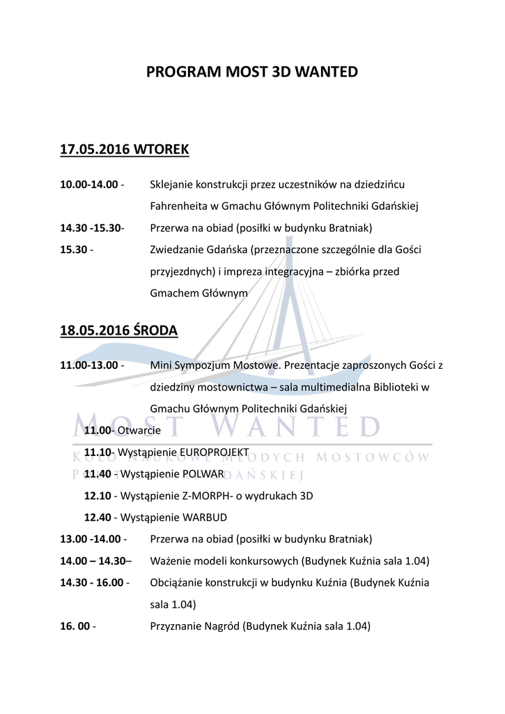 PROGRAM MOST 3D WANTED 17.05.2016 WTOREK 10.00-14.00 - Sklejanie konstrukcji przez uczestników na dziedzińcu Fahrenheita w Gmachu Głównym Politechniki Gdańskiej 14.30 -15.30- Przerwa na obiad (posiłki w budynku Bratniak) 15.30 - Zwiedzanie Gdańska (przeznaczone szczególnie dla Gości przyjezdnych) i impreza integracyjna – zbiórka przed Gmachem Głównym 18.05.2016 ŚRODA 11.00-13.00 - Mini Sympozjum Mostowe. Prezentacje zaproszonych Gości z dziedziny mostownictwa – sala multimedialna Biblioteki w Gmachu Głównym Politechniki Gdańskiej 11.00- Otwarcie 11.10- Wystąpienie EUROPROJEKT 11.40 - Wystąpienie POLWAR 12.10 - Wystąpienie Z-MORPH- o wydrukach 3D 12.40 - Wystąpienie WARBUD 13.00 -14.00 - Przerwa na obiad (posiłki w budynku Bratniak) 14.00 – 14.30– Ważenie modeli konkursowych (Budynek Kuźnia sala 1.04) 14.30 - 16.00 - Obciążanie konstrukcji w budynku Kuźnia (Budynek Kuźnia sala 1.04) 16. 00 - Przyznanie Nagród (Budynek Kuźnia sala 1.04)