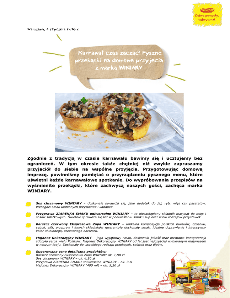Warszawa, 4 stycznia 2016 r. Karnawał czas zacząć! Pyszne przekąski na domowe przyjęcia z marką WINIARY Zgodnie z tradycją w czasie karnawału bawimy się i ucztujemy bez ograniczeń. W tym okresie także chętniej niż zwykle zapraszamy przyjaciół do siebie na wspólne przyjęcia. Przygotowując domową imprezę, powinniśmy pamiętać o przyrządzeniu pysznego menu, które uświetni każde karnawałowe spotkanie. Do wypróbowania przepisów na wyśmienite przekąski, które zachwycą naszych gości, zachęca marka WINIARY. Sos chrzanowy WINIARY – doskonale sprawdzi się, jako dodatek do jaj, ryb, mięs czy pasztetów. Wzbogaci smak ulubionych przystawek i kanapek. Przyprawa ZIARENKA SMAKU uniwersalne WINIARY – to niezastąpiony składnik marynat do mięs i sosów sałatkowych. Świetnie sprawdza się też w podkreśleniu smaku zup oraz wielu rodzajów przystawek. Barszcz czerwony Ekspresowa Zupa WINIARY – unikalna kompozycja polskich buraków, czosnku, cebuli, ziół, przypraw i innych składników gwarantuje doskonały smak, idealne doprawienie i intensywny kolor ulubionego, czerwonego barszczu. Majonez Dekoracyjny WINIARY – jego wyjątkowy smak, doskonała jakość oraz kremowa konsystencja zdobyła serca wielu Polaków. Majonez Dekoracyjny WINIARY od lat jest najczęściej wybieranym majonezem w naszym kraju. Doskonały do wszelkiego rodzaju przekąsek, sałatek oraz dipów. Sugerowana cena detaliczna produktów: Barszcz czerwony Ekspresowa Zupa WINIARY ok. 1,90 zł Sos chrzanowy WINIARY – ok. 4,20 zł Przyprawa ZIARENKA SMAKU uniwersalne WINIARY – ok. 3 zł Majonez Dekoracyjny WINIARY (400 ml) – ok. 5,20 zł W czasie karnawału zgodnie ze zwyczajem nie powinniśmy sobie niczego odmawiać. W tym okresie częściej niż zwykle zapraszamy więc do siebie znajomych na wspólne przyjęcia. Przygotowując karnawałową imprezę w swoim domu, nie możemy zapomnieć o smacznych przekąskach, które sprawią, że wszyscy będą znakomicie bawić się aż do rana. Jak przyrządzić dania idealne na karnawałowe przyjęcie w gronie przyjaciół, podpowiada marka WINIARY. Na dobry początek proponujemy wytrawne, kruche babeczki z pieczarkami podsmażanymi na maśle z cebulą i doprawionymi Przyprawą ZIARENKA SMAKU uniwersalne WINIARY. Przygotowanie tej pysznej przekąski zaczynamy od ciasta mąkę, masło i żółtka łączymy i dodajemy 2-3 łyżki zimnej wody. Następnie zagniecione ciasto chłodzimy w lodówce przez 10 minut. W międzyczasie oczyszczone pieczarki (500g) i obraną cebulę (1 sztukę) kroimy w drobną kostkę, mieszamy je razem i doprawiamy Przyprawą ZIARENKA SMAKU uniwersalne WINIARY. Tak przygotowane warzywa smażymy na maśle przez ok. 15 minut. Następnie wyjmujemy ciasto z lodówki i rozwałkowujemy je cienko. Foremki do babeczek smarujemy tłuszczem i wylepiamy je wykrojonymi z ciasta krążkami. Babeczki pieczemy około 15 minut w rozgrzanym do 180ºC piekarniku. Następnie upieczone i wystudzone babeczki napełniamy farszem i gotowe! Przekąskę możemy serwować na ciepło i na zimno, np. z filiżanką barszczu czerwonego przygotowanego z Barszczem czerwonym Ekspresowa Zupa WINIARY. W ten prosty sposób przygotujemy przystawkę, w której z pewnością zasmakuje każdy gość. Doskonałym pomysłem na pyszną przekąskę dla znajomych na domowym przyjęciu będą także ruloniki z szynki z sosem jogurtowo-chrzanowym. Aby przygotować tę szybką i prostą przystawkę, wystarczy umyte i oczyszczone wcześniej jabłko i seler zetrzeć na tarce oraz skropić je sokiem z cytryny. Następnie dodać Sos chrzanowy WINIARY, doprawić pastę solą, pieprzem i cukrem oraz dokładnie wymieszać. Kolejnym krokiem jest nadziewanie plastrów szynki porcjami pasty selerowej i zawijanie jej w ruloniki. Następnie Sos chrzanowy WINIARY mieszamy z jogurtem i doprawiamy solą oraz cukrem. Tak przygotowany sos nada rulonikom wspaniałego smaku, a do dekoracji możemy użyć natki pietruszki. Roladki z szynki podane z chlebem lub jako samodzielna przekąska z pewnością okażą się strzałem w dziesiątkę na każdym karnawałowym spotkaniu! Na domowym przyjęciu w gronie znajomych i przyjaciół nie może zabraknąć także sałatki! W czasie karnawałowej zabawy najlepiej sprawdzi się pożywna przystawka z kurczakiem, czyli popularny gyros. Aby przygotować ten przysmak, należy pokroić w kostkę 3 filety z kurczaka. Następnie obieramy i siekamy cebulę. Mięso oprószamy Przyprawą ZIARENKA SMAKU uniwersalne WINIARY, papryką, pieprzem, oregano i niewielką ilością oleju. Wszystko mieszamy i odstawiamy na 2 godziny do lodówki. Kapustę pekińską szatkujemy i posypujemy solą na 1 godzinę przed podaniem. Później ogórki i pomidory kroimy w kostkę. Filety z kurczaka z cebulą smażymy na rozgrzanej patelni przez 10-15 minut. W naczyniu układamy warstwami: mięso, ogórki, pomidory, kukurydzę i dodajemy Majonez Dekoracyjny WINIARY. Pyszną sałatkę podajemy w salaterkach i posypujemy kapustą pekińską. Smacznego! Więcej przepisów na karnawałowe przystawki, którymi zachwycimy naszych gości, znajdziemy na stronie www.winiary.pl. ### WINIARY to marka, która od lat jest gwarancją sukcesu w kuchni. Jej produkty inspirują współczesne panie domu do przygotowywania najsmaczniejszych potraw dla całej rodziny. Zupy, majonezy, buliony, sosy, Pomysły na…, dania instant, przyprawy, galaretki, kisiele czy budynie – w sumie ponad 230 różnych produktów kulinarnych WINIARY, które pozwalają w szybki i prosty sposób przyrządzić domowy posiłek. Na stronie www.winiary.pl panie domu znajdą przepisy oraz inspiracje kulinarne na każdy dzień. Produkty marki WINIARY rokrocznie zdobywają liczne nagrody przyznawane przez konsumentów i detalistów. W 2011 oraz 2012 roku redakcja „Rzeczpospolitej” przyznała marce WINIARY prestiżowy tytuł Najmocniejszej Marki Roku. Kontakt do biura prasowego: Kamila Dębniak kom. +48 508 988 861 email: [em