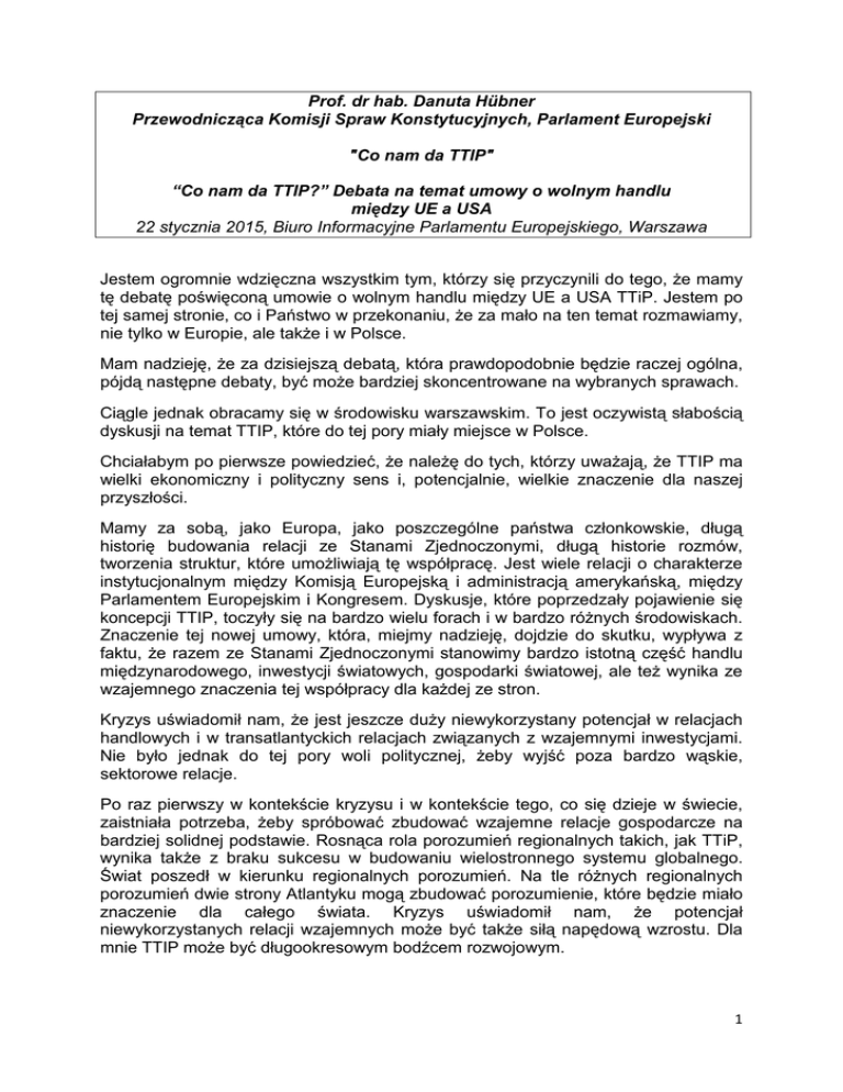 Prof. dr hab. Danuta Hübner Przewodnicząca Komisji Spraw Konstytucyjnych, Parlament Europejski "Co nam da TTIP" “Co nam da TTIP?” Debata na temat umowy o wolnym handlu między UE a USA 22 stycznia 2015, Biuro Informacyjne Parlamentu Europejskiego, Warszawa Jestem ogromnie wdzięczna wszystkim tym, którzy się przyczynili do tego, że mamy tę debatę poświęconą umowie o wolnym handlu między UE a USA TTiP. Jestem po tej samej stronie, co i Państwo w przekonaniu, że za mało na ten temat rozmawiamy, nie tylko w Europie, ale także i w Polsce. Mam nadzieję, że za dzisiejszą debatą, która prawdopodobnie będzie raczej ogólna, pójdą następne debaty, być może bardziej skoncentrowane na wybranych sprawach. Ciągle jednak obracamy się w środowisku warszawskim. To jest oczywistą słabością dyskusji na temat TTIP, które do tej pory miały miejsce w Polsce. Chciałabym po pierwsze powiedzieć, że należę do tych, którzy uważają, że TTIP ma wielki ekonomiczny i polityczny sens i, potencjalnie, wielkie znaczenie dla naszej przyszłości. Mamy za sobą, jako Europa, jako poszczególne państwa członkowskie, długą historię budowania relacji ze Stanami Zjednoczonymi, długą historie rozmów, tworzenia struktur, które umożliwiają tę współpracę. Jest wiele relacji o charakterze instytucjonalnym między Komisją Europejską i administracją amerykańską, między Parlamentem Europejskim i Kongresem. Dyskusje, które poprzedzały pojawienie się koncepcji TTIP, toczyły się na bardzo wielu forach i w bardzo różnych środowiskach. Znaczenie tej nowej umowy, która, miejmy nadzieję, dojdzie do skutku, wypływa z faktu, że razem ze Stanami Zjednoczonymi stanowimy bardzo istotną część handlu międzynarodowego, inwestycji światowych, gospodarki światowej, ale też wynika ze wzajemnego znaczenia tej współpracy dla każdej ze stron. Kryzys uświadomił nam, że jest jeszcze duży niewykorzystany potencjał w relacjach handlowych i w transatlantyckich relacjach związanych z wzajemnymi inwestycjami. Nie było jednak do tej pory woli politycznej, żeby wyjść poza bardzo wąskie, sektorowe relacje. Po raz pierwszy w kontekście kryzysu i w kontekście tego, co się dzieje w świecie, zaistniała potrzeba, żeby spróbować zbudować wzajemne relacje gospodarcze na bardziej solidnej podstawie. Rosnąca rola porozumień regionalnych takich, jak TTiP, wynika także z braku sukcesu w budowaniu wielostronnego systemu globalnego. Świat poszedł w kierunku regionalnych porozumień. Na tle różnych regionalnych porozumień dwie strony Atlantyku mogą zbudować porozumienie, które będzie miało znaczenie dla całego świata. Kryzys uświadomił nam, że potencjał niewykorzystanych relacji wzajemnych może być także siłą napędową wzrostu. Dla mnie TTIP może być długookresowym bodźcem rozwojowym. 1 Kilka słów na temat samego samego procesu. Zgodnie z Traktatem Komisja Europejska negocjuje międzynarodowe porozumienia. Wynika to z faktu, że Unia ma wyłączne kompetencje w sprawie handlu międzynarodowego. Warto pamiętać, że mandat do negocjacji umowy został przyjęty przez Radę, czyli wszystkie państwa członkowskie i przyjęty jednomyślnie 14 czerwca 2013 r. Został także zaaprobowany przez Parlament Europejski. W negocjacjach, które rozpoczęły się w czerwcu 2013 r., mamy już za sobą siedem rund. Ósma sesja odbędzie się w lutym tego roku. Rozmowy toczą się na różnych szczeblach, są rozmowy techniczne, przygotowawcze, między negocjatorami, także na wyższym, politycznym szczeblu. Parlament Europejski odgrywa szczególną rolę w tym procesie. Wynika to z faktu, że Traktat Lizboński wzmocnił rolę Parlamentu w relacjach międzynarodowych, szczególnie w negocjacjach umów międzynarodowych. Parlament kontroluje więc cały proces, nie tylko akceptuje mandat na początku i ratyfikuje po zakończeniu negocjacji. Ma także prawo i obowiązek monitorowania całego procesu. Stąd też główny negocjator przed każdą sesją negocjacyjną i po jej zakończeniu udziela parlamentarzystom informacji o ich przebiegu. W Parlamencie Europejskim odbywa się bardzo dużo różnego typu spotkań i przesłuchań z różnymi stronami, instytucjami, aktorami, którzy są w jakiś sposób zaangażowani w tę umowę, zarówno Europejczykami jak i Amerykanami. Bardzo wszechstronna debata o TTIP odbywa się więc już od ponad dwóch lat. Po stronie amerykańskiej głównym dzisiaj wyzwaniem politycznym jest problem instytucjonalny. Kongres powinien w pierwszej połowie tego roku udzielić Prezydentowi prawa do wykorzystania tzw. szybkiej ścieżki. Proces ten postawi przed Kongresem możliwość albo przyjęcia albo odrzucenia umowy, bez możliwości wprowadzenia do niej zmian. Wydaje się, że Republikanie są bardziej otwarci na relacje z Europą i na tego typu porozumienie niż Demokraci. Generalnie jednak, przyznanie Prezydentowi prawa do szybkiej ścieżki wymaga zgody dwóch Izb Kongresu. TTIP jest umową szczególną, która ma charakter mieszany. Dotyka kompetencji i polityk nie tylko europejskich, ale też ważnych spraw, które leżą w kompetencjach narodowych. Decyzja nie została jeszcze podjęta, ale najprawdopodobniej to porozumienie będzie wymagało ratyfikacji zarówno przez Parlament Europejski, jaki i przez parlamenty narodowe. Decyzja na ten temat może zapaść dopiero po zakończeniu negocjacji. Warto się też zastanowić, jak negocjacje mogą przebiegać w czasie. Okienko otwarte na dokończenie negocjacji to mniej więcej połowa przyszłego roku. Potem proces wyborczy w Stanach uniemożliwi prowadzenie negocjacji. Powiedziałam, że jest to porozumienie dość szczególne. Tworzy ono właściwie nową generację międzynarodowych porozumień gospodarczych. Obejmuje nie tylko to, co jest tradycją umów handlowych, czyli politykę celną, ale przede wszystkim zmierza do zmniejszenia obniżenia luki regulacyjnej międ