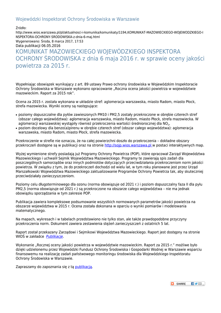 Wojewódzki Inspektorat Ochrony Środowiska w Warszawie Źródło: http://www.wios.warszawa.pl/pl/aktualnosci-i-komunika/komunikaty/1194,KOMUNIKAT-MAZOWIECKIEGO-WOJEWODZKIEGO-I NSPEKTORA-OCHRONY-SRODOWISKA-z-dnia-6-maj.html Wygenerowano: Środa, 8 marca 2017, 17:53 Data publikacji 06.05.2016 KOMUNIKAT MAZOWIECKIEGO WOJEWÓDZKIEGO INSPEKTORA OCHRONY ŚRODOWISKA z dnia 6 maja 2016 r. w sprawie oceny jakości powietrza za 2015 r. Wypełniając obowiązek wynikający z art. 89 ustawy Prawo ochrony środowiska w Wojewódzkim Inspektoracie Ochrony Środowiska w Warszawie wykonano opracowanie „Roczna ocena jakości powietrza w województwie mazowieckim. Raport za 2015 rok”. Ocena za 2015 r. została wykonana w układzie stref: aglomeracja warszawska, miasto Radom, miasto Płock, strefa mazowiecka. Wyniki oceny są następujące: ● ● poziomy dopuszczalne dla pyłów zawieszonych PM10 i PM2,5 zostały przekroczone w obrębie czterech stref (obszar całego województwa): aglomeracja warszawska, miasto Radom, miasto Płock, strefa mazowiecka. W aglomeracji warszawskiej wystąpiły również przekroczenia wartości średniorocznej dla NO2, poziom docelowy dla benzo(a)pirenu w obrębie czterech stref (obszar całego województwa): aglomeracja warszawska, miasto Radom, miasto Płock, strefa mazowiecka. Przekroczenie w strefie nie oznacza, że na całej powierzchni doszło do przekroczenia – dokładne obszary przekroczeń dostępne są w publikacji oraz na stronie http://sojp.wios.warszawa.pl w postaci interaktywnych map. Wyżej wymienione strefy posiadają już Programy Ochrony Powietrza (POP), które opracował Zarząd Województwa Mazowieckiego i uchwalił Sejmik Województwa Mazowieckiego. Programy te zawierają spis zadań dla poszczególnych samorządów oraz innych podmiotów dotyczących przeciwdziałania przekroczeniom norm jakości powietrza. W związku z tym, że do przekroczeń dochodzi od wielu lat, w tym roku planowane jest przez Urząd Marszałkowski Województwa Mazowieckiego zaktualizowanie Programów Ochrony Powietrza tak, aby skuteczniej przeciwdziałały zanieczyszczeniom. Poziomy celu długoterminowego dla ozonu (norma obowiązuje od 2021 r.) i poziom dopuszczalny faza II dla pyłu PM2,5 (norma obowiązuje od 2021 r.) są przekroczone na obszarze całego województwa – nie ma jednak obowiązku sporządzania w tym zakresie POP. Publikacja zawiera kompleksowe podsumowanie wszystkich normowanych parametrów jakości powietrza na obszarze województwa w 2015 r. Ocena została dokonana w oparciu o wyniki pomiarów i modelowania matematycznego. Na mapach, wykresach i w tabelach przedstawiono nie tylko stan, ale także prawdopodobne przyczyny przekroczenia norm. Dokument zawiera zestawienia stężeń zanieczyszczeń z ostatnich 5 lat. Raport został przekazany Zarządowi i Sejmikowi Województwa Mazowieckiego. Raport jest dostępny na stronie WIOŚ w zakładce Publikacje. Wykonanie „Rocznej oceny jakości powietrza w województwie mazowieckim. Raport za 2015 r.” możliwe było dzięki udzielonemu przez Wojewódzki Fundusz Ochrony Środowiska i Gospodarki Wodnej w Warszawie wsparciu finansowemu na realizację zadań państwowego monitoringu środowiska dla Wojewódzkiego Inspektoratu Ochrony Środowiska w Warszawie. Zapraszamy do zapoznania się z tą publikacją. Data publikacji 06.05.2016 Rejestr zmian Liczba wizyt: 435 Autor: Opublikowane przez Ewa Pacholska