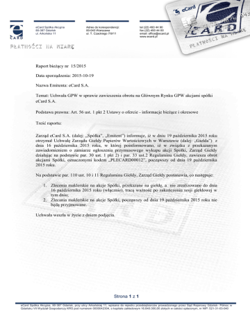 eCard Spółka Akcyjna 80-387 Gdańsk ul. Arkońska 11 Adres do korespondencji: 00-043 Warszawa ul. T. Czackiego 7/9/11 tel (22) 493 44 90 fax (22) 493 44 00 email: [email protected] www.ecard.pl Raport bieżący nr 15/2015 Data sporządzenia: 2015-10-19 Nazwa Emitenta: eCard S.A. Temat: Uchwała GPW w sprawie zawieszenia obrotu na Głównym Rynku GPW akcjami spółki eCard S.A. Podstawa prawna: Art. 56 ust. 1 pkt 2 Ustawy o ofercie - informacje bieżące i okresowe Treść raportu: Zarząd eCard S.A. (dalej: „Spółka”, „Emitent”) informuje, iż w dniu 19 października 2015 roku otrzymał Uchwałę Zarządu Giełdy Papierów Wartościowych w Warszawie (dalej: „Giełda”) z dnia 16 października 2015 roku, w której poinformowano, iż w związku z przekazanym zawiadomieniem o zamiarze ogłoszenia przymusowego wykupu akcji Spółki, Zarząd Giełdy działając na podstawie par. 30 ust. 1 pkt 2) i par. 33 ust.2 Regulaminu Giełdy, zawiesza obrót akcjami Spółki, oznaczonymi kodem „PLECARD00012”, począwszy od dnia 19 października 2015 roku. Na podstawie par. 110 ust. 10 i 11 Regulaminu Giełdy, Zarząd Giełdy postanawia, co następuje: 1. Zlecenia maklerskie na akcje Spółki, przekazane na giełdę, a nie zrealizowane do dnia 16 października 2015 roku (włącznie), tracą ważność po zakończeniu sesji giełdowej w tym dniu; 2. Zlecania maklerskie na akcje Spółki, począwszy od dnia 19 października 2015 roku nie będą przyjmowane. Uchwała weszła w życie z dniem podjęcia. Strona 1 z 1 eCard Spółka Akcyjna, 80-387 Gdańsk, przy ulicy Arkońskiej 11, wpisana do rejestru przedsiębiorców prowadzonego przez Sąd Rejonowy Gdańsk- Północ w Gdańsku VII Wydział Gospodarczy KRS pod numerem 0000042304, o kapitale zakładowym 16.840.000,00 złotych w całości opłaconym, nr NIP: 521-31-03-040