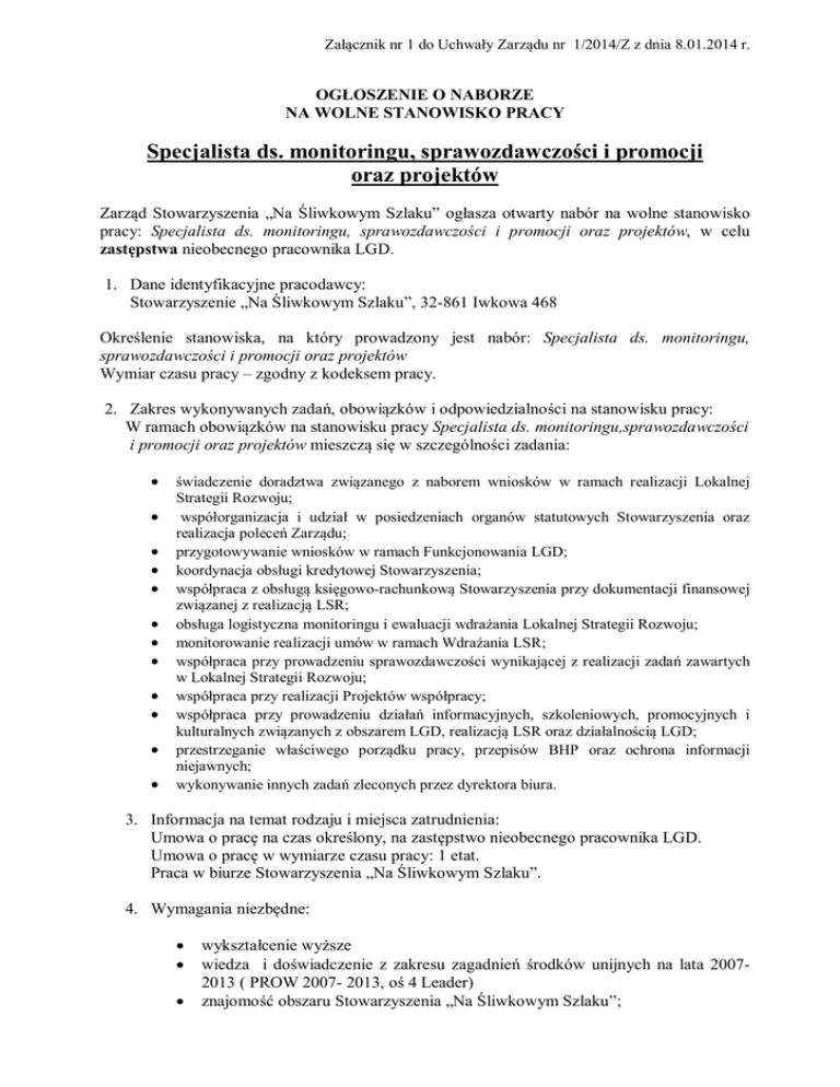 Załącznik nr 1 do Uchwały Zarządu nr 1/2014/Z z dnia 8.01.2014 r. OGŁOSZENIE O NABORZE NA WOLNE STANOWISKO PRACY Specjalista ds. monitoringu, sprawozdawczości i promocji oraz projektów Zarząd Stowarzyszenia „Na Śliwkowym Szlaku” ogłasza otwarty nabór na wolne stanowisko pracy: Specjalista ds. monitoringu, sprawozdawczości i promocji oraz projektów, w celu zastępstwa nieobecnego pracownika LGD. 1. Dane identyfikacyjne pracodawcy: Stowarzyszenie „Na Śliwkowym Szlaku”, 32-861 Iwkowa 468 Określenie stanowiska, na który prowadzony jest nabór: Specjalista ds. monitoringu, sprawozdawczości i promocji oraz projektów Wymiar czasu pracy – zgodny z kodeksem pracy. 2. Zakres wykonywanych zadań, obowiązków i odpowiedzialności na stanowisku pracy: W ramach obowiązków na stanowisku pracy Specjalista ds. monitoringu,sprawozdawczości i promocji oraz projektów mieszczą się w szczególności zadania: świadczenie doradztwa związanego z naborem wniosków w ramach realizacji Lokalnej Strategii Rozwoju; współorganizacja i udział w posiedzeniach organów statutowych Stowarzyszenia oraz realizacja poleceń Zarządu; przygotowywanie wniosków w ramach Funkcjonowania LGD; koordynacja obsługi kredytowej Stowarzyszenia; współpraca z obsługą księgowo-rachunkową Stowarzyszenia przy dokumentacji finansowej związanej z realizacją LSR; obsługa logistyczna monitoringu i ewaluacji wdrażania Lokalnej Strategii Rozwoju; monitorowanie realizacji umów w ramach Wdrażania LSR; współpraca przy prowadzeniu sprawozdawczości wynikającej z realizacji zadań zawartych w Lokalnej Strategii Rozwoju; współpraca przy realizacji Projektów współpracy; współpraca przy prowadzeniu działań informacyjnych, szkoleniowych, promocyjnych i kulturalnych związanych z obszarem LGD, realizacją LSR oraz działalnością LGD; przestrzeganie właściwego porządku pracy, przepisów BHP oraz ochrona informacji niejawnych; wykonywanie innych zadań zleconych przez dyrektora biura. 3. Informacja na temat rodzaju i miejsca zatrudnienia: Umowa o pracę na czas określony, na zastępstwo nieobecnego pracownika LGD. Umowa o pracę w wymiarze czasu pracy: 1 etat. Praca w biurze Stowarzyszenia „Na Śliwkowym Szlaku”. 4. Wymagania niezbędne: wykształcenie wyższe wiedza i doświadczenie z zakresu zagadnień środków unijnych na lata 20072013 ( PROW 2007- 2013, oś 4 Leader) znajomość obszaru Stowarzyszenia „Na Śliwkowym Szlaku”; umiejętność pracy metodą projektu umiejętność obsługi komputera, w tym pakiet MS Office; prawo jazdy kat. B oraz możliwość korzystania z samochodu prywatnego do celów służbowych. 5. Wymagania dodatkowe (pożądane): doświadczenie w pracy w organizacjach pozarządowych znajomość języków obcych; cechy osobowe: dyspozycyjność, sumienność, kreatywność, umiejętność pracy w zespole. 6. Wymagane dokumenty: list motywacyjny lub inna pisemna forma zgłoszenia udziału w naborze, CV z opisem przebiegu pracy zawodowej oraz doświadczenia zawodowego, kopia dowodu osobistego; kopie dokumentów poświadczających wykształcenie, ukończenie dodatkowych kursów, szkoleń, posiadanie kwalifikacji i uprawnień, znajomość języków obcych; wypełniony kwestionariusz osobowy dla osób ubiegających się o zatrudnienie oświadczenie o wyrażeniu zgody na przetwarzanie danych osobowych zawartych w dokumentach składanych w związku z naborem dla potrzeb niezbędnych do realizacji procesu rekrutacji zgodnie z ustawą z dnia 29 sierpnia 1997r. o ochronie danych osobowych (Dz. U. z 2002r Nr 101 poz.926 z późn. zm.) Dokumenty określone w powyższych podpunktach dla ich ważności muszą być opatrzone datą sporządzenia i podpisane. 7. Termin, miejsce i forma składania dokumentów oraz warunki skuteczności terminowego doręczenia dokumentów: Dokumenty aplikacyjne należy złożyć w formie pisemnej, osobiście w biurze Stowarzyszenia „Na Śliwkowym Szlaku”, 32-861 Iwkowa 468 lub za pośrednictwem poczty na adres: Stowarzyszenie „Na Śliwkowym Szlaku”, 32-861 Iwkowa 468 w terminie do dnia 23.01.2014 r. do godz. 16.00. Uwaga! W przypadku przesłania dokumentów pocztą tradycyjną liczy się data wpływu pisma do biura w Iwkowej. Dokumenty aplikacyjne należy dostarczyć w zaklejonej kopercie z widocznym dopiskiem na kopercie: „Praca w LGD”. Dokumenty aplikacyjne, które wpłyną do Biura Stowarzyszenia po wyżej określonym terminie, w inny sposób niż określony w ogłoszeniu, bez kompletu wymaganych dokumentów, bez wymaganych podpisów nie będą rozpatrywane. 8. Etapy rekrutacji i sposób powiadamiania kandydatów: analiza złożonych dokumentów, rozmowa kwalifikacyjna - kandydaci do pracy spełniający wymagania formalne określone w ogłoszeniu o naborze, poinformowani zostaną telefonicznie o miejscu i terminie rozmowy kwalifikacyjnej, telefoniczna informacja o przyjęciu kandydata do pracy. 9. Osoby biorące udział w naborze, przez fakt złożenia dokumentów aplikacyjnych, wyrażają zgodę na poddanie się procedurze naboru na podanych zasadach. Data ogłoszenia: Iwkowa, dn.9.01.2014 r.