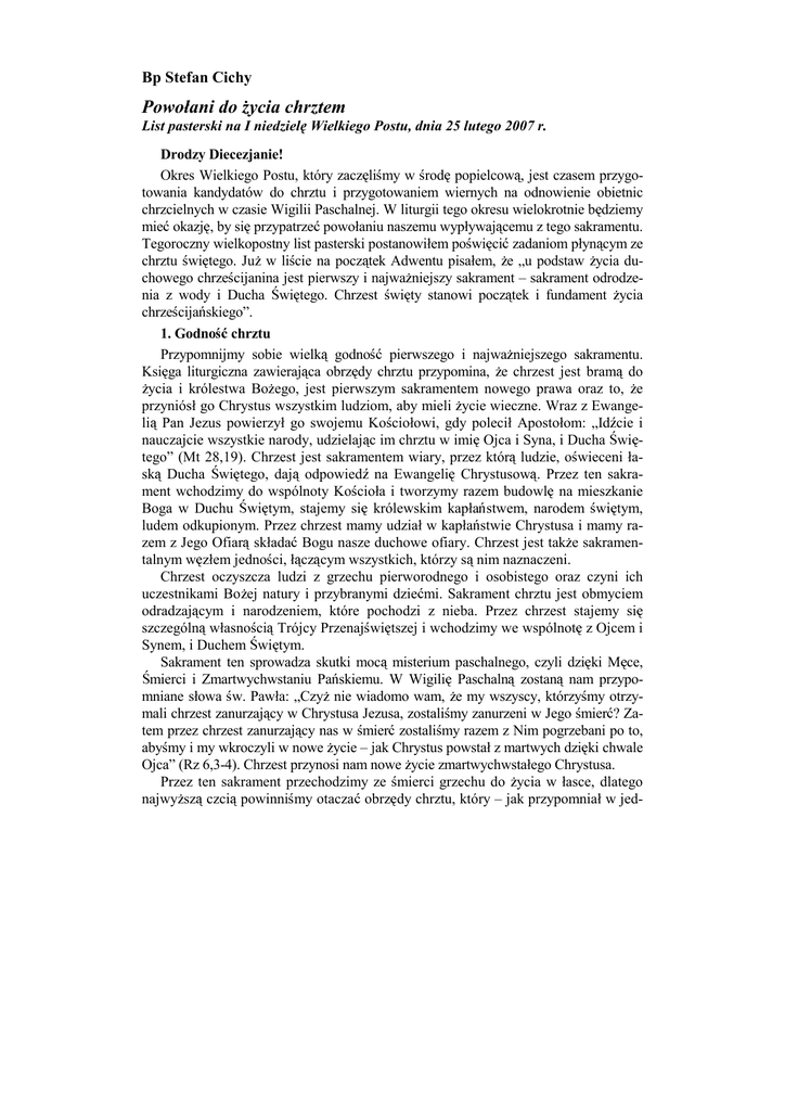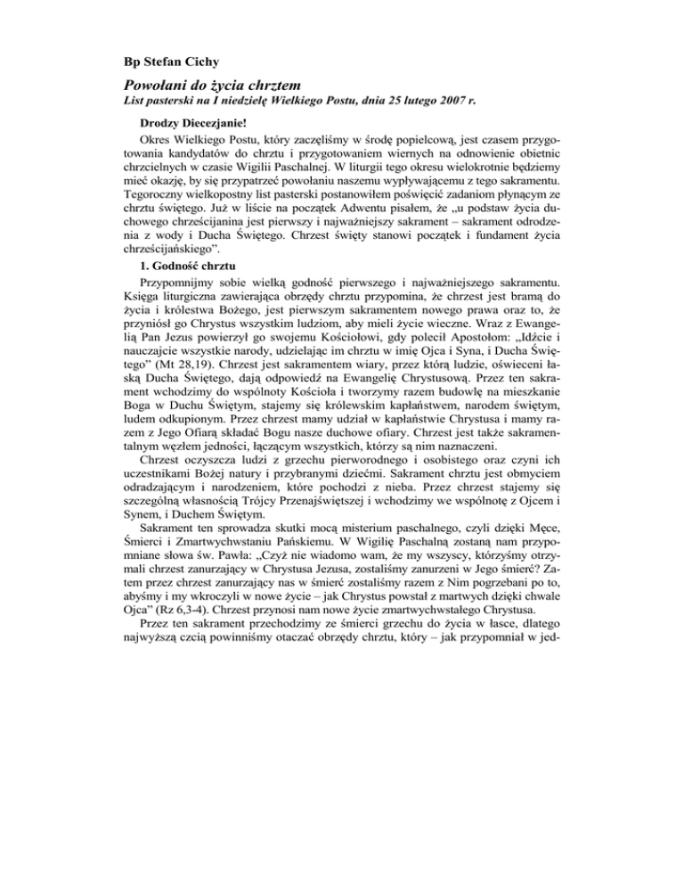 Bp Stefan Cichy Powołani do życia chrztem List pasterski na I niedzielę Wielkiego Postu, dnia 25 lutego 2007 r. Drodzy Diecezjanie! Okres Wielkiego Postu, który zaczęliśmy w środę popielcową, jest czasem przygotowania kandydatów do chrztu i przygotowaniem wiernych na odnowienie obietnic chrzcielnych w czasie Wigilii Paschalnej. W liturgii tego okresu wielokrotnie będziemy mieć okazję, by się przypatrzeć powołaniu naszemu wypływającemu z tego sakramentu. Tegoroczny wielkopostny list pasterski postanowiłem poświęcić zadaniom płynącym ze chrztu świętego. Już w liście na początek Adwentu pisałem, że „u podstaw życia duchowego chrześcijanina jest pierwszy i najważniejszy sakrament – sakrament odrodzenia z wody i Ducha Świętego. Chrzest święty stanowi początek i fundament życia chrześcijańskiego”. 1. Godność chrztu Przypomnijmy sobie wielką godność pierwszego i najważniejszego sakramentu. Księga liturgiczna zawierająca obrzędy chrztu przypomina, że chrzest jest bramą do życia i królestwa Bożego, jest pierwszym sakramentem nowego prawa oraz to, że przyniósł go Chrystus wszystkim ludziom, aby mieli życie wieczne. Wraz z Ewangelią Pan Jezus powierzył go swojemu Kościołowi, gdy polecił Apostołom: „Idźcie i nauczajcie wszystkie narody, udzielając im chrztu w imię Ojca i Syna, i Ducha Świętego” (Mt 28,19). Chrzest jest sakramentem wiary, przez którą ludzie, oświeceni łaską Ducha Świętego, dają odpowiedź na Ewangelię Chrystusową. Przez ten sakrament wchodzimy do wspólnoty Kościoła i tworzymy razem budowlę na mieszkanie Boga w Duchu Świętym, stajemy się królewskim kapłaństwem, narodem świętym, ludem odkupionym. Przez chrzest mamy udział w kapłaństwie Chrystusa i mamy razem z Jego Ofiarą składać Bogu nasze duchowe ofiary. Chrzest jest także sakramentalnym węzłem jedności, łączącym wszystkich, którzy są nim naznaczeni. Chrzest oczyszcza ludzi z grzechu pierworodnego i osobistego oraz czyni ich uczestnikami Bożej natury i przybranymi dziećmi. Sakrament chrztu jest obmyciem odradzającym i narodzeniem, które pochodzi z nieba. Przez chrzest stajemy się szczególną własnością Trójcy Przenajświętszej i wchodzimy we wspólnotę z Ojcem i Synem, i Duchem Świętym. Sakrament ten sprowadza skutki mocą misterium paschalnego, czyli dzięki Męce, Śmierci i Zmartwychwstaniu Pańskiemu. W Wigilię Paschalną zostaną nam przypomniane słowa św. Pawła: „Czyż nie wiadomo wam, że my wszyscy, którzyśmy otrzymali chrzest zanurzający w Chrystusa Jezusa, zostaliśmy zanurzeni w Jego śmierć? Zatem przez chrzest zanurzający nas w śmierć zostaliśmy razem z Nim pogrzebani po to, abyśmy i my wkroczyli w nowe życie – jak Chrystus powstał z martwych dzięki chwale Ojca” (Rz 6,3-4). Chrzest przynosi nam nowe życie zmartwychwstałego Chrystusa. Przez ten sakrament przechodzimy ze śmierci grzechu do życia w łasce, dlatego najwyższą czcią powinniśmy otaczać obrzędy chrztu, który – jak przypomniał w jed- Powołani do życia chrztem 31 nym z przemówień Sługa Boży Jan Paweł II – jest darem i tajemnicą! Papież ten stwierdził, że „sprawowanie sakramentu chrztu jest dla nas wszystkich wezwaniem do powrotu do korzeni chrześcijańskiego powołania. Wszelkie dobro, jakiego dokonujemy z Bożą pomocą, oparte jest bowiem na fundamencie chrztu, który obdarzając nas łaską, czyni nas dziećmi Bożymi i włącza nas we wspólnotę wierzących” (Przemówienie na Anioł Pański, 9 I 2000). Wszyscy ochrzczeni winni o tym wielkim sakramencie pamiętać, zań dziękować i nim żyć. 2. Pamięć o chrzcie, wdzięczność za łaskę chrztu i życie nim Obchody Tysiąclecia Chrztu Polski w 1966 r. uświadomiły wielu Polakom wartość i znaczenie sakramentu odrodzenia z wody i Ducha Świętego. W niektórych diecezjach śpiewano i śpiewa się pieśń: „Przez chrztu świętego wielki dar, o Chryste, z Twej hojności, swym dzieciom wiary dałeś skarb, nadziei i miłości. Najświętszej Trójcy wieczną cześć pragniemy z serc gorących nieść. Strzec wiary ślubujemy, w niej żyć, umierać chcemy”. Po millennium zdarzało się w parafiach, że wierni świadomi wielkiego daru chrztu świętego zamawiali Msze św. jako podziękowanie za ten dar i łaskę. Sługa Boży Jan Paweł II mówił: „Myśląc o otrzymanym chrzcie, nie możemy nie dziękować Chrystusowi za to, że chciał nas wziąć w posiadanie i uświęcić całe nasze życie. Winniśmy także dziękować Duchowi Świętemu za liczne dary, którymi w chwili chrztu ubogacił nasze życie chrześcijańskie” (Przemówienie na Anioł Pański 7 I 1990). Jan Paweł II przybywając do Wadowic, modlił się przy chrzcielnicy, gdzie przyjął pierwszy i najważniejszy sakrament, dziękując Panu Bogu za łaskę chrztu. Dzień chrztu to najważniejsze wydarzenie w życiu chrześcijanina, to dzień ważniejszy od święceń prezbiteratu czy święceń biskupich, dzień ważniejszy od koronacji królewskiej. Św. Ludwik, król Francji, mawiał, że bardziej od katedry, w której został koronowany na króla, ceni sobie kaplicę pałacową, w której został ochrzczony. W katedrze został tylko królem Francji, a w kaplicy pałacowej – dzieckiem Bożym. Niektórzy wierni przypominają sobie nie tylko miejsce, ale i datę chrztu świętego, by w tym dniu dokonać odnowienia obietnic złożonych na chrzcie świętym i wyrażać Panu Bogu szczególną wdzięczność za ten wielki dar. Wyrazem wdzięczności ma być nie tylko udział we Mszy św. niedzielnej, w czasie której wypełniamy zadania kapłańskiego ludu Bożego, ale całe życie chrześcijańskie. Ze chrztu wypływa powołanie do świętości życia. Papież Jan Paweł II w liście na początek nowego tysiąclecia pisał: „podporządkowanie programu duszpasterskiego nadrzędnej idei świętości to decyzja brzemienna w skutki. Wyraża ona przekonani