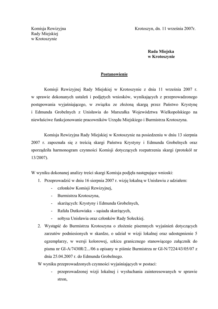 Komisja Rewizyjna Rady Miejskiej w Krotoszynie Krotoszyn, dn. 11 września 2007r. Rada Miejska w Krotoszynie Postanowienie Komisji Rewizyjnej Rady Miejskiej w Krotoszynie z dnia 11 września 2007 r. w sprawie dokonanych ustaleń i podjętych wniosków, wynikających z przeprowadzonego postępowania wyjaśniającego, w związku ze złożoną skargą przez Państwo Krystynę i Edmunda Grobelnych z Unisławia do Marszałka Województwa Wielkopolskiego na niewłaściwe funkcjonowanie pracowników Urzędu Miejskiego i Burmistrza Krotoszyna. Komisja Rewizyjna Rady Miejskiej w Krotoszynie na posiedzeniu w dniu 13 sierpnia 2007 r. zapoznała się z treścią skargi Państwa Krystyny i Edmunda Grobelnych oraz sporządziła harmonogram czynności Komisji dotyczących rozpatrzenia skargi (protokół nr 13/2007). W wyniku dokonanej analizy treści skargi Komisja podjęła następujące wnioski: 1. Przeprowadzić w dniu 16 sierpnia 2007 r. wizję lokalną w Unisławiu z udziałem: - członków Komisji Rewizyjnej, - Burmistrza Krotoszyna, - skarżących: Krystyny i Edmunda Grobelnych, - Rafała Dutkowiaka - sąsiada skarżących, - sołtysa Unisławia oraz członków Rady Sołeckiej. 2. Wystąpić do Burmistrza Krotoszyna o złożenie pisemnych wyjaśnień dotyczących zarzutów podniesionych w skardze, o udział w wizji lokalnej oraz udostępnienie 5 egzemplarzy, w wersji kolorowej, szkicu granicznego stanowiącego załącznik do pisma nr GI-A/7430R/2.../06 a opisany w piśmie Burmistrza nr GI-N/7224/43/05/07 z dnia 25.04.2007 r. do Edmunda Grobelnego. W wyniku przeprowadzonych czynności wyjaśniających w postaci: - przeprowadzonej wizji lokalnej i wysłuchania zainteresowanych w sprawie stron, - wnikliwej analizy zebranej obszernej dokumentacji, - zapoznania się z pisemnymi i ustnymi wyjaśnieniami Zastępcy Burmistrza Franciszka Marszałka. Komisja Rewizyjna Rady Miejskiej w Krotoszynie podjęła następujące ustalenia: 1. Będąca przedmiotem skargi działka nr 78 we wsi Unisław i jej granice zostały ustalone protokołem granicznym w dniu 10.11.2006 r. na podstawie: - szkiców kastralnych z lat 1899/1900 i z 1936 roku, - szkicu reambulacyjnego z 1957 roku, - pierworysu ewidencyjnego Unisławia - karta 1, - mapy ewidencyjnej Unisław - arkusz 1, - szkicu polowego nr 4 z 1982 roku, - szkicu polowego nr 7 z 1980 roku. 2. Protokół wymieniony w pkt 1 został podpisany przez : Krystynę i Edmunda Grobelnych oraz Rafała i Marlenę Dutkowiaków uznając, że ustalone granice uznają za obowiązujące i nie zgłaszają zastrzeżeń do ich przebiegu. 3. W związku z powyższym Burmistrz Krotoszyna w dniu 6.12.2006 r. wydał stosowną decyzję zatwierdzając ustalone protokołem granicznym granice nieruchomości zapisanej w KW 29543 położonej w Unisławiu, oznaczonej w ewidencji gruntów jako działka nr 78, stanowiącej własność Miasta i Gminy Krotoszyn, którą potwierdził Wojewoda Wielkopolski swoją decyzją nr GN.Ka7710-57/01 z dnia 10.07.2001 r. Decyzja ta nie została zakwestionowana przez Państwa Krystynę i Edmunda Grobelnych. 4. Państwo Krystyna i Edmund Grobelni wyrażali chęć zakupu przedmiotowej działki, na co nie wyraziła zgody Rada Sołecka, która również nie wyraziła zgody na jej wydzierżawienie Państwu Grobelnym. Rada Sołecka uznała, że na tym gruncie zostanie usytuowany plac zabaw, a w przyszłości zostanie wybudowana świetlica wiejska. 5. Przedstawione przez Państwa Krystynę i Edmunda Grobelnych różnorodne dokumenty w postaci Aktu Notarialnego z 11.11.1985 roku i różnych map oraz szkiców geodezyjnych nie dają podstaw do tego, by będąca przedmiotem sporu działka nr 78 była kiedykolwiek własnością zainteresowanych. 6. Przebieg wizji lokalnej w Unisławiu w dniu 16 sierpnia 2007 r. i odnotowane tam wypowiedzi skarżących, jak i innych biorących udział w wizji lokalnej, pozwalają na stwierdzenie, że uznawanie przez skarżących działki nr 78 za swoją wielopokoleniową własność należy uznać za domniemanie w dobrej wierze. Komisja Rewizyjna Rady Miejskiej w Krotoszynie, mając na uwadze zebraną dokumentację źródłową, złożone wyjaśnienia ustne i na piśmie oraz powyższe ustalenia postanowiła skargę Państwa Krystyny i Edmunda Grobelnych z Unisławia, skierowaną do Marszałka Województwa Wielkopolskiego, na niewłaściwe funkcjonowanie pracowników Urzędu Miejskiego i Burmistrza Krotoszyna uznać za bezzasadną Komisja Rewizyjna w pełnym 5 osobowym składzie powyższe postanowienie podjęła przy 5 głosach „za”.