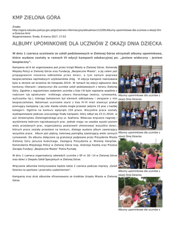 KMP ZIELONA GÓRA Źródło: http://zgora.lubuska.policja.gov.pl/go2/serwis-informacyjny/aktualnosci/12209,Albumy-upominkowe-dla-uczniow-z-okazji-Dni a-Dziecka.html Wygenerowano: Środa, 8 marca 2017, 17:53 ALBUMY UPOMINKOWE DLA UCZNIÓW Z OKAZJI DNIA DZIECKA W dniu 1 czerwca uczniowie ze szkół podstawowych w Zielonej Górze otrzymali albumy upominkowe, które wydane zostały w ramach VI edycji kampanii edukacyjnej pn. „Jestem widoczny – Jestem bezpieczny”. Kampania od 6 lat organizowana jest przez Urząd Miasta w Zielonej Górze, Komendę Miejską Policji w Zielonej Górze oraz Fundację „Bezpieczne Miasto”, a jej celem jest propagowanie noszenia odblasków przez dzieci, a tym samym poprawa bezpieczeństwa najmłodszych użytkowników dróg. VI edycja kampanii realizowana była w okresie od września do listopada 2014r. W ramach tej edycji ogłoszono dwa konkursy (literacki i plastyczny) dla uczniów szkół podstawowych z terenu Zielonej Góry. Zgodnie z regulaminem zadaniem uczniów z klas I-III było napisanie wspólnie z rodzicem lub opiekunem krótkiego utworu literackiego (wiersz, rymowanka, Albumy upominkowe dla uczniów z wyliczanka itp.), którego bohaterem był element odblaskowy i związane z nim okazji Dnia Dziecka bezpieczeństwo. Natomiast uczniowie starsi z klas IV-VI mieli stworzyć plakat promujący kampanię i jej cele. Każda szkoła mogła przesłać jedynie 15 prac z każdej kategorii. Ogólnie na konkurs wpłynęło 234 prace. Wszystkie prace zostały wyeksponowane podczas uroczystego finału kampanii, który odbył się 23.11.2014r. w auli Uniwersytetu Zielonogórskiego przy ul. Szafrana. Wówczas wręczono nagrody i wyróżnienia twórcom najciekawszych prac. Jednak mając na uwadze wysoki poziom wielu przesłanych prac, organizatorzy postanowili uhonorować wszystkie dzieci, których prace zostały przesłane na konkurs, dlatego wydano album zawierający wszystkie prace. Album jest piękną, kolorową pamiątką zawierającą wiele cennych Albumy upominkowe dla uczniów z rymowanek. Do albumu dołączone są gratulacje podpisane przez Prezydenta Miasta okazji Dnia Dziecka Zielonej Góry Janusza Kubickiego, Zastępcę Prezydenta p. Wioletę Haręźlak, Komendanta Miejskiego Policji w Zielonej Górze insp. Andrzeja Kostkę oraz Prezesa Zarządu Fundacji „Bezpieczne Miasto” Piotra Puchałę. W dniu 1 czerwca organizatorzy odwiedzili uczniów z SP nr 18 i 14 w Zielonej Górze oraz dzieci z Zespołu Szkół Specjalnych w Zielonej Górze. Wręczanie albumów kontynuowane będzie także 2 czerwca podczas imprezy „Dzień Dziecka na sportowo i przeciwko uzależnieniom”. Kampanię oraz druk albumów sfinansowano ze środków Urzędu Miasta w Zielonej Albumy upominkowe dla uczniów z okazji Dnia Dziecka Górze. Albumy upominkowe dla uczniów z okazji Dnia Dziecka Albumy upominkowe dla uczniów z okazji Dnia Dziecka Albumy upominkowe dla uczniów z okazji Dnia Dziecka Ocena: 0/5 (0) Tweetnij
