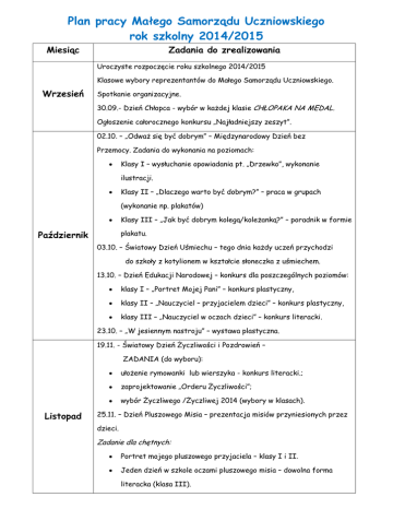 Plan pracy Małego Samorządu Uczniowskiego rok szkolny 2014/2015 Miesiąc Zadania do zrealizowania Uroczyste rozpoczęcie roku szkolnego 2014/2015 Klasowe wybory reprezentantów do Małego Samorządu Uczniowskiego. Wrzesień Spotkanie organizacyjne. 30.09.- Dzień Chłopca - wybór w każdej klasie CHŁOPAKA NA MEDAL. Ogłoszenie całorocznego konkursu „Najładniejszy zeszyt”. 02.10. – „Odważ się być dobrym” – Międzynarodowy Dzień bez Przemocy. Zadania do wykonania na poziomach: Klasy I – wysłuchanie opowiadania pt. „Drzewko”, wykonanie ilustracji. Klasy II – „Dlaczego warto być dobrym?” – praca w grupach (wykonanie np. plakatów) Klasy III – „Jak być dobrym kolegą/koleżanką?” – poradnik w formie plakatu. Październik 03.10. – Światowy Dzień Uśmiechu – tego dnia każdy uczeń przychodzi do szkoły z kotylionem w kształcie słoneczka z uśmiechem. 13.10. – Dzień Edukacji Narodowej – konkurs dla poszczególnych poziomów: klasy I – „Portret Mojej Pani” – konkurs plastyczny, klasy II – „Nauczyciel – przyjacielem dzieci” – konkurs plastyczny, klasy III – „Nauczyciel w oczach dzieci” – konkurs literacki. 23.10. – „W jesiennym nastroju” – wystawa plastyczna. 19.11. - Światowy Dzień Życzliwości i Pozdrowień – ZADANIA (do wyboru): ułożenie rymowanki lub wierszyka - konkurs literacki.; zaprojektowanie „Orderu Życzliwości”; wybór Życzliwego /Życzliwej 2014 (wybory w klasach). Listopad 25.11. – Dzień Pluszowego Misia – prezentacja misiów przyniesionych przez dzieci. Zadanie dla chętnych: Portret mojego pluszowego przyjaciela – klasy I i II. Jeden dzień w szkole oczami pluszowego misia – dowolna forma literacka (klasa III). 05.12. – Wszyscy czekamy na Mikołaja– mikołajki (przynosimy mikołajkowe czapki). 05.12. - „Okaż serce” – Międzynarodowy Dzień Wolontariusza – współpraca Grudzień z Samorządem Uczniowskim klas IV – VI. 05.12 – 12.12. -Dar serca - Przeprowadzenie zbiórki słodyczy dla dzieci z rodzin znajdujących się w trudnej sytuacji materialnej. 16.12. – „Zimowo i świątecznie…” – wystawa plastyczna. 09.01. – Bale w karnawale – bale w klasach I – III. 19.01. - WOŚP – współpraca z Samorządem Uczniowskim klas IV – VI- Styczeń przeprowadzenie kwesty w klasach I – III. 21 – 22.01. – Dzień Babci i Dziadka – wystawa prac plastyczno – literackich. 11.02. - Święto Patrona: „Obrazki z życia mojej szkoły”– wystawa prac plastycznych. „Kolorowo we Wszechświecie” – przebieramy się za mieszkańców kosmosu. 12.02 - „ Dzień rozkoszy dla podniebienia”- tłusty czwartek. Luty 12.02. - ZIMOWO I BEZPIECZNIE- wydanie ulotek promujących zdrowe i bezpieczne ferie zimowe. 13.02. – „Gorące serduszka” – walentynki: poczta walentynkowa oglądanie bajki walentynkowa kartka – wystawa prac plastycznych. 06.03.–Dzień Kobiet – wybór w każdej klasie DZIEWCZYNY NA MEDAL. 20.03. – Pierwszy dzień wiosny – Graj w zielone(przebieranki). Marzec „Las i jego skarby” – międzyszkolny konkurs przyrodniczy dla klas II. 23.03. – „Wiosennie i świątecznie …” - wystawa prac plastycznych. 16.04. – II Szkolny konkurs matematyczny „Matematyczne potyczki” Kwiecień (z podziałem na poziomy). 25.04. – Międzynarodowy Dzień Ziemi – konkurs plastyczny współudział w realizacji programu „Nie pal przymnie, proszę”). 19.05. – Dzień Dobrych Uczynków 22.05. – Dzień Praw Zwierząt – akcja charytatywna pt. „Pomóż, przytul, pokochaj” - współpraca z Samorządem Uczniowskim klas IV – Maj VI- zbiórka w klasach I –III różnych artykułów dla zwierząt przebywających w schronisku. „My i nasi mali przyjaciele” – plakaty. 26.05. – Dzień Matki – Najpiękniejsze życzenia i laurki dla mojej Mamy. 01.06. – Międzynarodowy Dzień Dziecka– imprezy organizowane przez wychowawców. 09.06. – Dzień Przyjaciela– prezentacja przyjaciół (zdjęcia, prace plastyczno – literackie). 23.06. – Dzień Ojca – Najpiękniejsze życzenia i laurki dla mojego Taty. Czerwiec 24.06. - „Orły są wśród nas” – prezentacja osiągnięć uczniów klas I – III. Finał konkursu „Najładniejszy zeszyt”. 25.06. –WAKACYJNIE I BEZPIECZNIE – wydanie ulotek promujących zdrowy i bezpieczny wypoczynek. Podsumowanie działalności Małego Samorządu Uczniowskiego. Konkurs dla uczniów klas I – III – „Najładniejszy zeszyt” (rozstrzygnięcie czerwiec 2015r.) Współpraca z Samorządem Uczniowskim klas IV – VI. Cały rok Współpraca z redakcją gazetki szkolnej. Prowadzenie gabloty ściennej oraz zamieszczanie informacji na stronie internetowej szkoły. Opiekunowie: Katarzyna Fijałkowska Irena Rogaczewska