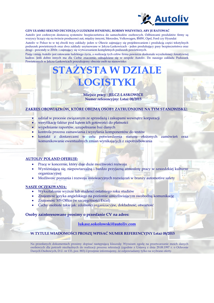 GDY UŁAMKI SEKUND DECYDUJĄ O LUDZKIM ISTNIENIU, ROBIMY WSZYSTKO, ABY JE RATOWAĆ Autoliv jest czołowym dostawcą systemów bezpieczeństwa do samochodów osobowych. Odbiorcami produktów firmy są wszyscy liczący się na świecie producenci aut, między innymi, Mercedes, Volkswagen, BMW, Opel, Ford czy Hyundai Autoliv w Polsce to w tej chwili trzy zakłady: jeden w Oławie zajmujący się projektowaniem i produkcją części tekstylnych poduszek powietrznych oraz dwa zakłady usytuowane w Jelczu-Laskowicach - jeden produkujący pasy bezpieczeństwa oraz drugi - powstały w 2010r. i zajmujący się wytwarzaniem kompletnych poduszek powietrznych. Pasją i misją Autoliv jest ratowanie ludzkiego życia, a realizację tych celów firma powierza doskonale wyszkolonej i kreatywnej kadrze. Jeśli dobro innych ma dla Ciebie znaczenie, odnajdziesz się w zespole Autoliv. Do naszego zakładu Poduszek Powietrznych w Jelczu-Laskowicach poszukujemy obecnie osób na stanowisko: STAŻYSTA W DZIALE LOGISTYKI Miejsce pracy : JELCZ-LASKOWICE Numer referencyjny: Lstaż 08/2015 ZAKRES OBOWIĄZKÓW, KTÓRE OBEJMĄ OSOBY ZATRUDNIONE NA TYM STANOWISKU: udział w procesie związanym ze sprzedażą i zakupami wewnątrz korporacji weryfikację faktur pod kątem ich gotowości do płatności wypełnianie raportów, uzupełnianie baz danych kontrola procesu zamawiania i wysyłania komponentów do testów kontakt z dostawcami w celu potwierdzenia statusu złożonych zamówień komunikowanie ewentualnych zmian wynikających z zapotrzebowania oraz AUTOLIV POLAND OFERUJE: Pracę w koncernie, który daje duże możliwości rozwoju Wyróżniającą się, niepowtarzalną i bardzo przyjazną atmosferę pracy w szwedzkiej kulturze organizacyjnej Możliwość poznania i rozwoju innowacyjnych rozwiązań w branży automotive safety NASZE OCZEKIWANIA: Wykształcenie wyższe lub studenci ostatniego roku studiów Znajomość języka angielskiego na poziomie umożliwiającym swobodną komunikację Znajomość MS Office (w szczególności Excel) Cechy osobiste takie jak: zdolności organizacyjne, dokładność, otwartość Osoby zainteresowane prosimy o przesłanie CV na adres: [email protected] W TYTULE WIADOMOŚCI PROSZĘ WPISAĆ NUMER REFERENCYJNY Lstaż 08/2015 Na przesłanych dokumentach prosimy dopisać następującą klauzulę: Wyrażam zgodę na przetwarzanie moich danych osobowych dla potrzeb niezbędnych do realizacji procesu rekrutacji (zgodnie z Ustawą z dnia 29.08.1997 r. o Ochronie Danych Osobowych, D.U. nr 133, poz. 883).Uprzejmie informujemy, że odpowiadamy tylko na wybrane oferty.