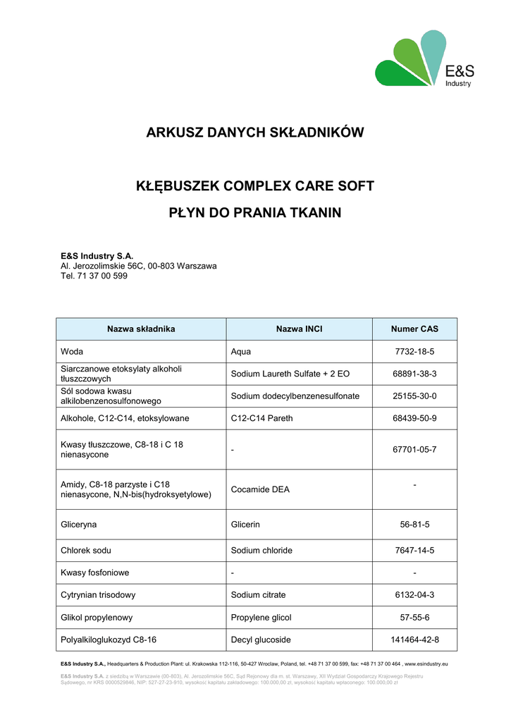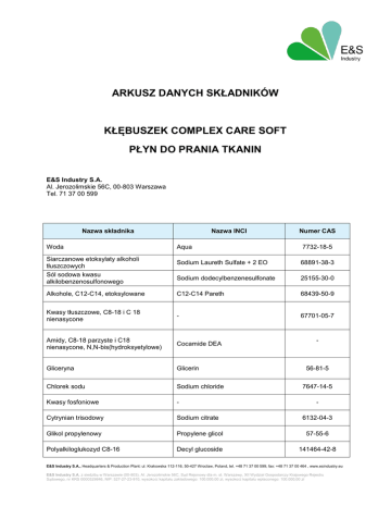 ARKUSZ DANYCH SKŁADNIKÓW KŁĘBUSZEK COMPLEX CARE SOFT PŁYN DO PRANIA TKANIN E&S Industry S.A. Al. Jerozolimskie 56C, 00-803 Warszawa Tel. 71 37 00 599 Nazwa składnika Woda Nazwa INCI Numer CAS Aqua 7732-18-5 Sodium Laureth Sulfate + 2 EO 68891-38-3 Sodium dodecylbenzenesulfonate 25155-30-0 Alkohole, C12-C14, etoksylowane C12-C14 Pareth 68439-50-9 Kwasy tłuszczowe, C8-18 i C 18 nienasycone - 67701-05-7 Amidy, C8-18 parzyste i C18 nienasycone, N,N-bis(hydroksyetylowe) Cocamide DEA Gliceryna Glicerin Chlorek sodu Sodium chloride Kwasy fosfoniowe - Cytrynian trisodowy Sodium citrate Glikol propylenowy Propylene glicol 57-55-6 Polyalkiloglukozyd C8-16 Decyl glucoside 141464-42-8 Siarczanowe etoksylaty alkoholi tłuszczowych Sól sodowa kwasu alkilobenzenosulfonowego - 56-81-5 7647-14-5 6132-04-3 E&S Industry S.A., Headquarters & Production Plant: ul. Krakowska 112-116, 50-427 Wroclaw, Poland, tel. +48 71 37 00 599, fax: +48 71 37 00 464 , www.esindustry.eu E&S Industry S.A. z siedzibą w Warszawie (00-803), Al. Jerozolimskie 56C, Sąd Rejonowy dla m. st. Warszawy, XII Wydział Gospodarczy Krajowego Rejestru Sądowego, nr KRS 0000529846, NIP: 527-27-23-910, wysokość kapitału zakładowego: 100.000,00 zł, wysokość kapitału wpłaconego: 100.000,00 zł Barwnik Colorant - Kompozycja zapachowa (Butylhnenyl Methylpropional, Hexyl Cinnamal) Parfum (Butylhnenyl Methylpropional, Hexyl Cinnamal) - Lanolina etoksylowana, wodny roztwór PEG-75 Lanolin - Wyciąg z aloesu Aloe Vera 8557-69-03 Celulaza - 9012-54-8 2-metylo-2H-izotiazol-3-onu Methylizothiazolinone 2682-20-4 1,2-benzoizotiazolin-3-on Benzoisothiazolinone 2634-33-5 Tabela korelacji między nazwami INCI, a nazwami Farmakopei Europejskiej i numerami CAS: http://ec.europa.eu/consumers/cosmetics/cosing E&S Industry S.A., Headquarters & Production Plant: ul. Krakowska 112-116, 50-427 Wroclaw, Poland, tel. +48 71 37 00 599, fax: +48 71 37 00 464 , www.esindustry.eu E&S Industry S.A. z siedzibą w Warszawie (00-803), Al. Jerozolimskie 56C, Sąd Rejonowy dla m. st. Warszawy, XII Wydział Gospodarczy Krajowego Rejestru Sądowego, nr KRS 0000529846, NIP: 527-27-23-910, wysokość kapitału zakładowego: 100.000,00 zł, wysokość kapitału wpłaconego: 100.000,00 zł