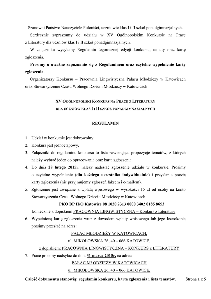 Szanowni Państwo Nauczyciele Poloniści, uczniowie klas I i II szkół ponadgimnazjalnych. Serdecznie zapraszamy do udziału w XV Ogólnopolskim Konkursie na Pracę z Literatury dla uczniów klas I i II szkół ponadgimnazjalnych. W załączniku wysyłamy Regulamin tegorocznej edycji konkursu, tematy oraz kartę zgłoszenia. Prosimy o uważne zapoznanie się z Regulaminem oraz czytelne wypełnienie karty zgłoszenia. Organizatorzy Konkursu – Pracownia Lingwistyczna Pałacu Młodzieży w Katowicach oraz Stowarzyszenie Czasu Wolnego Dzieci i Młodzieży w Katowicach XV OGÓLNOPOLSKI KONKURS NA PRACĘ Z LITERATURY DLA UCZNIÓW KLAS I I II SZKÓŁ PONADGIMNAZJALNYCH REGULAMIN 1. Udział w konkursie jest dobrowolny. 2. Konkurs jest jednoetapowy. 3. Załączniki do regulaminu konkursu to lista zawierająca propozycje tematów, z których należy wybrać jeden do opracowania oraz karta zgłoszenia. 4. Do dnia 28 lutego 2015r. należy nadesłać zgłoszenie udziału w konkursie. Prosimy o czytelne wypełnienie (dla każdego uczestnika indywidualnie) i przysłanie pocztą karty zgłoszenia (nie przyjmujemy zgłoszeń faksem i e-mailem). 5. Zgłoszenie jest związane z wpłatą wpisowego w wysokości 15 zł od osoby na konto Stowarzyszenia Czasu Wolnego Dzieci i Młodzieży w Katowicach PKO BP II/O Katowice 08 1020 2313 0000 3402 0185 8653 koniecznie z dopiskiem PRACOWNIA LINGWISTYCZNA – Konkurs z Literatury 6. Wypełnioną kartę zgłoszenia wraz z dowodem wpłaty wpisowego lub jego kserokopią prosimy przesłać na adres: PAŁAC MŁODZIEŻY W KATOWICACH, ul. MIKOŁOWSKA 26, 40 – 066 KATOWICE, z dopiskiem: PRACOWNIA LINGWISTYCZNA – KONKURS z LITERATURY 7. Prace prosimy nadsyłać do dnia 31 marca 2015r. na adres: PAŁAC MŁODZIEŻY W KATOWICACH ul. MIKOŁOWSKA 26, 40 – 066 KATOWICE, Całość dokumentu stanowią: regulamin konkursu, karta zgłoszenia i lista tematów. Strona 1 z 5 z dopiskiem na kopercie: PRACOWNIA LINGWISTYCZNA – Konkurs z Literatury 8. Wpłata wpisowego pokrywa koszty organizacji konkursu. 9. Wpłata wpisowego warunkuje dopuszczenie nadesłanej pracy do konkursu. 10. Wpłacone wpisowe nie jest zwracane w przypadku rezygnacji z udziału w konkursie. 11. Prace konkursowe powinny być pisane na kartkach A4, każda powinna zostać zapisana wyłącznie z jednej strony, winien zostać zachowany margines 2,5 cm z każdej ze stron. 12. Prace nieopisane imieniem i nazwiskiem uczestnika, klasą oraz adresem szkoły nie zostaną zakwalifikowane do konkursu. 13. Uczestnicy konkursu oraz ich Opiekunowie nie mają możliwości wglądu do złożonych prac. 14. Finał konkursu przewidywany jest w czerwcu 2015r. 15. O dokładnym terminie finału konkursu laureaci konkursu oraz ich opiekunowie zostaną powiadomieni pocztą mailową przesłaną na adres szkoły. 16. Ilość zgłoszeń jest nieograniczona. 17. Prace konkursowe nie są zwracane. 18. Nagrody dla zwycięzców nie będą wysyłane pocztą. 19. Organizatorzy konkursu zastrzegają sobie prawo do wykorzystania fragmentów zgłoszonych prac. 20. Autorzy zgłoszonych prac wyrażają zgodę na nieodpłatne wykorzystanie lub twórcze przetworzenie przez organizatora konkursu całości lub części zgłoszonych przez nich prac. Prosimy o poinformowanie innych zainteresowanych osób. Ewentualne zapytania prosimy kierować na adres: Pałac Młodzieży w Katowicach Pracownia Lingwistyczna tel. 032 25 16 431 wew. 1220 Regulamin, karta uczestnictwa i tematy konkursu również na stronie www.pm.katowice.pl/jpolski Całość dokumentu stanowią: regulamin konkursu, karta zgłoszenia i lista tematów. Strona 2 z 5 XV OGÓLNOPOLSKI KONKURS NA PRACĘ Z LITERATURY DLA UCZNIÓW KLAS I I II SZKÓŁ PONADGIMNAZJALNYCH KARTA ZGŁOSZENIA 1. Imię i nazwisko uczestnika: ________________________________________________________________________ 2. Klasa: ________________________________________________________________________ 3. Adres e-mail uczestnika: ________________________________________________________________________ 4. Wybrany temat: ________________________________________________________________________ ________________________________________________________________________ ________________________________________________________________________ 5. Nazwisko opiekuna: ________________________________________________________________________ 6. Adres e-mail opiekuna: ________________________________________________________________________ Całość dokumentu stanowią: regulamin konkursu, karta zgłoszenia i lista tematów. Strona 3 z 5 7. Nazwa, adres, nr telefonu i e-mail szkoły: ________________________________________________________________________ ________________________________________________________________________ ________________________________________________________________________ Oświadczam, że: 1. Wyrażam zgodę na bezpłatne wykorzystanie i twórcze przetworzenie przez organizatora konkursu całości lub części zgłoszonej pracy. 2. Wyrażam zgodę na przetwarzanie danych osobowych w rozumieniu ustawy z dnia 29 sierpnia 1997r. (Dz. U. z 2002r., Nr 101, poz. 926 z późn. zm.) przez organizatora konkursu w celach związanych z przeprowadzeniem konkursu. 3. Zapoznałem się z Regulaminem XV Ogólnopolskiego Konkursu na Pracę z Literatury dla uczniów klas I i II szkół ponadgimnazjalnych. ………………………………………….. (czytelny podpis Nauczyciela - opiekuna) ………………………………………….. (czytelny podpis Uczestnika) Całość dokumentu stanowią: regulamin konkursu, karta zgłoszenia i lista tematów. Strona 4 z 5 XV OGÓLNOPOLSKI KONKURS NA PRACĘ Z LITERATURY DLA UCZNIÓW KLAS I I II SZKÓŁ PONADGIMNAZJALNYCH LISTA TEMATÓW 1. Książki sprawiają, że opisywane w nich historie i wyrażone opinie stają się twoimi i po skończonej lekturze nie jesteś już tym samym człowiekiem, jakim byłeś, kiedy ją zaczynałeś. […] Nawet to, czego się nie rozumie, utkwi ci w ja