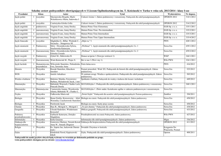 Szkolny zestaw podręczników obowiązujących w I Liceum Ogólnokształcącym im. T. Kościuszki w Turku w roku szk. 2013/2014 - klasy I-sze Przedmiot Język polski Klasa I wszystkie Autor Tytuł Maciejewska Brygida, MachCiekawi świata 1. Zakres podstawowy i rozszerzony. Podręcznik dla szkół ponadgimnazjalnych. Walenkiewicz Marta, Sadowska J. Wydawnictwo OPERON 2012 Nr dopusz. 514/1/2012 Język polski I wszystkie Czartoryska-Górska Lidia Ciekawi świata 2. Zakres podstawowy i rozszerzony. Podręcznik dla szkół ponadgimnazjalnych OPERON 2012 514/2/2012 Język angielski I podstawowy Virginia Evans, Jenny Dooley Matura Prime Time Elementary EGIS Sp. z o. o. 335/1/2011 Język angielski I zaawansowany Virginia Evans, Jenny Dooley Matura Prime Time Pre-intermediate EGIS Sp. z o. o. 335/2/2011 Język angielski I zaawansowany Virginia Evans, Jenny Dooley Matura Prime Time Intermediate EGIS Sp. z o. o. 335/3/2011 Język angielski I zaawansowany Virginia Evans, Jenny Dooley Matura Prime Time Upper Intermediate EGIS Sp. z o. o. 335/4/2012 Język francuski I wszystkie „Déjà-vu.” I PWN 420/1/2012 „Welttour” 1. Język niemiecki dla szkół ponadgimnazjalnych. Cz. 1 Nowa Era 459/1/2012 „Welttour” 1. Język niemiecki dla szkół ponadgimnazjalnych. Cz. 2 Nowa Era 459/2/2012 Język rosyjski Migdalska G., Billar- Woźniak C., Szczucka – Smagowicz M. I Podstawowy Mróz - Dwornikowska Sylwia, Szachowska Katarzyna I Zaawansowany Mróz - Dwornikowska Sylwia, Górecka Urszula I Podstawowy Zybert M., Dabrowska H. Новые встречи 1 (Nowyje wstrieczi 1) WSiP 344/1/2011 Język rosyjski I Zaawansowany Wiatr-Kmieciak M., Wujec S. Вот и мы 1 (Wot i my 1) WSz PWN 324/1/2011 Język łaciński Porta latina nova PWN WOS I Humanistyczne, Wilczyński Stanisław, Pobiedziska przyrodnicze Ewa, Jaworska Anna I Wszystkie Roszak Stanisław, Kłaczkow Jarosław I Wszystkie Janicki Arkadiusz Wiedza o kulturze I Wszystkie Język niemiecki Język niemiecki Historia Poznać przeszłość. Wiek XX. Podręcznik do historii dla szkół ponadgimnazjalnych. Zakres Nowa Era podstawowy. W centrum uwagi. Wiedza o społeczeństwie. Podręcznik dla szkół ponadgimnazjalnych. Zakres Nowa Era podstawowy. Spotkania z kulturą. Podręcznik do wiedzy o kulturze dla liceum i technikum Nowa Era Fizyka Bokiniec Monika, Forysiewicz Barbara, Michałowski Jacek, i inni I Wszystkie Babiański Wojciech, Chańko Lech, MATeMAtyka 1. Podręcznik dla szkół ponadgimnazjalnych. Zakres podstawowy i rozszerzony. Nowa Era Ponczek Dorota I Matematyczne Czarnowska Joanna, Wesołowska MATeMAtyka 1. Zbiór zadań. Kształcenie ogólne w zakresie podstawowym i rozszerzonym. Nowa Era Jolanta, Babiański W., Chańko L. I Wszystkie Fiałkowska Maria red. „Świat fizyki.” Podręcznik dla uczniów szkół ponadgimnazjalnych. Poziom podstawowy. ZamKor Biologia I Wszystkie Biologia Chemia Geografia I Wszystkie I Wszystkie I Wszystkie Matematyka Matematyka 416/2012 525/2012 505/2012 449/2012 360/1/2011 394/2011 Bonar Emilia, Krzeszowiec – Jeleń Biologia na czasie. Podręcznik dla szkół ponadgimazjalnych. Zakres podstawowy Weronika, Czachorowski Stanisław Nowa Era 450/2012 Pawłowski Jacek Biologia na czasie. Karty pracy ucznia Hass R., Mrzigod A., Mrzigod J. „To jest chemia.” Podręcznik dla szkół ponadgimnazjalnych. Zakres podstawowy Uliszak Radosław, Wiedermann Oblicza geografii. Podręcznik dla szkół ponadgimnazjalnych. Zakres podstawowy Krzysztof Podstawy I Wszystkie Garbacik Katarzyna, Zmiejko Przedsiębiorczość na czasie Podręcznik. Zakres podstawowy. przedsiębiorczości Magdalena Informatyka I Wszystkie Koba Grażyna Informatyka dla szkół ponadgimnazjalnych. Zakres podstawowy. Edukacja dla I Wszystkie Goniewicz Mariusz, Nowak-Kowal Edukacja dla bezpieczeństwa Podręcznik dla szkół ponadgimnazjalnych bezpieczeństwa Anna W., Smutek Zbigniew Religia I Wszystkie Ks. Szpeta Jan, Jackowiak Danuta Świadek Chrystusa w kościele. (red.) Etyka I Kłodziński Paweł, Kapiszewski Etyka. Podręcznik dla szkół ponadgimnazjalnych. Zakres podstawowy. Jakub Podręczniki do nauki języków obcych będą wybrane we wrześniu po dokonaniu podziału na grupy. Lista podręczników dostępna jest na stronie: www.liceum.turek.pl Nowa Era Nowa Era Nowa Era 450/2012 438/2012 433/2012 WSz PWN 427/2012 Migra OPERON 2012 536/2012 411/2012 Księgarnia Św. Wojciecha. Poznań Operon 408/2011