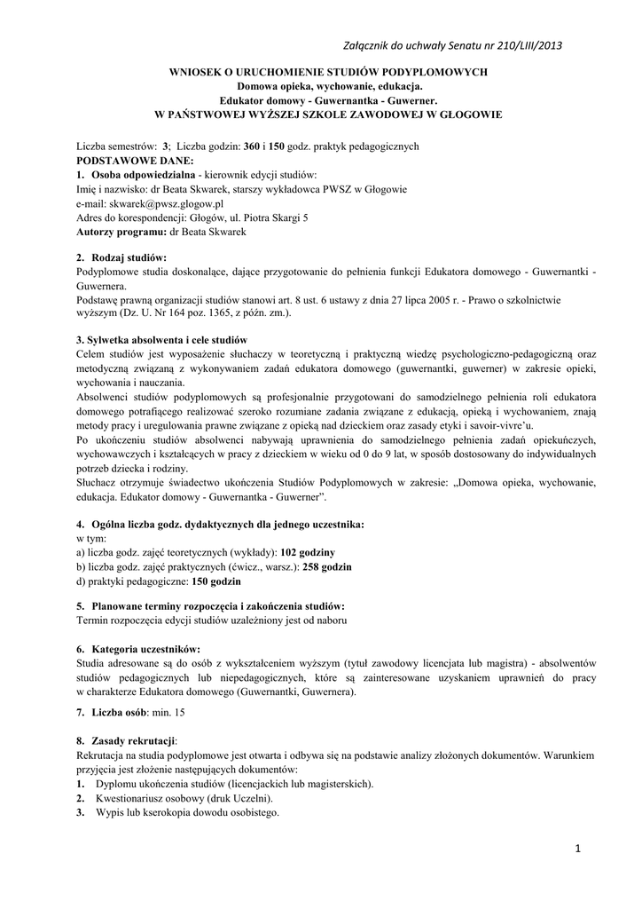 Załącznik do uchwały Senatu nr 210/LIII/2013 WNIOSEK O URUCHOMIENIE STUDIÓW PODYPLOMOWYCH Domowa opieka, wychowanie, edukacja. Edukator domowy - Guwernantka - Guwerner. W PAŃSTWOWEJ WYŻSZEJ SZKOLE ZAWODOWEJ W GŁOGOWIE Liczba semestrów: 3; Liczba godzin: 360 i 150 godz. praktyk pedagogicznych PODSTAWOWE DANE: 1. Osoba odpowiedzialna - kierownik edycji studiów: Imię i nazwisko: dr Beata Skwarek, starszy wykładowca PWSZ w Głogowie e-mail: [email protected] Adres do korespondencji: Głogów, ul. Piotra Skargi 5 Autorzy programu: dr Beata Skwarek 2. Rodzaj studiów: Podyplomowe studia doskonalące, dające przygotowanie do pełnienia funkcji Edukatora domowego - Guwernantki Guwernera. Podstawę prawną organizacji studiów stanowi art. 8 ust. 6 ustawy z dnia 27 lipca 2005 r. - Prawo o szkolnictwie wyższym (Dz. U. Nr 164 poz. 1365, z późn. zm.). 3. Sylwetka absolwenta i cele studiów Celem studiów jest wyposażenie słuchaczy w teoretyczną i praktyczną wiedzę psychologiczno-pedagogiczną oraz metodyczną związaną z wykonywaniem zadań edukatora domowego (guwernantki, guwerner) w zakresie opieki, wychowania i nauczania. Absolwenci studiów podyplomowych są profesjonalnie przygotowani do samodzielnego pełnienia roli edukatora domowego potrafiącego realizować szeroko rozumiane zadania związane z edukacją, opieką i wychowaniem, znają metody pracy i uregulowania prawne związane z opieką nad dzieckiem oraz zasady etyki i savoir-vivre’u. Po ukończeniu studiów absolwenci nabywają uprawnienia do samodzielnego pełnienia zadań opiekuńczych, wychowawczych i kształcących w pracy z dzieckiem w wieku od 0 do 9 lat, w sposób dostosowany do indywidualnych potrzeb dziecka i rodziny. Słuchacz otrzymuje świadectwo ukończenia Studiów Podyplomowych w zakresie: „Domowa opieka, wychowanie, edukacja. Edukator domowy - Guwernantka - Guwerner”. 4. Ogólna liczba godz. dydaktycznych dla jednego uczestnika: w tym: a) liczba godz. zajęć teoretycznych (wykłady): 102 godziny b) liczba godz. zajęć praktycznych (ćwicz., warsz.): 258 godzin d) praktyki pedagogiczne: 150 godzin 5. Planowane terminy rozpoczęcia i zakończenia studiów: Termin rozpoczęcia edycji studiów uzależniony jest od naboru 6. Kategoria uczestników: Studia adresowane są do osób z wykształceniem wyższym (tytuł zawodowy licencjata lub magistra) - absolwentów studiów pedagogicznych lub niepedagogicznych, które są zainteresowane uzyskaniem uprawnień do pracy w charakterze Edukatora domowego (Guwernantki, Guwernera). 7. Liczba osób: min. 15 8. Zasady rekrutacji: Rekrutacja na studia podyplomowe jest otwarta i odbywa się na podstawie analizy złożonych dokumentów. Warunkiem przyjęcia jest złożenie następujących dokumentów: 1. Dyplomu ukończenia studiów (licencjackich lub magisterskich). 2. Kwestionariusz osobowy (druk Uczelni). 3. Wypis lub kserokopia dowodu osobistego. 1 Załącznik do uchwały Senatu nr 210/LIII/2013 9. Forma prowadzenia zajęć: Tok studiów obejmuje 3 semestry, w ramach których realizowane będą zajęcia dydaktyczne o łącznej liczbie 350 godzin prowadzonych w formie wykładów i ćwiczeń. Zajęcia odbywać się będą w trakcie dwudniowych zjazdów (sobota-niedziela) w godzinach od 8.00 do 18.00, organizowanych dwa razy w miesiącu. Uczestnicy będą także zobowiązani do odbycia praktyki pedagogicznej w instytucji (placówce) oświatowej (opiekuńczej) w wymiarze 150 godzin (podczas II i III semestru). Warunkiem ukończenia studiów jest aktywne uczestnictwo w zajęciach, zdanie egzaminów i uzyskanie zaliczeń z oceną z poszczególnych przedmiotów, realizacja praktyk oraz obrona pracy dyplomowej i zaliczenie egzaminu końcowego. 10. Załączniki: 1) plan studiów podyplomowych, 2) szczegółowy program szkolenia, efekty 3) propozycja obsady kadrowej, 4) szczegółowy kosztorys szkolenia, 5) wzór karty przedmiotu 2 Załącznik do uchwały Senatu nr 210/LIII/2013 Załącznik nr 1 PLAN STUDIÓW PODYPLOMOWYCH I semestr Lp. 1. 2. 3. 4. 5. 6. 7. 8. Przedmiot Biomedyczne podstawy rozwoju i wychowania dziecka Psychologia rozwojowa i wychowawcza Profilaktyka zaburzeń rozwojowych, zachowań i uczenia się Komunikacja i współpraca z rodziną i dzieckiem Etyka zawodowa i zasady savoir - vivre Podstawy pedagogiki i diagnozowania pedagogicznego Prawne regulacje funkcji edukatora domowego Podstawy przedsiębiorczości Razem Liczba godzin 16 16 15 15 15 16 7 16 116 w ćw. ECTS 6 6 5 5 5 6 7 6 46 10 10 10 10 10 10 10 70 4 4 3 3 3 4 1 3 25 w ćw. ECTS 8 8 10 8 8 8 50 7 15 10 10 20 10 10 10 5 97 2 3 5 5 5 5 5 5 2 37 w ćw. 6 6 8 15 15 10 10 10 10 8 5 91 Forma zaliczenia Egz. Egz. Zo Zo Zo Egz. Zo Zo II semestr Lp. 1. 2. 3. 4. 5. 6. 7. 8. 9. Przedmiot Seminarium dyplomowe Język obcy Metodyka pracy opiekuńczo-wychowawczej Opieka nad dzieckiem w wieku od 0 do 9 r. ż. Podstawy dydaktyki Metodyka nauczania umiejętności językowych Metodyka nauczania umiejętności matematycznych Metodyka nauczania dziecka języka obcego Prowadzenie praktyk Razem Liczba godzin 7 15 18 18 30 18 18 18 5 147 Forma zaliczenia Zal. Zo Egz. Egz. Egz. Egz. Egz. Egz. Zal. III semestr Lp. 1. 2. 3. 4. 5. 6. 7. 8. 9. Przedmiot Seminarium dyplomowe Język obcy Elementy edukacji plastycznej i technicznej Elementy edukacji muzycznej Organizacja gier i zabaw w różnych grupach wiekowych Gimnastyka korekcyjna Podstawy higieny i racjonalnego żywienia Pierwsza pomoc przedmedyczna Prowadzenie praktyk Razem Liczba godzin 8 15 15 10 10 10 16 8 5 97 ECTS Forma zaliczenia 3 Zal. 3 Egz. 3 Zo 2 Zo 2 Zo 2 Zo 3 Zo 1 Zal. 4 Zo 23 3 Załącznik do uchwały Senatu nr 210/LIII/2013 Załącznik nr 2 SZCZEGÓŁOWY PROGRAM STUDIÓW, EFEKTY Program studiów obejmuje cztery moduły: psychopedagogiczny, metodyczny, językowy, praktyk pedagogicznych Lp. Moduł psychopedagogiczny 115 Moduł metodyczny 205 Moduł językowy 30 Moduł praktyk pedagogicznych 150 Przedmiot Biomedyczne podstawy rozwoju i wychowania dziecka Psy