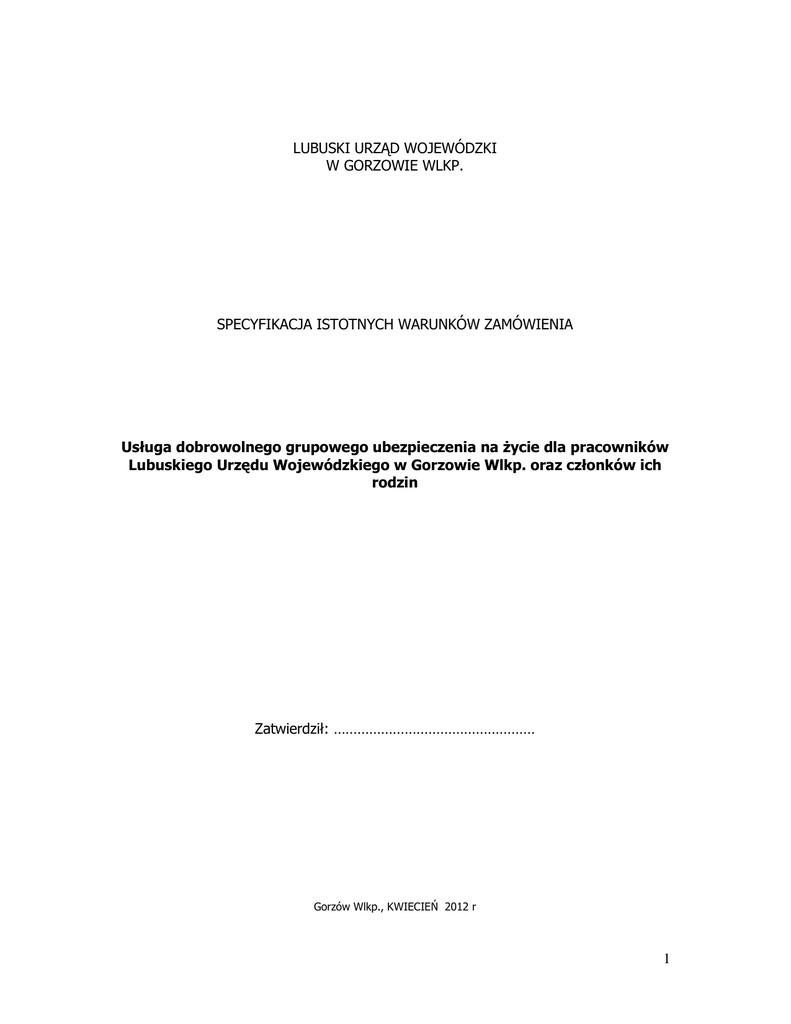 LUBUSKI URZĄD WOJEWÓDZKI W GORZOWIE WLKP. SPECYFIKACJA ISTOTNYCH WARUNKÓW ZAMÓWIENIA Usługa dobrowolnego grupowego ubezpieczenia na Ŝycie dla pracowników Lubuskiego Urzędu Wojewódzkiego w Gorzowie Wlkp. oraz członków ich rodzin Zatwierdził: …………………………………………… Gorzów Wlkp., KWIECIEŃ 2012 r 1 SPIS TREŚCI INFORMACJE WSTĘPNE ..................................................................................................................................... 3 1. 2. 3. 4. 5. 6. 7. 8. 9. 10. ZAMAWIAJĄCY .......................................................................................................................................... 3 NUMER POSTĘPOWANIA ............................................................................................................................... 3 TRYB POSTĘPOWANIA ................................................................................................................................. 3 INFORMACJE OGÓLNE .................................................................................................................................. 3 INFORMACJA O ŹRÓDŁACH FINANSOWANIA ZAMÓWIENIA ....................................................................................... 4 NAZWA ZADANIA: ...................................................................................................................................... 4 WSPÓLNY SŁOWNIK ZAMÓWIEŃ (CPV) ........................................................................................................... 4 OPIS PRZEDMIOTU ZAMÓWIENIA .................................................................................................................... 4 WARUNKI UDZIAŁU W POSTĘPOWANIU ............................................................................................................. 4 DOKUMENTY POTWIERDZAJĄCE SPEŁNIANIE WARUNKÓW UDZIAŁU W POSTĘPOWANIU..................................................... 4 PODWYKONAWCY ............................................................................................................................................. 5 OPIS SPOSOBU PRZYGOTOWANIA OFERTY ........................................................................................................ 5 11. 12. 13. 14. WYMAGANIA I ZALECENIA OGÓLNE .............................................................................................................. 5 ZMIANA LUB WYCOFANIE ZŁOśONEJ OFERTY. ................................................................................................. 6 OFERTA WSPÓLNA WYKONAWCÓW. ............................................................................................................ 6 ZAWARTOŚĆ OFERTY .............................................................................................................................. 6 WADIUM ........................................................................................................................................................... 6 INFORMACJA O TRYBIE OTWARCIA, BADANIA I OCENY OFERT .......................................................................... 6 15. 16. 17. 18. OTWARCIE OFERT . ................................................................................................................................ 6 KRYTERIA OCENY OFERT .......................................................................................................................... 7 SPOSÓB OBLICZENIA CENY........................................................................................................................ 7 BADANIE OFERT I POPRAWIANIE OCZYWISTYCH OMYŁEK.................................................................................... 7 WYBÓR WYKONAWCY ....................................................................................................................................... 7 UMOWA ............................................................................................................................................................ 8 19. PROJEKT UMOWY ................................................................................................................................... 8 20. ZAWARCIE UMOWY ................................................................................................................................ 8 ZABEZPIECZENIE NALEśYTEGO WYKONANIA UMOWY ........................................................................................ 8 ŚRODKI ODWOŁAWCZE ..................................................................................................................................... 8 WZORY DOKUMENTÓW ..................................................................................................................................... 8 2 I Informacje wstępne 1. Zamawiający Lubuski Urząd Wojewódzki w Gorzowie Wlkp. ul. Jagiellończyka 8 66 – 400 Gorzów Wlkp. Telefon: 95 7115 210 Faks: 95 7115 380 Strona internetowa: www.luw.pl e-mail: [email protected] Godziny pracy: 7:30 – 15:30 NIP: 599-24-62-314 Regon: 210467089 2. Numer postępowania Postępowanie, którego dotyczy niniejszy dokument oznaczone jest znakiem: BG-IV.272.9 .2012. Wykonawcy we wszelkich kontaktach z zamawiającym powinni powoływać się na ten znak. 3. Tryb postępowania Postępowanie o udzielenie zamówienia publicznego prowadzone jest w trybie przetargu nieograniczonego zgodnie z art. 39 ustawy z dnia 29 stycznia 2004 r. Prawo zamówień publicznych (Dz. U. z 2010 r. Nr 113, poz. 759 ze zm.) o wartości szacunkowej nie przekraczającej kwot określonych w przepisach wydanych na podstawie art. 11 ust. 8 ustawy z dnia 29 stycznia 2004 r.– Prawo Zamówień Publicznych (Dz. U. z 2010 r. Nr 113,poz 759 ze zm.) 4. Informacje ogólne Wszelkie informacje przedstawione w niniejszej Specyfikacji Istotnych Warunków Zamówienia w dalszej części zwanej SIWZ, przeznaczone są wyłącznie w celu przygotowania