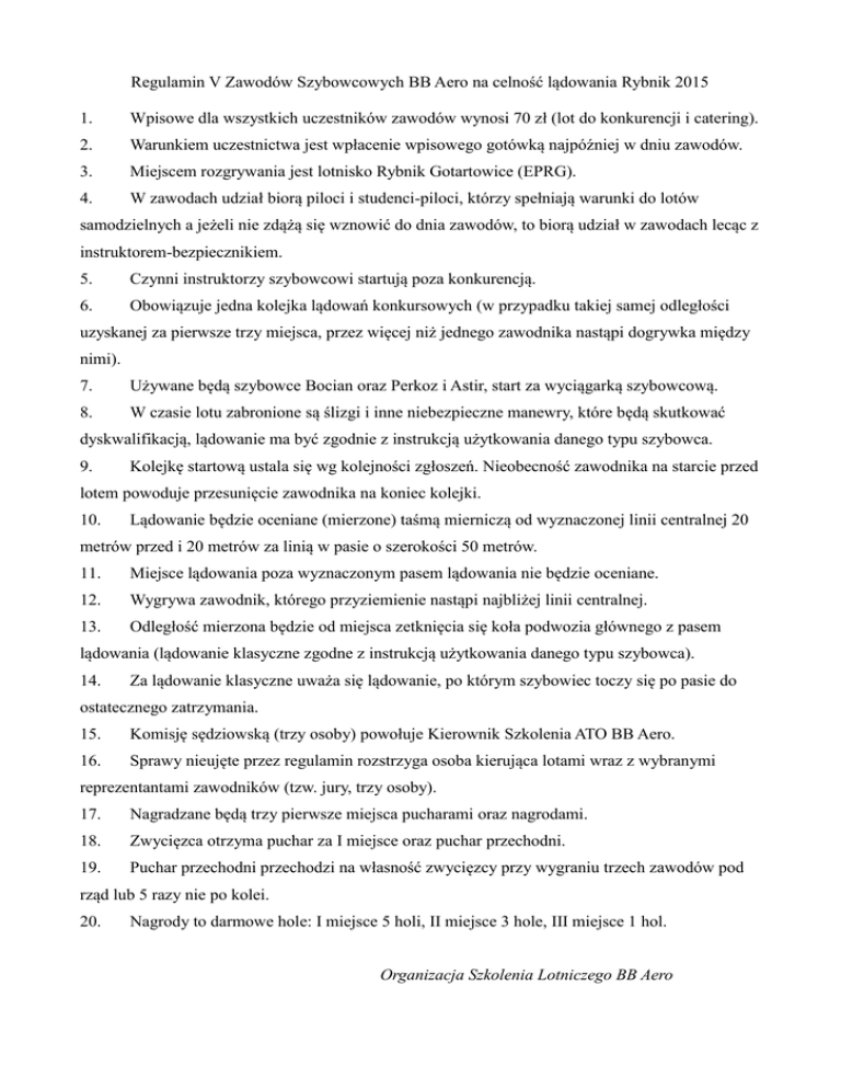 Regulamin V Zawodów Szybowcowych BB Aero na celność lądowania Rybnik 2015 1. Wpisowe dla wszystkich uczestników zawodów wynosi 70 zł (lot do konkurencji i catering). 2. Warunkiem uczestnictwa jest wpłacenie wpisowego gotówką najpóźniej w dniu zawodów. 3. Miejscem rozgrywania jest lotnisko Rybnik Gotartowice (EPRG). 4. W zawodach udział biorą piloci i studenci-piloci, którzy spełniają warunki do lotów samodzielnych a jeżeli nie zdążą się wznowić do dnia zawodów, to biorą udział w zawodach lecąc z instruktorem-bezpiecznikiem. 5. Czynni instruktorzy szybowcowi startują poza konkurencją. 6. Obowiązuje jedna kolejka lądowań konkursowych (w przypadku takiej samej odległości uzyskanej za pierwsze trzy miejsca, przez więcej niż jednego zawodnika nastąpi dogrywka między nimi). 7. Używane będą szybowce Bocian oraz Perkoz i Astir, start za wyciągarką szybowcową. 8. W czasie lotu zabronione są ślizgi i inne niebezpieczne manewry, które będą skutkować dyskwalifikacją, lądowanie ma być zgodnie z instrukcją użytkowania danego typu szybowca. 9. Kolejkę startową ustala się wg kolejności zgłoszeń. Nieobecność zawodnika na starcie przed lotem powoduje przesunięcie zawodnika na koniec kolejki. 10. Lądowanie będzie oceniane (mierzone) taśmą mierniczą od wyznaczonej linii centralnej 20 metrów przed i 20 metrów za linią w pasie o szerokości 50 metrów. 11. Miejsce lądowania poza wyznaczonym pasem lądowania nie będzie oceniane. 12. Wygrywa zawodnik, którego przyziemienie nastąpi najbliżej linii centralnej. 13. Odległość mierzona będzie od miejsca zetknięcia się koła podwozia głównego z pasem lądowania (lądowanie klasyczne zgodne z instrukcją użytkowania danego typu szybowca). 14. Za lądowanie klasyczne uważa się lądowanie, po którym szybowiec toczy się po pasie do ostatecznego zatrzymania. 15. Komisję sędziowską (trzy osoby) powołuje Kierownik Szkolenia ATO BB Aero. 16. Sprawy nieujęte przez regulamin rozstrzyga osoba kierująca lotami wraz z wybranymi reprezentantami zawodników (tzw. jury, trzy osoby). 17. Nagradzane będą trzy pierwsze miejsca pucharami oraz nagrodami. 18. Zwycięzca otrzyma puchar za I miejsce oraz puchar przechodni. 19. Puchar przechodni przechodzi na własność zwycięzcy przy wygraniu trzech zawodów pod rząd lub 5 razy nie po kolei. 20. Nagrody to darmowe hole: I miejsce 5 holi, II miejsce 3 hole, III miejsce 1 hol. Organizacja Szkolenia Lotniczego BB Aero