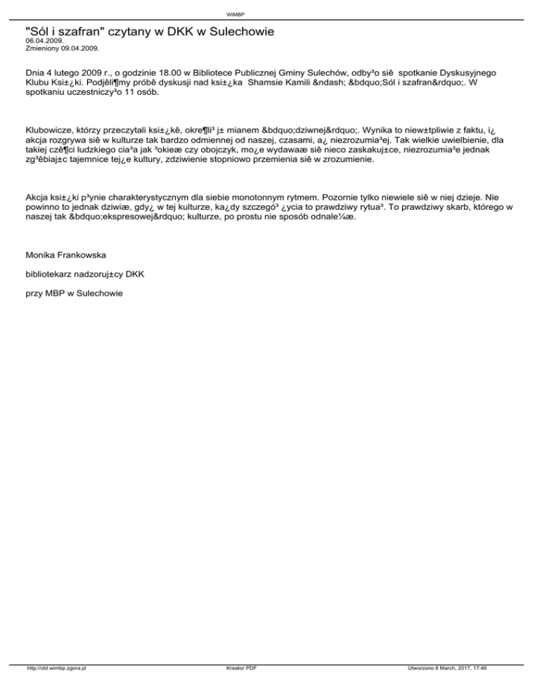 WiMBP "Sól i szafran" czytany w DKK w Sulechowie 06.04.2009. Zmieniony 09.04.2009. Dnia 4 lutego 2009 r., o godzinie 18.00 w Bibliotece Publicznej Gminy Sulechów, odby³o siê spotkanie Dyskusyjnego Klubu Ksi±¿ki. Podjêli¶my próbê dyskusji nad ksi±¿ka Shamsie Kamili – „Sól i szafran”. W spotkaniu uczestniczy³o 11 osób. Klubowicze, którzy przeczytali ksi±¿kê, okre¶li³ j± mianem „dziwnej”. Wynika to niew±tpliwie z faktu, i¿ akcja rozgrywa siê w kulturze tak bardzo odmiennej od naszej, czasami, a¿ niezrozumia³ej. Tak wielkie uwielbienie, dla takiej czê¶ci ludzkiego cia³a jak ³okieæ czy obojczyk, mo¿e wydawaæ siê nieco zaskakuj±ce, niezrozumia³e jednak zg³êbiaj±c tajemnice tej¿e kultury, zdziwienie stopniowo przemienia siê w zrozumienie. Akcja ksi±¿ki p³ynie charakterystycznym dla siebie monotonnym rytmem. Pozornie tylko niewiele siê w niej dzieje. Nie powinno to jednak dziwiæ, gdy¿ w tej kulturze, ka¿dy szczegó³ ¿ycia to prawdziwy rytua³. To prawdziwy skarb, którego w naszej tak „ekspresowej” kulturze, po prostu nie sposób odnale¼æ. Monika Frankowska bibliotekarz nadzoruj±cy DKK przy MBP w Sulechowie http://old.wimbp.zgora.pl Kreator PDF Utworzono 8 March, 2017, 17:46