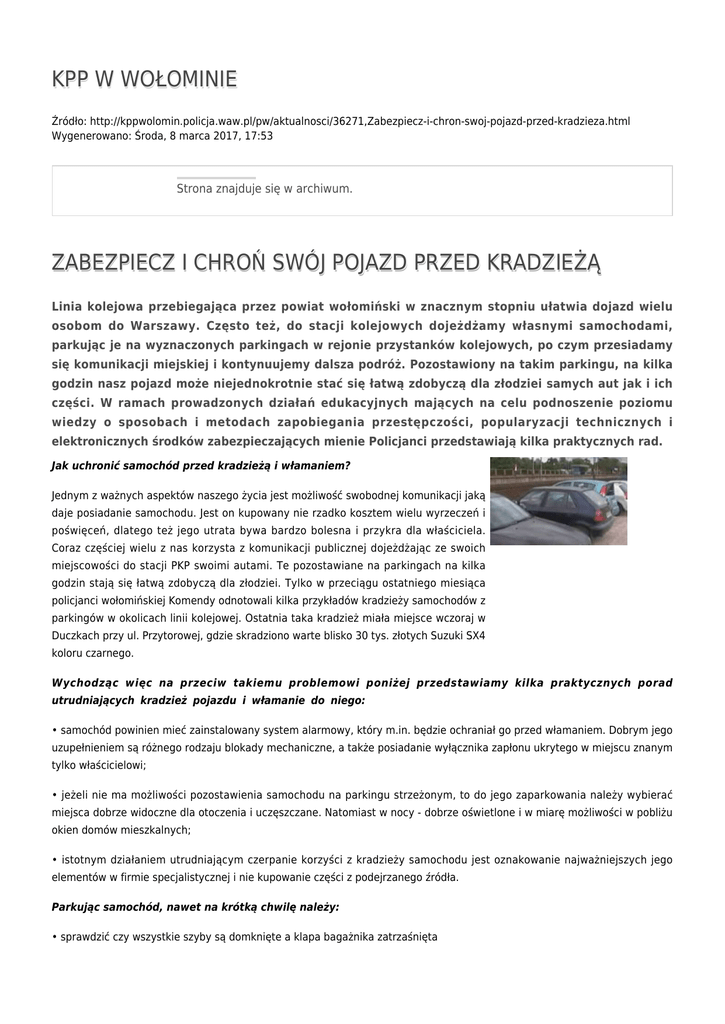 KPP W WOŁOMINIE Źródło: http://kppwolomin.policja.waw.pl/pw/aktualnosci/36271,Zabezpiecz-i-chron-swoj-pojazd-przed-kradzieza.html Wygenerowano: Środa, 8 marca 2017, 17:53 Strona znajduje się w archiwum. ZABEZPIECZ I CHROŃ SWÓJ POJAZD PRZED KRADZIEŻĄ Linia kolejowa przebiegająca przez powiat wołomiński w znacznym stopniu ułatwia dojazd wielu osobom do Warszawy. Często też, do stacji kolejowych dojeżdżamy własnymi samochodami, parkując je na wyznaczonych parkingach w rejonie przystanków kolejowych, po czym przesiadamy się komunikacji miejskiej i kontynuujemy dalsza podróż. Pozostawiony na takim parkingu, na kilka godzin nasz pojazd może niejednokrotnie stać się łatwą zdobyczą dla złodziei samych aut jak i ich części. W ramach prowadzonych działań edukacyjnych mających na celu podnoszenie poziomu wiedzy o sposobach i metodach zapobiegania przestępczości, popularyzacji technicznych i elektronicznych środków zabezpieczających mienie Policjanci przedstawiają kilka praktycznych rad. Jak uchronić samochód przed kradzieżą i włamaniem? Jednym z ważnych aspektów naszego życia jest możliwość swobodnej komunikacji jaką daje posiadanie samochodu. Jest on kupowany nie rzadko kosztem wielu wyrzeczeń i poświęceń, dlatego też jego utrata bywa bardzo bolesna i przykra dla właściciela. Coraz częściej wielu z nas korzysta z komunikacji publicznej dojeżdżając ze swoich miejscowości do stacji PKP swoimi autami. Te pozostawiane na parkingach na kilka godzin stają się łatwą zdobyczą dla złodziei. Tylko w przeciągu ostatniego miesiąca policjanci wołomińskiej Komendy odnotowali kilka przykładów kradzieży samochodów z parkingów w okolicach linii kolejowej. Ostatnia taka kradzież miała miejsce wczoraj w Duczkach przy ul. Przytorowej, gdzie skradziono warte blisko 30 tys. złotych Suzuki SX4 koloru czarnego. Wychodząc więc na przeciw takiemu problemowi poniżej przedstawiamy kilka praktycznych porad utrudniających kradzież pojazdu i włamanie do niego: • samochód powinien mieć zainstalowany system alarmowy, który m.in. będzie ochraniał go przed włamaniem. Dobrym jego uzupełnieniem są różnego rodzaju blokady mechaniczne, a także posiadanie wyłącznika zapłonu ukrytego w miejscu znanym tylko właścicielowi; • jeżeli nie ma możliwości pozostawienia samochodu na parkingu strzeżonym, to do jego zaparkowania należy wybierać miejsca dobrze widoczne dla otoczenia i uczęszczane. Natomiast w nocy - dobrze oświetlone i w miarę możliwości w pobliżu okien domów mieszkalnych; • istotnym działaniem utrudniającym czerpanie korzyści z kradzieży samochodu jest oznakowanie najważniejszych jego elementów w firmie specjalistycznej i nie kupowanie części z podejrzanego źródła. Parkując samochód, nawet na krótką chwilę należy: • sprawdzić czy wszystkie szyby są domknięte a klapa bagażnika zatrzaśnięta • włączyć alarm oraz inne posiadane zabezpieczenia, • bagaże w tym torby, plecaki, nesesery i inne rzeczy powinny być w schowkach lub bagażniku, pozostawienie ich na widoku będzie zachętą dla złodziei . Rzeczy tych nie powinniśmy też chować do bagażnika dopiero w miejscu parkowania. • jeżeli w samochodzie zainstalowany jest radioodtwarzacz z panelem, to panel ten zabieramy ze sobą, a nie chowamy do schowka czy pod fotel, podobnie czynimy z nawigacją i innymi urządzeniami elektronicznymi. • odchodząc od samochodu kluczyki chowamy do kieszeni wewnętrznych ubrania, a w domu w miejscu bezpiecznym (z dala od drzwi wejściowych). Nigdy też nie pozostawiamy wewnątrz samochodu dokumentów – dowodu rejestracyjnego, polisy OC i prawa jazdy. • Nigdy nie pozostawiamy samochodu z kluczykami w stacyjce. Zwracaj uwagę na inne zaparkowane w pobliżu pojazdy i osoby podejrzane kręcące się przy nich. Jeżeli zauważysz coś niepokojącego REAGUJ, POWIADOM, NIE TOLERUJ, dzwoń telefony alarmowe są do Twojej dyspozycji 997 lub 112 lub powiadom swojego dzielnicowego. ts Ocena: 0/5 (0) Tweetnij