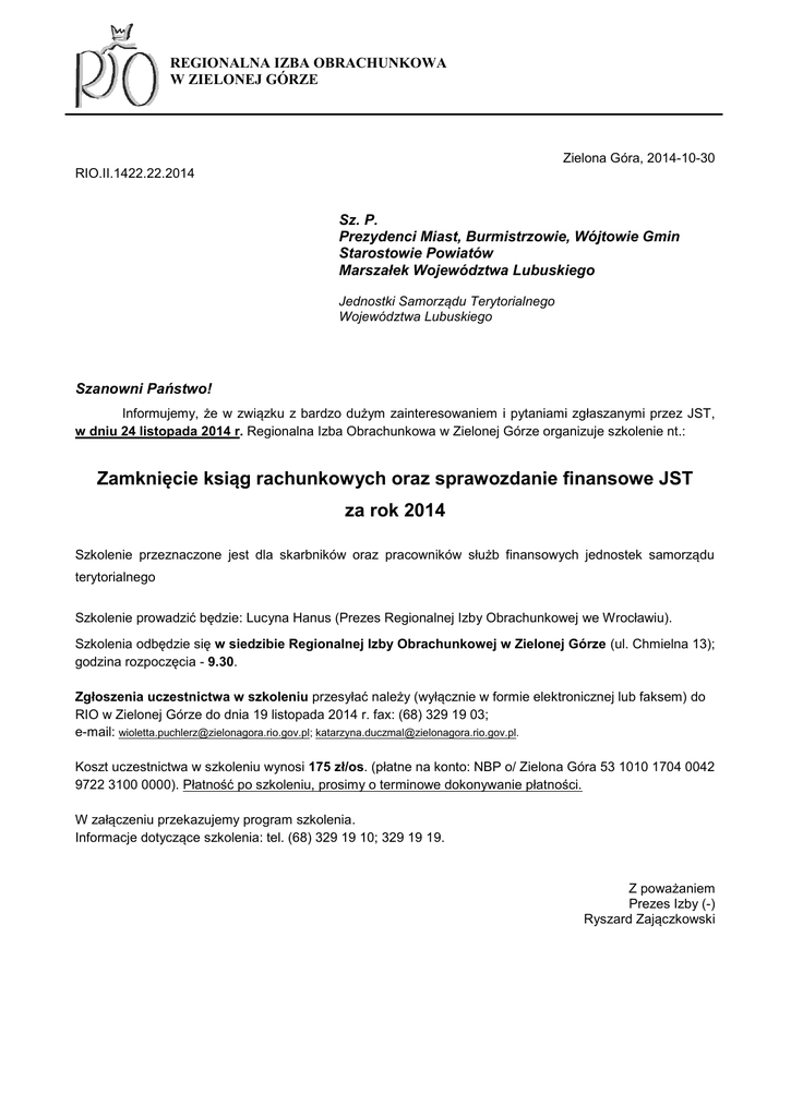 REGIONALNA IZBA OBRACHUNKOWA W ZIELONEJ GÓRZE Zielona Góra, 2014-10-30 RIO.II.1422.22.2014 Sz. P. Prezydenci Miast, Burmistrzowie, Wójtowie Gmin Starostowie Powiatów Marszałek Województwa Lubuskiego Jednostki Samorządu Terytorialnego Województwa Lubuskiego Szanowni Państwo! Informujemy, że w związku z bardzo dużym zainteresowaniem i pytaniami zgłaszanymi przez JST, w dniu 24 listopada 2014 r. Regionalna Izba Obrachunkowa w Zielonej Górze organizuje szkolenie nt.: Zamknięcie ksiąg rachunkowych oraz sprawozdanie finansowe JST za rok 2014 Szkolenie przeznaczone jest dla skarbników oraz pracowników służb finansowych jednostek samorządu terytorialnego Szkolenie prowadzić będzie: Lucyna Hanus (Prezes Regionalnej Izby Obrachunkowej we Wrocławiu). Szkolenia odbędzie się w siedzibie Regionalnej Izby Obrachunkowej w Zielonej Górze (ul. Chmielna 13); godzina rozpoczęcia - 9.30. Zgłoszenia uczestnictwa w szkoleniu przesyłać należy (wyłącznie w formie elektronicznej lub faksem) do RIO w Zielonej Górze do dnia 19 listopada 2014 r. fax: (68) 329 19 03; e-mail: [email protected]; [email protected]. Koszt uczestnictwa w szkoleniu wynosi 175 zł/os. (płatne na konto: NBP o/ Zielona Góra 53 1010 1704 0042 9722 3100 0000). Płatność po szkoleniu, prosimy o terminowe dokonywanie płatności. W załączeniu przekazujemy program szkolenia. Informacje dotyczące szkolenia: tel. (68) 329 19 10; 329 19 19. Z poważaniem Prezes Izby (-) Ryszard Zajączkowski REGIONALNA IZBA OBRACHUNKOWA W ZIELONEJ GÓRZE Szkolenie Zamknięcie ksiąg rachunkowych oraz sprawozdanie finansowe JST za rok 2014 (szkolenie dla Skarbników i pracowników służb finansowych JST) Termin: 24 listopada 2014 r. Miejsce: RIO Zielona Góra (ul. Chmielna 13) Godzina rozpoczęcia: 9.30 Prowadzące: Lucyna Hanus Koszt uczestnictwa: 175 zł/os. Zgłoszenia uczestnictwa w szkoleniu przesyłać należy (wyłącznie w formie elektronicznej lub faksem) do RIO w Zielonej Górze do dnia 19 listopada 2014 r.: fax: (68) 329 19 03; e-mail: [email protected]; [email protected]. PROGRAM 1. Zapowiadane zmiany przepisów ustaw ustrojowych – w tym ustawy o finansach publicznych w zakresie dotyczącym rachunkowości, w tym: zasady tworzenia i zadania jednostek obsługujących, przyjmowanie depozytów od samorządowych osób prawnych. 2. Kluczowe aspekty zamknięcia ksiąg rachunkowych, w tym: zasady, metody i terminy przeprowadzania inwentaryzacji, wyjaśnienia MF dotyczące inwentaryzacji. 3. Wybrane problemy ewidencyjne, w tym: ewidencja zwrotów i rozliczeń dotacji, dostaw niefakturowanych, przychodów i kosztów na przełomie roku, refakturowania kosztów energii, zapłaty dokonywanej przy użyciu karty płatniczej i kredytowej. 4. Sprawozdanie finansowe jednostkowe, w tym: wycena i prezentacja aktywów i pasywów w bilansie (m.in. wycena rzeczowych aktywów trwałych, ujęcie przedmiotu leasingu i zapowiadane zmiany MSR nr 17 Leasing, ewidencja i wycena aktywów finansowych – aportów, udziałów), prezentacja danych w rachunku zysków i strat w świetle przepisów o rachunkowości. 5. Bilans z wykonania budżetu JST, w tym: sposób prezentacji środków zarezerwowanych na niewygasające wydatki. 6. Zakres wytycznych dotyczących rachunkowości, które organ wykonawczy JST powinien wydać w celu zapewnienia prawidłowego sporządzenia sprawozdania finansowego JST, w tym: zakres i zasady ewidencji wzajemnych wyłączeń (konto 976). 7. Pytania i odpowiedzi. Zgłoszenie uczestnictwa w szkoleniu : Zamknięcie ksiąg rachunkowych oraz sprawozdanie finansowe JST za rok 2014 (szkolenie dla Skarbników i pracowników służb finansowych JST) Termin: 24 listopada 2014 r. ……………………………………………………… ............................................... (jednostka- dane do wystawienia rachunku) (telefon) ……………………………………………………… ………………………………………… (NIP) ……………………………………………………. - …………………………………………. (imię i nazwisko - stanowisko) ……………………………………………………. - …………………………………………. (imię i nazwisko - stanowisko) ………………………………………………… (zgłaszający)