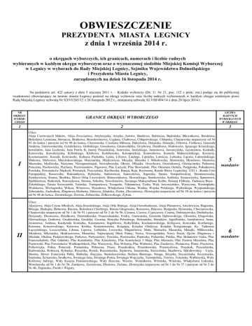 OBWIESZCZENIE PREZYDENTA MIASTA LEGNICY z dnia 1 września 2014 r. o okręgach wyborczych, ich granicach, numerach i liczbie radnych wybieranych w każdym okręgu wyborczym oraz o wyznaczonej siedzibie Miejskiej Komisji Wyborczej w Legnicy w wyborach do Rady Miejskiej Legnicy, Sejmiku Województwa Dolnośląskiego i Prezydenta Miasta Legnicy, zarządzonych na dzień 16 listopada 2014 r. Na podstawie art. 422 ustawy z dnia 5 stycznia 2011 r. – Kodeks wyborczy (Dz. U. Nr 21, poz. 112 z późn. zm.) podaje się do publicznej wiadomości obowiązujący na terenie miasta Legnicy podział na okręgi wyborcze oraz liczbę radnych wybieranych w każdym okręgu ustalonym przez Radę Miejską Legnicy uchwałą Nr XXVI/265/12 z 26 listopada 2012 r., zmienioną uchwałą XLVIII/494/14 z dnia 28 lipca 2014 r. NR OKRĘGU WYBORCZEGO GRANICE OKRĘGU WYBORCZEGO LICZBA RADNYCH WYBIERANYCH W OKRĘGU 1 2 3 I Ulice: Aleja Czerwonych Maków, Aleja Zwycięstwa, Artyleryjska, Asnyka, Astrów, Bankowa, Bartnicza, Będzińska, Bławatkowa, Boiskowa, Bolesława Leśmiana, Borsucza, Bratkowa, Brzoskwiniowa, Ceglana, Chabrowa, Chłapowskiego, Chłopska, Chojnowska nieparzyste od Nr 93 do końca i parzyste od Nr 98 do końca, Chorzowska, Czesława Miłosza, Daktylowa, Dekarska, Domejki, Filtrowa, Fiołkowa, Generała Andersa, Gniewomierska, Goździkowa, Grabskiego, Groszkowa, Grunwaldzka, Grzybowa, Handlowa, Hodowców, Ignacego Krasickiego, Inwalidów, Jana Lechonia, Jana Pawła II, Janiny Porazińskiej, Janowska, Jasińskiego, Jaśminowa, Jaworzyńska, Jęczmienna, Kaskady, Katowicka, Kawaleryjska, Kilińskiego, Klubowa, Kołobrzeska, Konopnickiej, Konwaliowa, Kornela Makuszyńskiego, Kosiarzy, Kosmonautów, Kossak, Kościuszki, Kubusia Puchatka, Leśna, Liliowa, Lindego, Lipnicka, Lotnicza, Lubuska, Łączna, Łukasińskiego, Makowa, Malwowa, Marcinkowskiego, Marynarska, Mickiewicza, Miejska, Mieszka I, Mikołowska, Monterska, Morelowa, Mostowa, Muzealna, Myśliwska, Nasienna, Niezapominajek, Nowodworska, Okrzei, Olkuska, Orzechowa, Orzeszkowej, Oświęcimska, Palmowa, Pancerna, Pawłowicka, Piechoty, Pierwiosnków, Pigwowa, Plac Łużycki, Plac Słowiański, Plac Ottomara Oertela, Podgórska, Południowa, Poselska, Powstańców Śląskich, Przesmyk, Pszczyńska, Raciborska, Rataja, Reja, Reymonta, Rondo Bitwy Legnickiej 1241 r., Rondo Unii Europejskiej, Roosevelta, Rumiankowa, Rybnicka, Sadownicza, Saneczkowa, Saperska, Sarnia, Sempołowskiej, Siemianowicka, Sienkiewicza, Sienna, Skarbka, Skwer Orląt Lwowskich, Słonecznikowa, Słowackiego, Smokowicka, Solińska, Sosnowiecka, Spacerowa, Spółdzielcza, Stokrotek, Storczykowa, Stroma, Szkolna, Szwoleżerów, Świętego Maksymiliana Kolbe, Świętej Elżbiety, Tadeusza Boya – Żeleńskiego, Tarasa Szewczenki, Tatarska, Transportowa, Traugutta, Tulipanowa, Tyska, Wały Jaworzyńskie, Warzywna, Westerplatte, Widokowa, Wielogórska, Wilcza, Wiśniowa, Wjazdowa, Władysława Orkana, Wodna, Wojska Polskiego, Wybickiego, Wyspiańskiego, Zabrzańska, Zachodnia, Zbigniewa Herberta, Zdrowia, Zduńska, Zielna, Złocieniowa, Złotoryjska nieparzyste od Nr 39 do końca i parzyste od Nr 48 do końca, Żeromskiego, Żniwna, Żołnierska, Żółkiewskiego, Żytnia. II Ulice: Akacjowa, Aleja Czynu Młodych, Aleja Krasińskiego, Aleja Orła Białego, Aleja Oswobodzenia, Aleja Platanowa, Anielewicza, Bagienna, Bilsego, Biskupia, Bobrowa, Boczna, Bolesława Chrobrego, Brama Głogowska, Brzozowa, Bukowa, Bydgoska, Bytomska, Chocianowska, Chojnowska nieparzyste od Nr 1 do Nr 91 i parzyste od Nr 2 do Nr 96, Ciemna, Cisowa, Cyprysowa, Czarna, Dobrzejowska, Drohobycka, Drzymały, Dworcowa, Działkowa, Dziennikarska, Franciszkańska, Fredry, Garncarska, Generała Dąbrowskiego, Gliwicka, Głogowska, Głowackiego, Grabowa, Grodzieńska, Grodzka, Gwarna, Henryka Pobożnego, Hetmańska, Hutników, Jagiellońska, Jarzębinowa, Jasna, Jesionowa, Jordana, Kardynała Kominka, Kasztanowa, Kąpielowa, Kobylińska, Kochanowskiego, Kolejowa, Korczaka, Korfantego, Koronna, Kraszewskiego, Kresowa, Krótka, Krzemieniecka, Książęca, Księdza Gładysza, Księdza Ściegiennego, Ks. Tadeusza Łączyńskiego, Leszczyńska, Libana, Lipowa, Lubińska, Lwowska, Magnoliowa, Mała, Mariacka, Masarska, Matejki, Miłkowicka, Miodowa, Młynarska, Modrzewiowa, Murarska, Najświętszej Marii Panny, Nowa, Nowogródzka, Nowy Świat, Ojców Zbigniewa i Michała, Okólna, Paderewskiego, Parkowa, Partyzantów, Pawicka, Piastowska, Piątnicka, Piekarska, Pińska, Plac Bohaterów Getta, Plac Franciszkański, Plac Gdański, Plac Katedralny, Plac Klasztorny, Plac Konstytucji 3 Maja, Plac Mariacki, Plac Pastora Meisslera, Plac Piastowski, Plac Powstańców Wielkopolskich, Plac Warzywny, Plac Wilsona, Plac Wolności, Plac Zamkowy, Platanowa, Plater, Pocztowa, Polkowicka, Polna, Potoczek, Poznańska, Północna, Prusa, Przechodnia, Przemkowska, Przemysłowa, Przeskok, Pszczelarska, Radwanicka, Rolnicza, Rybacka, Rycerska, Rynek, Rzeszotarska, Sejmowa, Senatorska, Sierocińska, Skarbowa, Skłodowskiej – Curie, Skośna, Skwer Franciszka Pałki, Słubicka, Stacyjna, Stanisławowska, Stefana Batorego, Struga, Stryjska, Szczecińska, Szczytnicka, Szpitalna, Ścinawska, Środkowa, Świętego Jana, Świętego Piotra, Świętego Wojciecha, Tarnopolska, Torowa, Toruńska, Wałbrzyska, Wały Królowej Jadwigi, Wały Księcia Poniatowskiego, Wały Rzeczne, Wazów, Wiatrakowa, Wileńska, Witelona, Władysława Łokietka, Wrocławska od Nr 1 do Nr 50, Zamkowa, Zawietrzna, Zbożowa, Zielona, Złotoryjska nieparzyste od Nr 1 do Nr 37 i parzyste od Nr 2 do Nr 46, Żeglarska, Żwirki i Wigury. 5 mandatów 6 mandatów 2 1 2 3 III Ulice: II Armii Wojska Polskiego, Aleja Marszałka Piłsudskiego, Aleja Ofiar Ludobójstwa OUN-UPA, Aleja Rzeczypospolitej, Andromedy, Antenowa, Armii Ludowej, Biała, Bielańska, Bolesława Limanowskiego, Bracka, Broniewskiego, Bronisława Chyły, Cedrowa, Celna, Ciesielska, Cmentarna, Czarnieckiego, Daszyńskie