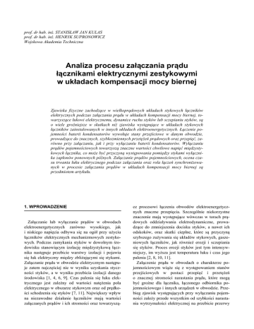 prof. dr hab. inż. STANISŁAW JAN KULAS prof. dr hab. inż. HENRYK SUPRONOWICZ Wojskowa Akademia Techniczna Analiza procesu załączania prądu łącznikami elektrycznymi zestykowymi w układach kompensacji mocy biernej Zjawiska fizyczne zachodzące w wielkoprądowych układach stykowych łączników elektrycznych podczas załączania prądu w układach kompensacji mocy biernej, towarzyszące łukowi elektrycznemu, dynamice ruchu styków lub sczepianiu styków, są o wiele groźniejsze w skutkach niż zjawiska występujące w układach stykowych łączników zainstalowanych w innych układach elektroenergetycznych. Łączenie pojemności baterii kondensatorów wywołuje stany przejściowe w danym obwodzie, prowadzące do znacznych, szybkozmiennych przetężeń prądowych oraz przepięć, zarówno przy załączaniu, jak i przy wyłączaniu baterii kondensatorów. Wyłączaniu prądów pojemnościowych towarzyszą znaczne wartości chwilowe napięć międzystykowych łącznika, co może być przyczyną występowania pomiędzy stykami wyłącznika zapłonów ponownych późnych. Załączanie prądów pojemnościowych, ocena czasu trwania łuku elektrycznego podczas załączania oraz rola łączeń synchronizowanych w procesie załączania prądów w układach kompensacji mocy biernej są przedmiotem artykułu. 1. WPROWADZENIE Załączanie lub wyłączanie prądów w obwodach elektroenergetycznych zarówno wysokiego, jak i niskiego napięcia odbywa się na ogół przy użyciu łączników elektrycznych mechanizmowych zestykowych. Podczas zamykania styków w dowolnym środowisku stanowiącym izolację międzystykową łącznika następuje przebicie warstwy izolacji i pojawia się łuk elektryczny między zbliżającymi się stykami. Załączanie prądu w obwodzie elektrycznym następuje zatem najczęściej nie w wyniku uzyskania styczności styków, a w wyniku przebicia izolacji danego środowiska [1, 4, 6, 9]. Czas palenia się łuku elektrycznego jest zależny od wartości natężenia pola elektrycznego w obszarze stykowym oraz od prędkości schodzenia się styków [7, 11]. Największy wpływ na niezawodne działanie łączników mają wartości załączanych prądów i ich stromości oraz towarzyszą- ce procesowi łączenia obwodów elektroenergetycznych znaczne przepięcia. Szczególnie niekorzystne znaczenie mają występujące wówczas w torach prądowych oddziaływania elektrodynamiczne, prowadzące do zmniejszenia docisku styków, a nawet ich odskoków, oraz skutki cieplne, które są przyczyną szybszego zużywania się układów stykowych, gaszeniowych łączników, jak również erozji i sczepiania się styków. Proces erozji styków jest tym intensywniejszy, im wyższa jest temperatura łuku i czas jego palenia [2, 8, 10, 11]. Załączenie prądu w obwodach o charakterze pojemnościowym wiąże się z występowaniem stanów przejściowych w postaci przepięć i przetężeń o znacznej stromości narastania prądu, które mogą być groźne dla łącznika, łączonego odbiornika pojemnościowego i innych urządzeń w obwodzie. Przebieg zjawisk występujących przy wyłączaniu pojemności zależy przede wszystkim od szybkości narastania wytrzymałości elektrycznej na przebicie przerwy Nr 12(514) GRUDZIEŃ 2013 39 poprawy współczynnika mocy, zwłaszcza w zakładach przemysłowych, oraz nieobciążonych linii napowietrznych i kablowych. Baterie najczęściej instaluje się jako trójfazowe, połączone w gwiazdę nieuziemioną z uwagi na prostotę zabezpieczeń od zwarć wewnętrznych w baterii. Przyjmując jako założenie jednoczesne załączanie trzech faz, wobec symetrii układu, punkty gwiazdowe można połączyć bezoporowo i układ trójfazowy można sprowadzić do układu jednofazowego [1, 3, 9, 10]. Analizując przebiegi przejściowe występujące przy załączaniu skupionej pojemności baterii kondensatorów, należy rozpatrzyć przypadek załączania pojedynczych kondensatorów do sieci, w której nie ma innych równolegle już dołączonych kondensatorów (rys. 1), oraz przypadek znacznie groźniejszy z punktu widzenia występujących przetężeń prądowych w obwodzie, polegający na przyłączaniu dodatkowych kondensatorów do obwodu z kondensatorami znajdującymi się już pod napięciem. Okazuje się, że charakterystyczne dla załączania baterii kondensatorów są następujące graniczne momenty załączania: gdy chwilowa wartość napięcia sieci zasilającej równa się maksimum, gdy chwilowa wartość napięcia sieci zasilającej równa się zeru. międzystykowej łącznika oraz od mocy wyłączanej baterii, a także od parametrów układu sieci zasilającej [3, 5, 9]. Najbardziej skutecznym sposobem ograniczania przepięć przy wyłączaniu pojemności jest niedopuszczanie do występowania późnych zapłonów ponownych. Obecnie do łączenia baterii kondensatorów stosowane są wyłączniki tzw. bezzapłonowe (próżniowe i SF6), w których podczas otwierania styków uzyskuje się dostatecznie szybkie przyrastanie wytrzymałości powrotnej przerw gaszeniowych, decydujące o skutecznym przerwaniu prądu [12, 13]. Przedmiotem artykułu jest analiza stanów przejściowych występujących przy załączeniu baterii kondensatorów, ocena czasu łukowego podczas załączania oraz użyteczność łączeń synchronizowanych do ograniczania negatywnych skutków procesów przejściowych podczas łączenia baterii kondensatorowych. 2. ZAŁĄCZENIE PRĄDÓW POJEMNOŚCIOWYCH Łączenie prądów pojemnościowych dotyczy przede wszystkim baterii kondensatorów stosowanych do a) b) Rys. 1. Załączanie baterii o pojemności C oraz o indukcyjności połączeń L1 w obwodzie zasilania o indukcyjności Lz (Lz > L1 ) oraz rezystancji Rz 0: a) schemat zastępczy obwodu; b) przebiegi prądu załączeniowego iz oraz jego składowych [5] Przyjmując założenie sinusoidalnego napięcia zasilającego e(t), pomijalnie małej rezystancji obwodu zasilającego Rz oraz nieuwzględnian