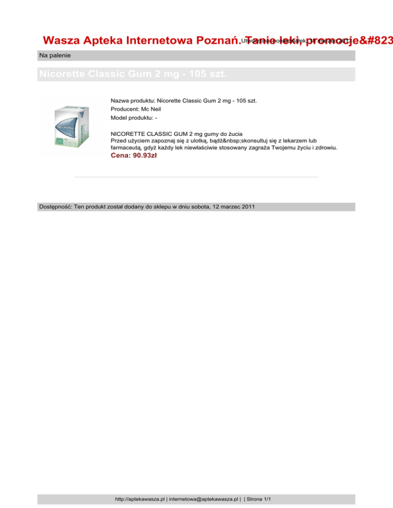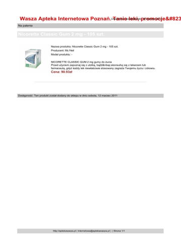 18 marzec 2013 Wasza Apteka Internetowa Poznań.Utworzono: Tanieponiedziałek, leki, promocje̷ Na palenie Nicorette Classic Gum 2 mg - 105 szt. Nazwa produktu: Nicorette Classic Gum 2 mg - 105 szt. Producent: Mc Neil Model produktu: NICORETTE CLASSIC GUM 2 mg gumy do żucia Przed użyciem zapoznaj się z ulotką, bądź skonsultuj się z lekarzem lub farmaceutą, gdyż każdy lek niewłaściwie stosowany zagraża Twojemu życiu i zdrowiu. Cena: 90.93zł Dostępność: Ten produkt został dodany do sklepu w dniu sobota, 12 marzec 2011 http://aptekawasza.pl | [email protected] | | Strona 1/1