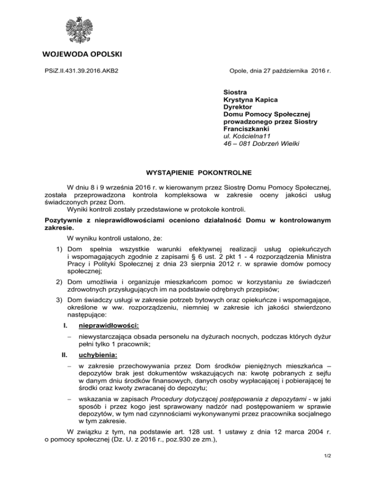 WOJEWODA OPOLSKI PSiZ.II.431.39.2016.AKB2 Opole, dnia 27 października 2016 r. Siostra Krystyna Kapica Dyrektor Domu Pomocy Społecznej prowadzonego przez Siostry Franciszkanki ul. Kościelna11 46 – 081 Dobrzeń Wielki WYSTĄPIENIE POKONTROLNE W dniu 8 i 9 września 2016 r. w kierowanym przez Siostrę Domu Pomocy Społecznej, została przeprowadzona kontrola kompleksowa w zakresie oceny jakości usług świadczonych przez Dom. Wyniki kontroli zostały przedstawione w protokole kontroli. Pozytywnie z nieprawidłowościami oceniono działalność Domu w kontrolowanym zakresie. W wyniku kontroli ustalono, że: 1) Dom spełnia wszystkie warunki efektywnej realizacji usług opiekuńczych i wspomagających zgodnie z zapisami § 6 ust. 2 pkt 1 - 4 rozporządzenia Ministra Pracy i Polityki Społecznej z dnia 23 sierpnia 2012 r. w sprawie domów pomocy społecznej; 2) Dom umożliwia i organizuje mieszkańcom pomoc w korzystaniu ze świadczeń zdrowotnych przysługujących im na podstawie odrębnych przepisów; 3) Dom świadczy usługi w zakresie potrzeb bytowych oraz opiekuńcze i wspomagające, określone w ww. rozporządzeniu, niemniej w zakresie ich jakości stwierdzono następujące: I. nieprawidłowości: II. niewystarczająca obsada personelu na dyżurach nocnych, podczas których dyżur pełni tylko 1 pracownik; uchybienia: w zakresie przechowywania przez Dom środków pieniężnych mieszkańca – depozytów brak jest dokumentów wskazujących na: kwotę pobranych z sejfu w danym dniu środków finansowych, danych osoby wypłacającej i pobierającej te środki oraz kwoty zwracanej do depozytu; wskazania w zapisach Procedury dotyczącej postępowania z depozytami - w jaki sposób i przez kogo jest sprawowany nadzór nad postępowaniem w sprawie depozytów, w tym nad czynnościami wykonywanymi przez pracownika socjalnego w tym zakresie. W związku z tym, na podstawie art. 128 ust. 1 ustawy z dnia 12 marca 2004 r. o pomocy społecznej (Dz. U. z 2016 r., poz.930 ze zm.), 1/2 zalecam: 1) niezwłoczne zapewnienie mieszkańcom Domu odpowiedniej opieki w porze uwzględniając co najmniej dwuosobową obsadę dyżurów nocnych, a tym zagwarantowanie im poczucia bezpieczeństwa, którego obowiązek z art. 55 ust. 2 ustawy z dnia 12 marca 2004 r. o pomocy społecznej (Dz.U. z poz.930); nocnej, samym wynika 2016 r., 2) wprowadzenie do dokumentacji Domu - uwzględniając obowiązek, dotyczący zapewnienia przez Dom bezpiecznego przechowywania środków pieniężnych i przedmiotów wartościowych, wskazany w § 5 ust. 1 pkt 3 lit. h rozporządzenia Ministra Pracy i Polityki Społecznej z dnia 23 sierpnia 2012 r. w sprawie domów pomocy społecznej dokumentów wskazujących na: kwotę pobranych z sejfu w danym dniu środków finansowych, danych osoby wypłacającej i pobierającej te środki oraz kwoty zwracanej do depozytu; 3) uszczegółowienie Procedury dotyczącej postępowania z depozytami w zakresie sposobu prowadzenia nadzoru nad postępowaniem z depozytami mieszkańców. Informację o sposobie wykonania zaleceń należy przedłożyć w terminie 30 dni od dnia otrzymania niniejszego wystąpienia. Zgodnie z art. 128 ust. 2 ustawy o pomocy społecznej jednostka kontrolowana może w terminie 7 dni od dnia otrzymania zaleceń pokontrolnych, zgłosić do nich zastrzeżenia. Z up. Wojewody Opolskiego Dorota Rutkowska Zastępca Dyrektora Wydziału Polityki Społecznej i Zdrowia Do wiadomości: Prowincja Polska Zgromadzenia Sióstr Pielęgniarek Trzeciego Zakonu Regularnego św. Franciszka ul. Kłodzka 25 57-360 Ołdrzychowice Kłodzkie 2/2