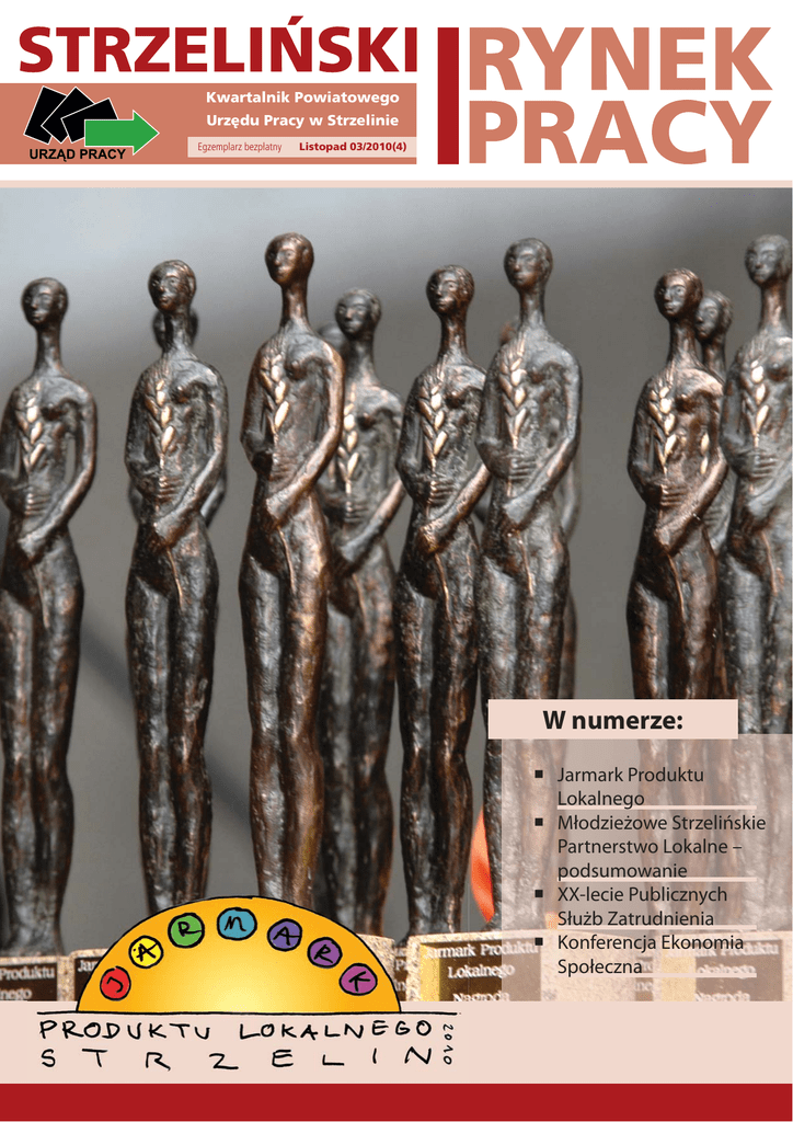Kwartalnik Powiatowego Urzêdu Pracy w Strzelinie Egzemplarz bezp³atny Listopad 03/2010(4) W numerze: Jarmark Produktu Lokalnego Młodzieżowe Strzelińskie Partnerstwo Lokalne – podsumowanie XX-lecie Publicznych Służb Zatrudnienia Konferencja Ekonomia Społeczna 03/2010(4) Kwartalnik Powiatowego Urzêdu Pracy w Strzelinie Szanowni Państwo! Zapraszam do przeczytania czwartego numeru kwartalnika Powiatowego Urzędu Pracy w Strzelinie – Strzeliński Rynek Pracy. Polecam relację z Jarmarku Produktu Lokalnego – pierwszego tego typu przedsięwzięcia na terenie naszego powiatu zorganizowanego przez Starostwo Powiatowe w Strzelinie, gminy i PUP. Zachęcam do przeczytania materiału podsumowującego pracę uczniów szkół ponadgimanzjalnych w ramach Młodzieżowego Strzelińskiego Partnerstwa Lokalnego. Kontynuujemy cykl Dotacje – dobre praktyki, w którym prezentujemy Państwu przedsiębiorców, którzy po otrzymaniu dotacji z urzędu pracy rozpoczęli działalność gospodarczą. Dodatkowo w numerze znajdziecie Państwo informacje na temat projektu Liga Mikroprzedsiębiorców, obchodów XX-lecia Publicznych Służb Zatrudnienia oraz konferencji dotyczącej Ekonomii Społecznej. Życzę miłej lektury. Dyrektor Powiatowego Urzędu Pracy w Strzelinie 1 03/2010(4) Kwartalnik Powiatowego Urzêdu Pracy w Strzelinie Spis treœci 12 -13 1 Młodzieżowe Strzelińskie Partnerstwo Lokalne 19 Klub pracy Wstęp 3-4 Dotacje – dobre praktyki 14 - 15 Projekt „Aktywna integracja naszą szansą” 20 Zielona Linia Razem oszczędniej – akcja wspólnego dojeżdżania do pracy 5-6 Liga Mikroprzedsiębiorców 16 - 17 XX-lecie Publicznych Służb Zatrudnienia Jubileusz Publicznych Służb Zatrudnienia 7 - 11 Jarmark Produktu Lokalnego Trwają zapisy do udziału w konkursie na najlepszy produkt oraz zapisy wystawców do prezentowania i sprzedaży swoich wyrobów podczas Jarmarku. Zapraszamy! 18 Konferencja „Perspektywy rozwoju ekonomii społecznej w powiecie strzelińskim” 21 Niezbędnik osoby bezrobotnej Informacje na temat dodatku aktywizacyjnego, pomocy prawnej udzielanej w PUP w Strzelinie dla osób bezrobotnych oraz Punktu Aktywizacji Zawodowej Niepełnosprawnych. 22 Kontakt 2 03/2010(4) Kwartalnik Powiatowego Urzêdu Pracy w Strzelinie Dotacje – dobre praktyki TADEUSZ CZACHOROWSKI: Podjąłem działalność gospodarczą typu prowadzenie pola paintballowego i wypożyczania sprzętu do gry, zajmuję się także organizowaniem imprez z tej dziedziny. Zapotrzebowanie na prowadzenie tego rodzaju działalności zauważyłem biorąc udział w różnego rodzaju zawodach organizowanych poza terenem powiatu strzelińskiego. Po kalkulacji kosztów stwierdziłem, że jest to działalność dochodowa a dodatkowo, nikt wcześniej nie zauważył potrzeby stworzenia podobnej instytucji w naszym mieście. Jednak bez środków, które uzyskałem z urzędu pracy nie byłbym w stanie otworzyć mojej firmy, gdyż banki nie chętnie udzielają kredytów dla tak innowacyjnych pomysłów. Dotacja pokryła 75% moich wydatków i umożliwiła mi pracę na tzw. „własny rachunek”. Dodatkowo pozwoliło mi to na po- dzałam te wyroby dla siebie oraz rodziny i uznałam, że jest to dobry pomysł na działalność gospodarczą. Uważam, że w prowadzeniu własnej firmy niezbędne jest zbadanie potrzeb klientów. Poznając je, mogłam sprowadzić asortyment, dzięki któremu zdobyłam stały rynek klientów. Co nie oznacza, że przestałam się interesować potrzebami moich klientów. Ciągle się rozwijam, dążę do tego by stać się jeszcze lepszym przedsiębiorcą. Dotacja pomogła mi zrealizować moje plany, i choć jak to w handlu, bywa różnie i czasami trzeba poczekać, to myślę, że bycie wytrwałym i konsekwentnym sprawia, że każdy pomysł w przyszłości owocuje odpowiednimi efektami. ZUZANNA ŚLIWIŃSKA: Prowadzę działalność – usługi krawieckie (szycie na wymiar, drobne poprawki krawieckie itd.) Środki jakie otrzymałam z Funduszu Pracy w 70% umożliwiły mi prowadzenie mojego zakładu. W innym przypadku nie byłabym w stanie podjąć się prowadzenia tej działalności, gdyż nie posiadałam innego źródła finansowania. Byłam osobą bezrobotną, zwolnioną z pracy z powodu likwidacji zakładu pracy. łączenie moich zainteresowań oraz pasji z działalnością dochodową, na co nie każdy człowiek może sobie pozwolić. Osobiście uważam, że warto korzystać ze środków z urzędu pracy, gdyż działalność prowadzona przeze mnie wymaga ode mnie systematyczności, a także umiejętnego gospodarowania czasem jaki posiadam. DANUTA BUŁGAJEWSKA: Otworzyłam sklep wielobranżowy „Joanna” z chemią i kosmetykami niemieckimi w Strzelinie. Dotacja jaką uzyskałam pomogła mi w 50 %, mogłam kupić wyposażenie sklepu i pomimo że musiałam mieć spory wkład własny za zakup towaru, bez dotacji byłoby mi ciężko zaistnieć na lokalnym rynku. Inspiracją do stworzenia tego rodzaju działalności były przeprowadzone przeze mnie wśród znajomych badania. Od dawna panuje przekonanie, że chemia niemiecka jest dobra jakościowo i popularna wśród mieszkańców miasta. Często szukają oni tych produktów, lecz mają utrudniony dostęp do nich. Sama sprowa3 Postawiłam na zakład krawiecki, gdyż z tym fachem wiąże się się moje wykształcenie oraz ponad dziesięcioletni staż pracy. Wzmocniło to moje przekonanie, że pomysł jest realny i ma szanse na realizację. Kwartalnik Powiatowego Urzêdu Pracy w Strzelinie W obecnej sytuacji zmieniłam miejsce wykonywania moich usług, i dlatego na nowo muszę pozyskać klientów, lecz nie jest to czynnik, który w jakiś sposób mnie martwi. Skoro raz mi się udało, to myślę, że bez problemu dam sobie radę po raz drugi. Muszę jedynie zainwestować więcej w reklamę. Uważam, że silnym punktem mojego zakładu jest wypracowana przeze mnie „marka”, dlatego nie zdecyduję się na zatrudnienie kolejnej osoby, z obawy na jej utra