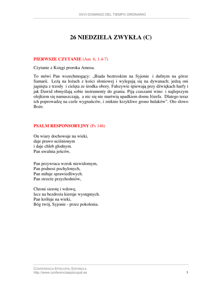 XXVI DOMINGO DEL TIEMPO ORDINARIO 26 NIEDZIELA ZWYKŁA (C) PIERWSZE CZYTANIE (Am 6, 1.4-7) Czytanie z Księgi proroka Amosa. To mówi Pan wszechmogący: „Biada beztroskim na Syjonie i dufnym na górze Samarii. Leżą na łożach z kości słoniowej i wylegują się na dywanach; jedzą oni jagnięta z trzody i cielęta ze środka obory. Fałszywie śpiewają przy dźwiękach harfy i jak Dawid obmyślają sobie instrumenty do grania. Piją czaszami wino i najlepszym olejkiem się namaszczają, a nic się nie martwią upadkiem domu Józefa. Dlatego teraz ich poprowadzę na czele wygnańców, i zniknie krzykliwe grono hulaków”. Oto słowo Boże. PSALM RESPONSORYJNY (Ps 146) On wiary dochowuje na wieki, daje prawo uciśnionym i daje chleb głodnym. Pan uwalnia jeńców, Pan przywraca wzrok niewidomym, Pan podnosi pochylonych, Pan miłuje sprawiedliwych. Pan strzeże przychodniów, Chroni sierotę i wdowę, lecz na bezdroża kieruje występnych. Pan króluje na wieki, Bóg twój, Syjonie - przez pokolenia. CONFERENCIA EPISCOPAL ESPAÑOLA http://www.conferenciaepiscopal.es 1 XXVI DOMINGO DEL TIEMPO ORDINARIO DRUGIE CZYTANIE (1 Tm 6, 11-16) Czytanie z Pierwszego Listu świętego Pawła Apostola do Tymoteusza.. Ty natomiast, o człowiecze Boży, uciekaj od tego rodzaju rzeczy, a podążaj za sprawiedliwością, pobożnością, wiarą, miłością, wytrwałością, łagodnością! Walcz w dobrych zawodach o wiarę, zdobądź życie wieczne: do niego zostałeś powołany i [o nim] złożyłeś dobre wyznanie wobec wielu świadków. Nakazuję w obliczu Boga, który ożywia wszystko, i Chrystusa Jezusa - Tego, który złożył dobre wyznanie za Poncjusza Piłata – ażebyś zachował przykazanie nieskalane, bez zarzutu aż do objawienia się naszego Pana, Jezusa Chrystusa. Ukaże je, we właściwym czasie, błogosławiony i jedyny Władca, Król królujących i Pan panujących, jedyny, mający nieśmiertelność, który zamieszkuje światłość niedostępną, którego żaden z ludzi nie widział ani nie może zobaczyć: Jemu cześć i moc wiekuista! Amen. Oto słowo Boże EWANGELIA (Lk 16, 19-31) Słowa Ewangelii według świętego Łukasza. Jezus powiedział do faryzeuszów: Żył pewien człowiek bogaty, który ubierał się w purpurę i bisior i dzień w dzień świetnie się bawił. U bramy jego pałacu leżał żebrak okryty wrzodami, imieniem Łazarz. Pragnął on nasycić się odpadkami ze stołu bogacza; nadto i psy przychodziły i lizały jego wrzody. Umarł żebrak, i aniołowie zanieśli go na łono Abrahama. Umarłtakże bogacz i został pogrzebany. Gdy w Otchłani, pogrążony w mękach, podniósł oczy, ujrzał z daleka Abrahama i Łazarza na jego łonie. I zawołał: "Ojcze Abrahamie, ulituj się nade mną i poślij Łazarza; niech koniec swego palca umoczy w wodzie i ochłodzi mój język, bo strasznie cierpię w tym płomieniu". Lecz Abraham odrzekł: "Wspomnij, synu, że za życia otrzymałeś swoje dobra, a Łazarz przeciwnie, niedolę; teraz on tu doznaje pociechy, a ty męki cierpisz. A prócz tego między nami a wami zionie ogromna przepaść, tak że nikt, choćby chciał, stąd do was przejść nie może ani stamtąd do nas się przedostać". Tamten rzekł: "Proszę cię więc, ojcze, poślij go do domu mojego ojca! Mam bowiem pięciu braci: niech ich przestrzeże, żeby i oni nie przyszli na to miejsce męki". Lecz Abraham odparł: "Mają Mojżesza i Proroków, niechże ich słuchają!" "Nie, ojcze Abrahamie odrzekł tamten - lecz gdyby kto z umarłych poszedł do nich, to się nawrócą". Odpowiedział mu: "Jeśli Mojżesza i Proroków nie słuchają, to choćby kto z umarłych powstał, nie uwierzą"». Oto słowo Pańskie. CONFERENCIA EPISCOPAL ESPAÑOLA http://www.conferenciaepiscopal.es 2