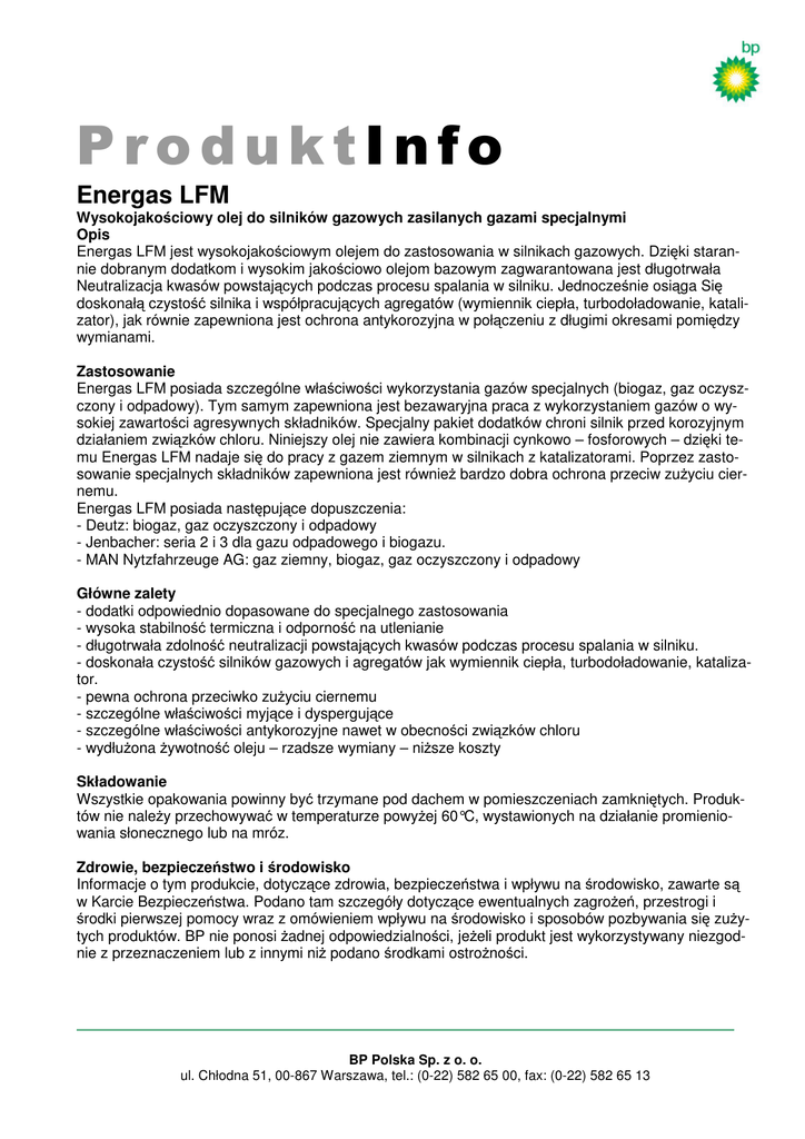 Energas LFM Wysokojako ciowy olej do silników gazowych zasilanych gazami specjalnymi Opis Energas LFM jest wysokojako ciowym olejem do zastosowania w silnikach gazowych. Dzi ki starannie dobranym dodatkom i wysokim jako ciowo olejom bazowym zagwarantowana jest długotrwała Neutralizacja kwasów powstaj cych podczas procesu spalania w silniku. Jednocze nie osi ga Si doskonał czysto silnika i współpracuj cych agregatów (wymiennik ciepła, turbodoładowanie, katalizator), jak równie zapewniona jest ochrona antykorozyjna w poł czeniu z długimi okresami pomi dzy wymianami. Zastosowanie Energas LFM posiada szczególne wła ciwo ci wykorzystania gazów specjalnych (biogaz, gaz oczyszczony i odpadowy). Tym samym zapewniona jest bezawaryjna praca z wykorzystaniem gazów o wysokiej zawarto ci agresywnych składników. Specjalny pakiet dodatków chroni silnik przed korozyjnym działaniem zwi zków chloru. Niniejszy olej nie zawiera kombinacji cynkowo – fosforowych – dzi ki temu Energas LFM nadaje si do pracy z gazem ziemnym w silnikach z katalizatorami. Poprzez zastosowanie specjalnych składników zapewniona jest równie bardzo dobra ochrona przeciw zu yciu ciernemu. Energas LFM posiada nast puj ce dopuszczenia: - Deutz: biogaz, gaz oczyszczony i odpadowy - Jenbacher: seria 2 i 3 dla gazu odpadowego i biogazu. - MAN Nytzfahrzeuge AG: gaz ziemny, biogaz, gaz oczyszczony i odpadowy Główne zalety - dodatki odpowiednio dopasowane do specjalnego zastosowania - wysoka stabilno termiczna i odporno na utlenianie - długotrwała zdolno neutralizacji powstaj cych kwasów podczas procesu spalania w silniku. - doskonała czysto silników gazowych i agregatów jak wymiennik ciepła, turbodoładowanie, katalizator. - pewna ochrona przeciwko zu yciu ciernemu - szczególne wła ciwo ci myj ce i dysperguj ce - szczególne wła ciwo ci antykorozyjne nawet w obecno ci zwi zków chloru - wydłu ona ywotno oleju – rzadsze wymiany – ni sze koszty Składowanie Wszystkie opakowania powinny by trzymane pod dachem w pomieszczeniach zamkni tych. Produktów nie nale y przechowywa w temperaturze powy ej 60°C, wystawionych na działanie promieniowania słonecznego lub na mróz. Zdrowie, bezpiecze stwo i rodowisko Informacje o tym produkcie, dotycz ce zdrowia, bezpiecze stwa i wpływu na rodowisko, zawarte s w Karcie Bezpiecze stwa. Podano tam szczegóły dotycz ce ewentualnych zagro e , przestrogi i rodki pierwszej pomocy wraz z omówieniem wpływu na rodowisko i sposobów pozbywania si zu ytych produktów. BP nie ponosi adnej odpowiedzialno ci, je eli produkt jest wykorzystywany niezgodnie z przeznaczeniem lub z innymi ni podano rodkami ostro no ci. BP Polska Sp. z o. o. ul. Chłodna 51, 00-867 Warszawa, tel.: (0-22) 582 65 00, fax: (0-22) 582 65 13 Energas LFM Dane techniczne Metoda badania G sto w 15 °C DIN 51757 Lepko kinematyczna DIN 51 562 W 40 °C W 100 °C Wska nik lepko ci DIN ISO 2909 Temperatura zapłonu (COC) DIN ISO 2592 Temperatura krzepni cia DIN ISO 3016 Liczba kwasowa DIN ISO 3771 Zawarto popiołów siarkowych DIN 51 575 M.Klasa SAE DIN 51 511 Jednostka 3 Wynik kg/m 890 2 121 13 100 250 -18 7,2 mm /s 2 mm /s °C °C mg KOH/g % 0,7 40 2005-09-26/MG BP Polska Sp. z o. o. ul. Chłodna 51, 00-867 Warszawa, tel.: (0-22) 582 65 00, fax: (0-22) 582 65 13