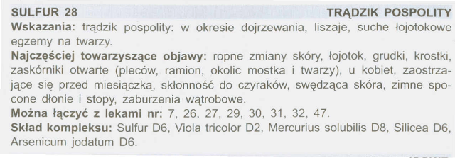SULFUR 28 TRĄDZIK POSPOLITY Wskazania: trądzik pospolity: w okresie dojrzewania, liszaje, suche łojotokowe egzemy na twarzy. Najczęściej towarzyszące objawy: ropne zmiany skóry, łojotok, grudki, krostki, zaskórniki otwarte (pleców, ramion, okolic mostka i twarzy), u kobiet, zaostrzające się przed miesiączką, skłonność do czyraków, swędząca skóra, zimne spocone dłonie i stopy, zaburzenia wątrobowe. Można łączyć z lekami nr: 7, 26, 27, 29, 3D, 31, 32, 47. Skład kompleksu: Sulfur D6, Viola tricolor D2, Mercurius solubilis D8, Silicea D6, Arsenicum jodatum D6.
