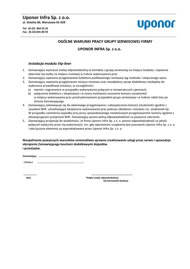 Uponor Infra Sp. z o.o. ul. Dzielna 60, Warszawa 01-029 Tel: (0-22) 864 52 25 Fax: (0-22) 835 00 59 OGÓLNE WARUNKI PRACY GRUPY SERWISOWEJ FIRMY UPONOR INFRA Sp. z o.o. Instalacja modułu Vip-liner 1. 2. 3. 4. 5. Zamawiający wyznacza osobę odpowiedzialną za kontakty z grupą serwisową na miejscu budowy i zapewnia obecność tej osoby na miejscu instalacji w trakcie wykonywania prac. Zamawiający zapewnia przygotowanie kolektora poddawanego renowacji wg rozdziału I załączonego opisu. Zamawiający zapewnia przygotowane miejsce montażu oraz nieodpłatny sprzęt dodatkowy niezbędny do wykonania prawidłowej instalacji, w szczególności: a) namiot i nagrzewnice w przypadku wykonywania połączeń w temperaturach ujemnych, b) wyłączenie kolektora z eksploatacji i w miarę możliwości osuszenie komory (studzienki) w miejscu wykonywania prac przed planowanym przyjazdem grupy serwisowej i w trakcie robót leży po stronie Zamawiającego. Zamawiający zobowiązuje się do właściwego przygotowania i zabezpieczenia komory (studzienki) zgodnie z zasadami BHP, umożliwiające bezpieczne wykonywanie prac podczas układania i montażu rur, studzienek itp. W przypadku zaistnienia wypadku przy pracy spowodowanego niewłaściwym przygotowaniem komory zgodnie z obowiązującymi przepisami BHP, Zamawiający ponosi pełną odpowiedzialność za powyższe zdarzenie. Zamawiający przyjmuje do wiadomości, że firma Uponor Infra Sp. z o. o. ponosi odpowiedzialność za jakość połączeń wyłącznie przez nią wykonanych, tzn. gdy operatorem urządzenia jest pracownik Uponor Infra Sp. z o. o. i oba łączone elementy są wyprodukowane przez Uponor Infra Sp. z o. o. Niespełnienie powyższych warunków uniemożliwia sprawne zrealizowanie usługi przez serwis i spowoduje obciążenie Zamawiającego kosztami dodatkowymi dojazdów i przestojów. Zamawiający ...................................................................... ( Firma ) ............... data ..................................................................... .............................................. Podpis osoby odpowiedzialnej lub kierownika budowy