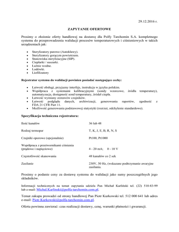 29.12.2016 r. ZAPYTANIE OFERTOWE Prosimy o złożenie oferty handlowej na dostawę dla Polfy Tarchomin S.A. kompletnego systemu do przeprowadzenia walidacji procesów temperaturowych i ciśnieniowych w takich urządzeniach jak: Sterylizatory parowe (Autoklawy). Sterylizatory gorącym powietrzem. Stanowiska sterylizacyjne (SIP). Cieplarki / suszarki. Łaźnie wodne. Lodówki. Liofilizatory Rejestrator systemu do walidacji powinien posiadać następujące cechy: Łatwość obsługi, przyjazny interfejs, instrukcja w języku polskim. Współpraca z systemami kalibracyjnymi (sondy wzorcowe, źródła temperatury), automatyzacja, dostępność sond temperatury, źródeł ciepła. Łatwość wymiany zestawów czujników. Łatwość podglądu danych, archiwizacji, generowania raportów, zgodność z FDA 21 CFR Part 11. Możliwość generowania podstawowej statystyki (rozrzut, odchylenie standardowe). Specyfikacja techniczna rejestratora: Ilość kanałów 36 lub 48 Rodzaj termopar T, K, J, E, B, R, N, S Czujniki oporowe (opcjonalnie) Pt100, Pt1000 Współpraca z przetwornikami ciśnienia (prądowe i napięciowe) 4 - 20 mA; Częstotliwość skanowania 48 kanałów co 2 sek Zasilanie 230V, 50 Hz, (wskazane podtrzymanie awaryjne zasilania. 0 - 10 V Prosimy o podanie ceny za dostawę systemu do walidacji jako sumy poszczególnych jego składników. Informacji technicznych na temat zapytania udziela Pan Michał Karliński tel. (22) 510-83-99 lub e-mail: [email protected]. Temat zakupu prowadzi od strony handlowej Pan Piotr Kurkowski tel. 512 000 641 lub adres e-mail: [email protected]. Oferta powinna zawierać: czas realizacji dostawy, cenę, warunki płatności i gwarancji. Ofertę prosimy przesyłać lub składać w Kancelarii Polfa Tarchomin S.A., ul. A. Fleminga 2, 03-176 Warszawa z dopiskiem na kopercie „System do walidacji - 2100” w terminie do dnia 16 stycznia 2017 r. Tarchomińskie Zakłady Farmaceutyczne „Polfa” S.A. zastrzegają sobie prawo do odstąpienia od postępowania ofertowego bez podania przyczyny, swobodnego wyboru oferty oraz podjęcia dodatkowych negocjacji i uzgodnień.