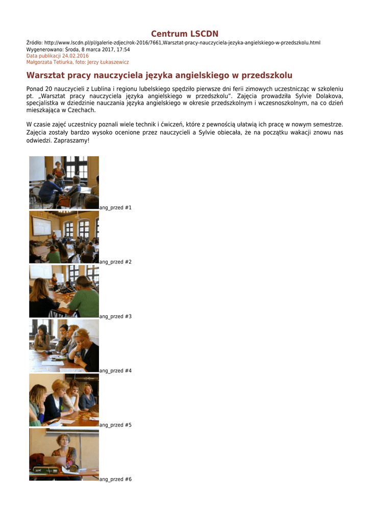 Centrum LSCDN Źródło: http://www.lscdn.pl/pl/galerie-zdjec/rok-2016/7661,Warsztat-pracy-nauczyciela-jezyka-angielskiego-w-przedszkolu.html Wygenerowano: Środa, 8 marca 2017, 17:54 Data publikacji 24.02.2016 Małgorzata Tetiurka, foto: Jerzy Łukaszewicz Warsztat pracy nauczyciela języka angielskiego w przedszkolu Ponad 20 nauczycieli z Lublina i regionu lubelskiego spędziło pierwsze dni ferii zimowych uczestnicząc w szkoleniu pt. „Warsztat pracy nauczyciela języka angielskiego w przedszkolu”. Zajęcia prowadziła Sylvie Dolakova, specjalistka w dziedzinie nauczania języka angielskiego w okresie przedszkolnym i wczesnoszkolnym, na co dzień mieszkająca w Czechach. W czasie zajęć uczestnicy poznali wiele technik i ćwiczeń, które z pewnością ułatwią ich pracę w nowym semestrze. Zajęcia zostały bardzo wysoko ocenione przez nauczycieli a Sylvie obiecała, że na początku wakacji znowu nas odwiedzi. Zapraszamy! ang_przed #1 ang_przed #2 ang_przed #3 ang_przed #4 ang_przed #5 ang_przed #6 ang_przed #7 ang_przed #8 ang_przed #9 ang_przed #10 ang_przed #11 ang_przed #12 ang_przed #13 ang_przed #14 ang_przed #15 ang_przed #16