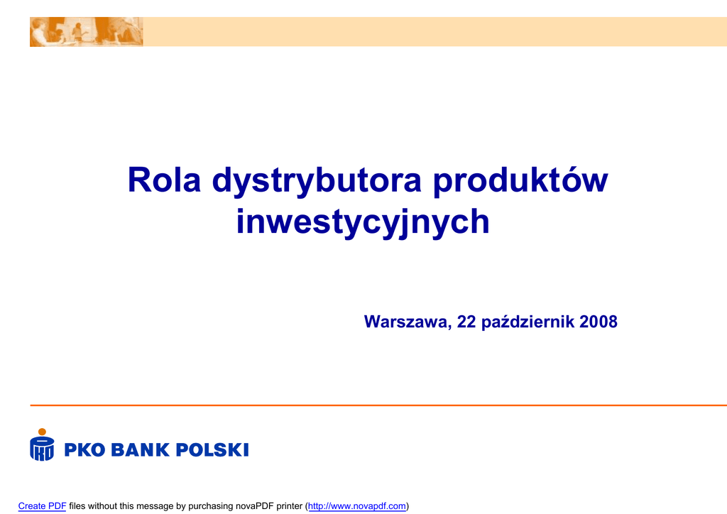 Rola dystrybutora produktów inwestycyjnych Warszawa, 22 październik 2008 Create PDF files without this message by purchasing novaPDF printer (http://www.novapdf.com) Sukces zależy od umiejętności rozpoznawania i zaspokajania potrzeb klienta Co skłoniło klienta do inwestycji? Znaczenie doradztwa finansowego 74% Dobre wyniki Niskie oprocentowanie depozytów Reklama 94 26% Zachęta banku 199 25 000 instytucji finansowych 5% coraz większego 21% 14% profesjonalizmu w 7% zakresie wyboru 83% Dlaczego klient nie korzysta z produktów inwestycyjnych? odpowiedniej strategii inwestycyjnej 95% 79% • Wraz ze zwiększającą się złożonością, Brak doświadczenia i wiedzy 46% konkurencyjnością, 17% Brak środków 30% Obawa przed ryzykiem 24% Nieumiejętność wyboru funduszu 22% Zbyt długi horyzont inwestycji • Polacy oczekują od 6% substytucyjnością i kompleksowością usług Polska 2001 Polska 2005 Europa 2005 rośnie znaczenie aktywnej roli Samodzielne zarządzanie Zarządzanie przez specjalistów Liczba funduszy Źródło: Banking in the Changing World, McKinsey&Co., Qualifact 2007 Create PDF files without this message by purchasing novaPDF printer (http://www.novapdf.com) dystrybutora 2 Aktywne doradztwo – obowiązek regulacyjny czy przewaga konkurencyjna AKTYWNE DORADZTWO • Proces profilowania oparty o indywidualne gromadzone dane o kliencie umożliwia Profilowanie klienta Wybór strategii produktu określenie oczekiwań inwestycyjnych klienta • Analiza skłonności do ryzyka • Cechy produktu • Analiza możliwości podjęcia ryzyka • Ryzyko związane z produktem klienta zamieniane są w • Cel finansowy – ujęcie ilościowe • Oczekiwany zwrot z inwestycji umiejętnie wybierającą • Cel finansowy – ujęcie jakościowe • Umiejscowienie produktu w sytuacji makroekonomicznej spośród substytucyjnej oferty • Horyzont czasowy • Indywidualne preferencje • Oczekiwania inwestycyjne adekwatną ofertę produktowa najwłaściwsze produkty rynkowej • Obsługa posprzedażowa oparta o system „alarmów” System alarmowy wychodzi naprzeciw wyzwaniom zmiennego rynku • Sukces gwarantuje kooperacja wielu komórek Indywidualna strategia finansowa dla klienta specjalistycznych wspartych technologia informatyczną Źródło: PKO BP, Credit Suisse AM Create PDF files without this message by purchasing novaPDF printer (http://www.novapdf.com) 3 Dlaczego mamy inwestować w proces doradczy? Włochy 2005 – case study Wielkość rynku mld EUR Zamknięta i skostniała architektura związana z dużą siecią dystrybucji Zamknięta architektura nastawiona na wyniki i rozwój produktu Butiki funduszy inwestycyjnych 46 32 18 Wzrost, % AuM Aktywa Wynik operacyjny Sprzedaż -3 -5 11 bp na aktywach Tracą klientów ze względu na pasywną postawę dystrybucji 9 5 14 8 36 38 Zyskują klientów i zaufanie do dystrybutora Szybki rozwój związany z elastyczną i otwarta architekturą Aktywna rola dystrybutora przykłada się na wyniki finansowe Źródło: McKinsey European AM Survey, 2005 4 Create PDF files without this message by purchasing novaPDF printer (http://www.novapdf.com) Wnioski • Klienci wraz z pogłębiającym się rynkiem okresie będą oczekiwali coraz więcej od dystrybutora produktów • Kompleksowość doradztwa finansowego daje instytucji przewagę konkurencyjną • Im większa aktywna rola dystrybutora tym większy obszar jego wzrostu 5 Create PDF files without this message by purchasing novaPDF printer (http://www.novapdf.com)
