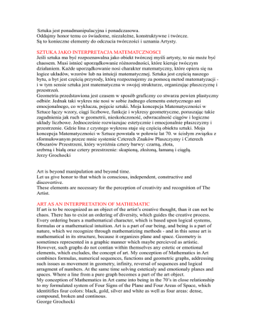 Sztuka jest ponadmanipulacyjna i ponadczasowa. Oddajmy honor temu co świadome, niezależne, konstruktywne i twórcze. Są to konieczne elementy do odczucia twórczości i uznania Artysty. SZTUKA JAKO INTERPRETACJA MATEMATCZNOSCI Jeśli sztuka ma być rozpoznawalna jako obiekt twórczej myśli artysty, to nie może być chaosem. Musi istnieć uporządkowanie różnorodności, które kieruje twóczym działaniem. Każde uporządkowanie nosi charakter matematyczny, które opiera się na logice układów, wzorów lub na intuicji matematycznej. Sztuka jest częścią naszego bytu, a byt jest częścią przyrody, którą rozpoznajemy za pomocą metod matematyzacji i w tym sensie sztuka jest matematyczna w swojej strukturze, organizując płaszczyznę i przestrzeń. Geometria przedstawiona jest czasem w sposób graficzny co stwarza pewien plastyczny odbiór. Jednak taki wykres nie nosi w sobie żadnego elementu estetycznego ani emocjonalnego, co wyklucza, pojęcie sztuki. Moja koncepcja Matematyczności w Sztuce łączy wzory, ciągi liczbowe, funkcje i wykresy geometryczne, poruszając takie zagadnienia jak ruch w geometrii, nieskończoność, odwracalność ciągów i logiczne układy liczbowe. Jednocześnie rozwiazujac estetycznie i emocjonalnie płaszczyzny i przestrzenie. Gdzie lina z czystego wykresu staje się częścią obiektu sztuki. Moja koncepcja Matematyczności w Sztuce powstała w połowie lat 70. w ścisłym związku z sformułowanym przeze mnie systemie Czterech Znaków Płaszczyzny i Czterech Obszarów Przestrzeni, który wyróżnia cztery barwy: czarną, złota, srebrną i białą oraz cztery przestrzenie: skupioną, złożoną, łamaną i ciągłą. Jerzy Grochocki Art is beyond manipulation and beyond time. Let us give honor to that which is conscious, independent, constructive and discovertive. These elements are necessary for the perception of creativity and recognition of The Artist. ART AS AN INTERPRETATION OF MATHEMATIC If art is to be recognized as an object of the artist’s creative thought, than it can not be chaos. There has to exist an ordering of diversity, which guides the creative process. Every ordering bears a mathematical character, which is based upon logical systems, formulas or a mathematical intuition. Art is a part of our being, and being is a part of nature, which we recognize through mathematizing methods - and in this sense art is mathematical in its structure, because it organizes plane and space. Geometry is sometimes represented in a graphic manner which maybe percieved as artistic. However, such graphs do not contian within themselves any estetic or emotional elements, which excludes, the concept of art. My conception of Mathematics in Art combines formulas, numerical sequences, functions and geometric graphs, addressing such issues as movement in geometry, infinity, reversal of sequences and logical arragment of numbers. At the same time solving esteticaly and emotionaly planes and spaces. Where a line from a pure graph becomes a part of the art object. My conception of Mathematics in Art came into being in the 70’s in close relationship to my formulated system of Four Signs of the Plane and Four Areas of Space, which identitifies four colors: black, gold, silver and white as well as four areas: dense, compound, broken and continous. George Grochocki