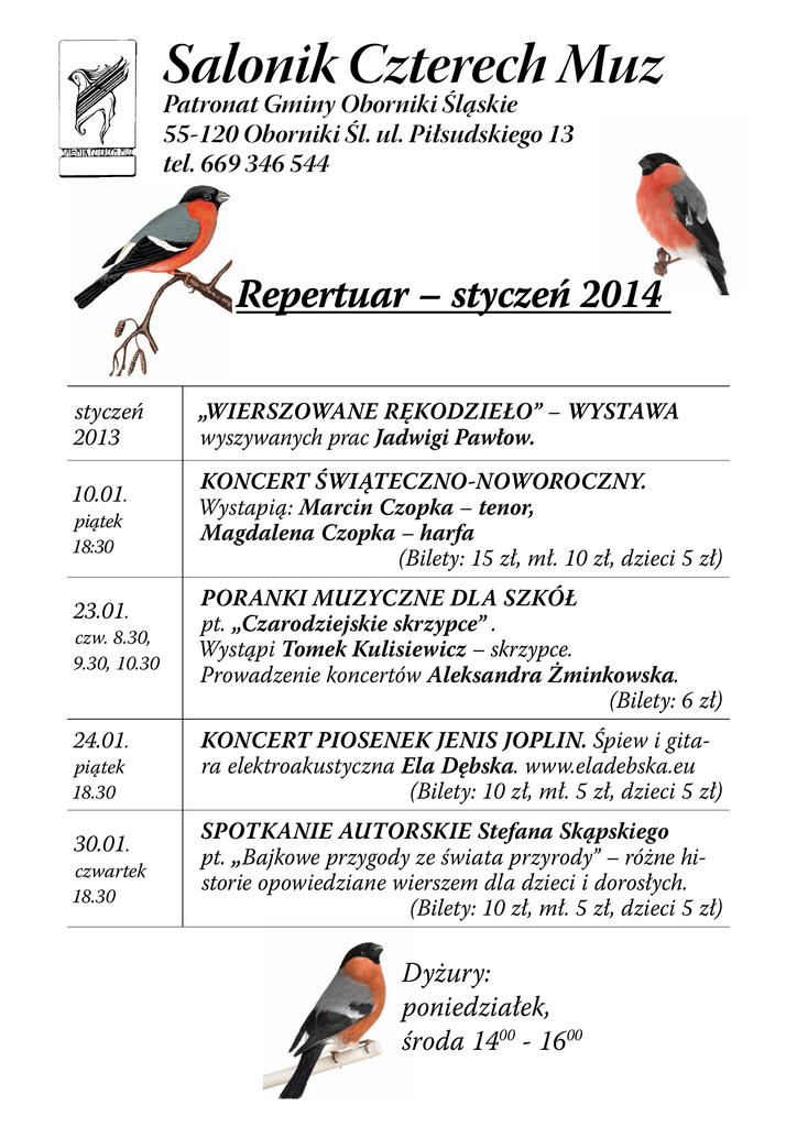 Salonik Czterech Muz Patronat Gminy Oborniki Śląskie 55-120 Oborniki Śl. ul. Piłsudskiego 13 tel. 669 346 544 Repertuar – styczeń 2014 styczeń 2013 10.01. piątek 18:30 23.01. czw. 8.30, 9.30, 10.30 24.01. piątek 18.30 30.01. czwartek 18.30 „Wierszowane rękodzieło” – wystawa wyszywanych prac Jadwigi Pawłow. KONCERT ŚWIĄTECZNO-NOWOROCZNY. Wystapią: Marcin Czopka – tenor, Magdalena Czopka – harfa (Bilety: 15 zł, mł. 10 zł, dzieci 5 zł) Poranki muzyczne dla szkół pt. „Czarodziejskie skrzypce” . Wystąpi Tomek Kulisiewicz – skrzypce. Prowadzenie koncertów Aleksandra Żminkowska. (Bilety: 6 zł) KONCERT PIOSENEK JENIS JOPLIN. Śpiew i gitara elektroakustyczna Ela Dębska. www.eladebska.eu (Bilety: 10 zł, mł. 5 zł, dzieci 5 zł) Spotkanie autorskie Stefana Skąpskiego pt. „Bajkowe przygody ze świata przyrody” – różne historie opowiedziane wierszem dla dzieci i dorosłych. (Bilety: 10 zł, mł. 5 zł, dzieci 5 zł) Dyżury: poniedziałek, środa 1400 - 1600