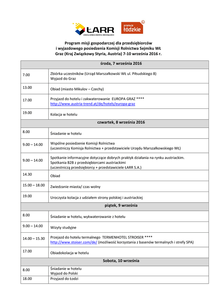 Program misji gospodarczej dla przedsiębiorców i wyjazdowego posiedzenia Komisji Rolnictwa Sejmiku WŁ Graz (Kraj Związkowy Styria, Austria) 7-10 września 2016 r. środa, 7 września 2016 7.00 Zbiórka uczestników (Urząd Marszałkowski WŁ ul. Piłsudskiego 8) Wyjazd do Graz 13.00 Obiad (miasto Mikulov – Czechy) 17.00 Przyjazd do hotelu i zakwaterowanie EUROPA GRAZ **** http://www.austria-trend.at/de/hotels/europa-graz 19.00 Kolacja w hotelu czwartek, 8 września 2016 8.00 Śniadanie w hotelu 9.00 – 14.00 Wspólne posiedzenie Komisji Rolnictwa (uczestniczy Komisja Rolnictwa + przedstawiciele Urzędu Marszałkowskiego WŁ) 9.00 – 14.00 Spotkanie informacyjne dotyczące dobrych praktyk działania na rynku austriackim. Spotkania B2B z przedsiębiorcami austriackimi (uczestniczą przedsiębiorcy + przedstawiciele ŁARR S.A.) 14.30 Obiad 15.00 – 18.00 Zwiedzanie miasta/ czas wolny 19.00 Uroczysta kolacja z udziałem strony polskiej i austriackiej piątek, 9 września 8.00 Śniadanie w hotelu, wykwaterowanie z hotelu 9.00 – 14.00 Wizyty studyjne 14.00 – 15.30 Przejazd do hotelu termalnego TERMENHOTEL STROISER **** http://www.stoiser.com/de/ (możliwość korzystania z basenów termalnych i strefy SPA) 17.00 Obiadokolacja w hotelu Sobota, 10 września 8.00 18.00 Śniadanie w hotelu Wyjazd do Polski Przyjazd do Łodzi