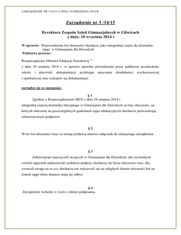 Zarządzenie nr 3 /14/15 Dyrektora Zespołu Szkół Gimnazjalnych w