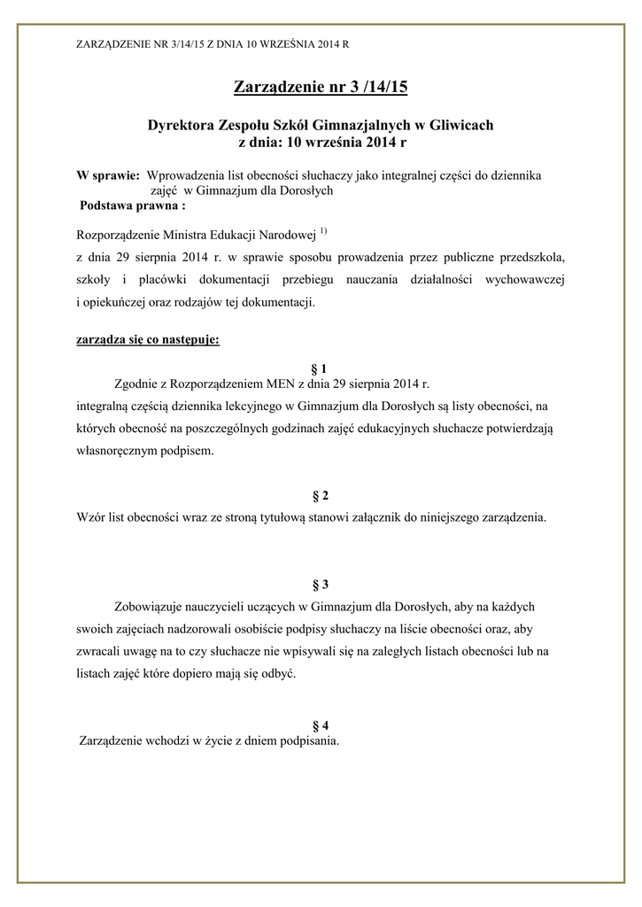 ZARZĄDZENIE NR 3/14/15 Z DNIA 10 WRZEŚNIA 2014 R Zarządzenie nr 3 /14/15 Dyrektora Zespołu Szkół Gimnazjalnych w Gliwicach z dnia: 10 września 2014 r W sprawie: Wprowadzenia list obecności słuchaczy jako integralnej części do dziennika zajęć w Gimnazjum dla Dorosłych Podstawa prawna : Rozporządzenie Ministra Edukacji Narodowej 1) z dnia 29 sierpnia 2014 r. w sprawie sposobu prowadzenia przez publiczne przedszkola, szkoły i placówki dokumentacji przebiegu nauczania działalności wychowawczej i opiekuńczej oraz rodzajów tej dokumentacji. zarządza się co następuje: §1 Zgodnie z Rozporządzeniem MEN z dnia 29 sierpnia 2014 r. integralną częścią dziennika lekcyjnego w Gimnazjum dla Dorosłych są listy obecności, na których obecność na poszczególnych godzinach zajęć edukacyjnych słuchacze potwierdzają własnoręcznym podpisem. §2 Wzór list obecności wraz ze stroną tytułową stanowi załącznik do niniejszego zarządzenia. §3 Zobowiązuje nauczycieli uczących w Gimnazjum dla Dorosłych, aby na każdych swoich zajęciach nadzorowali osobiście podpisy słuchaczy na liście obecności oraz, aby zwracali uwagę na to czy słuchacze nie wpisywali się na zaległych listach obecności lub na listach zajęć które dopiero mają się odbyć. §4 Zarządzenie wchodzi w życie z dniem podpisania. ZARZĄDZENIE NR 3/14/15 Z DNIA 10 WRZEŚNIA 2014 R Zał. LISTA OBECNOŚCI SŁUCHACZY W GIMNAZJUM DLA DOROSŁYCH SEMESTR: ……………………………… KLASA:…………………………………. LISTA OBEJMUJE OBECNOSĆ SŁUCHACZY NA ZAJĘCIACH OD ………………………………………..DO…………………………………… Lista słuchaczy stanowi załącznik do dziennika zajęć lekcyjnych Zgodnie z Rozporządzeniem Ministra Edukacji Narodowej 1) z dnia 29 sierpnia 2014 r. w sprawie sposobu prowadzenia przez publiczne przedszkola, szkoły i placówki dokumentacji przebiegu nauczania działalności wychowawczej i opiekuńczej oraz rodzajów tej dokumentacji ZARZĄDZENIE NR 3/14/15 Z DNIA 10 WRZEŚNIA 2014 R Semestr I – klasa I C rok szkolny 2014/2015 od 1.09.14r. do 31.01.15r. Data zajęć…………………………………….. Przedmiot Wychowawca: mgr Teresa Sawicka Lp. Nazwisko i imię 1 2 3 4 5 Podpis słuchacza potwierdzający obecność na zajęciach 6 ZARZĄDZENIE NR 3/14/15 Z DNIA 10 WRZEŚNIA 2014 R