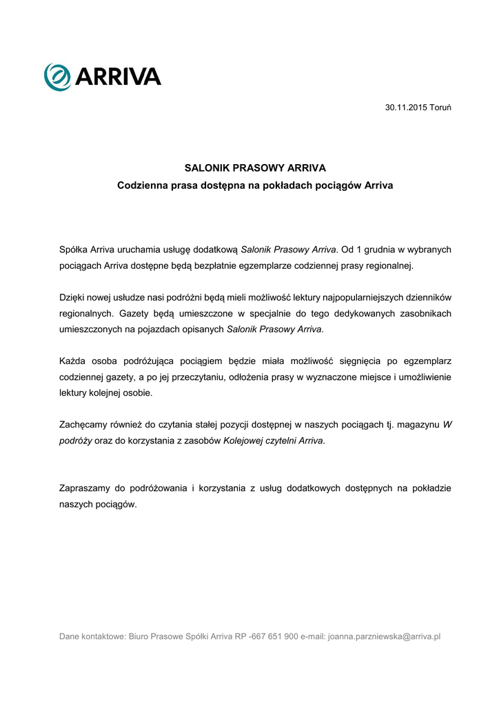 30.11.2015 Toruń SALONIK PRASOWY ARRIVA Codzienna prasa dostępna na pokładach pociągów Arriva Spółka Arriva uruchamia usługę dodatkową Salonik Prasowy Arriva. Od 1 grudnia w wybranych pociągach Arriva dostępne będą bezpłatnie egzemplarze codziennej prasy regionalnej. Dzięki nowej usłudze nasi podróżni będą mieli możliwość lektury najpopularniejszych dzienników regionalnych. Gazety będą umieszczone w specjalnie do tego dedykowanych zasobnikach umieszczonych na pojazdach opisanych Salonik Prasowy Arriva. Każda osoba podróżująca pociągiem będzie miała możliwość sięgnięcia po egzemplarz codziennej gazety, a po jej przeczytaniu, odłożenia prasy w wyznaczone miejsce i umożliwienie lektury kolejnej osobie. Zachęcamy również do czytania stałej pozycji dostępnej w naszych pociągach tj. magazynu W podróży oraz do korzystania z zasobów Kolejowej czytelni Arriva. Zapraszamy do podróżowania i korzystania z usług dodatkowych dostępnych na pokładzie naszych pociągów. Dane kontaktowe: Biuro Prasowe Spółki Arriva RP -667 651 900 e-mail: [email protected]
