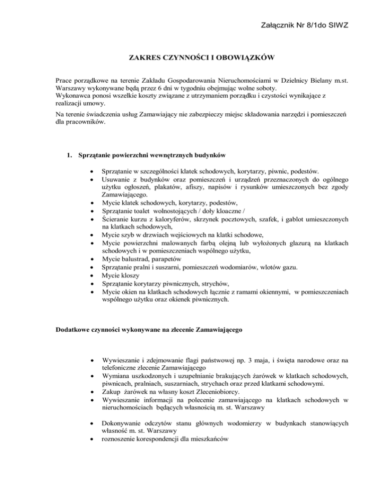 Załącznik Nr 8/1do SIWZ ZAKRES CZYNNOŚCI I OBOWIĄZKÓW Prace porządkowe na terenie Zakładu Gospodarowania Nieruchomościami w Dzielnicy Bielany m.st. Warszawy wykonywane będą przez 6 dni w tygodniu obejmując wolne soboty. Wykonawca ponosi wszelkie koszty związane z utrzymaniem porządku i czystości wynikające z realizacji umowy. Na terenie świadczenia usług Zamawiający nie zabezpieczy miejsc składowania narzędzi i pomieszczeń dla pracowników. 1. Sprzątanie powierzchni wewnętrznych budynków • • • • • • • • • • • • Sprzątanie w szczególności klatek schodowych, korytarzy, piwnic, podestów. Usuwanie z budynków oraz pomieszczeń i urządzeń przeznaczonych do ogólnego użytku ogłoszeń, plakatów, afiszy, napisów i rysunków umieszczonych bez zgody Zamawiającego. Mycie klatek schodowych, korytarzy, podestów, Sprzątanie toalet wolnostojących / doły kloaczne / Ścieranie kurzu z kaloryferów, skrzynek pocztowych, szafek, i gablot umieszczonych na klatkach schodowych, Mycie szyb w drzwiach wejściowych na klatki schodowe, Mycie powierzchni malowanych farbą olejną lub wyłożonych glazurą na klatkach schodowych i w pomieszczeniach wspólnego użytku, Mycie balustrad, parapetów Sprzątanie pralni i suszarni, pomieszczeń wodomiarów, wlotów gazu. Mycie kloszy Sprzątanie korytarzy piwnicznych, strychów, Mycie okien na klatkach schodowych łącznie z ramami okiennymi, w pomieszczeniach wspólnego użytku oraz okienek piwnicznych. Dodatkowe czynności wykonywane na zlecenie Zamawiającego • • • • • • Wywieszanie i zdejmowanie flagi państwowej np. 3 maja, i święta narodowe oraz na telefoniczne zlecenie Zamawiającego Wymiana uszkodzonych i uzupełnianie brakujących żarówek w klatkach schodowych, piwnicach, pralniach, suszarniach, strychach oraz przed klatkami schodowymi. Zakup żarówek na własny koszt Zleceniobiorcy. Wywieszanie informacji na polecenie zamawiającego na klatkach schodowych w nieruchomościach będących własnością m. st. Warszawy Dokonywanie odczytów stanu głównych wodomierzy w budynkach stanowiących własność m. st. Warszawy roznoszenie korespondencji dla mieszkańców 2. Sprzątanie terenów utwardzonych. • • • • Sprzątanie, zamiatanie i usuwanie zanieczyszczeń z chodników, placu zabaw, śmietników, prześwitów, parkingów, jezdni, w nagłych wypadkach w godzinach popołudniowych serwis interwencyjny Napełnianie pojemników śmieciami zalegającymi luzem. Dezynfekcja śmietników nie rzadziej niż raz na 10 dni. Codzienne opróżnianie koszy na śmieci usytuowanych na terenie 3. Sprzątanie terenów zielonych. • • 4. Codzienne usuwanie śmieci i innych zanieczyszczeń ( zgrabki, gałęzie itp.) wraz z wywozem. Na bieżąco informowanie ZGN o zauważonych zagrożeniach ( np. wiatrołomy, przechylonych drzewach i wiszących gałęziach) Pielęgnacja terenów zielonych • • • • • • Grabienie terenów zielonych jak również na bieżąco wywóz zgrabionych zanieczyszczeń. Oczyszczanie krawężników, opasek oraz zagłębień przy budynkach z nieczystości, chwastów itp. Likwidacja przedeptów przez dosiewanie trawy. Zgrabianie i wymiatanie zanieczyszczeń z piaskownic i placów zabaw Przycinanie żywopłotów oraz pielęgnacja krzewów 2 razy do roku (wiosna, jesień) Podlewanie trawników i roślin – w miarę potrzeb- bez zabezpieczenia przez ZGN dostępu do wody Koszenie trawników – dwukrotne pierwsze koszenie – w maju, drugie koszenie - czerwiec/lipiec. • • • • • • Koszenie należy wykonać maksymalnie w czasie 16 dni ( wliczając niedziele i święta) Rozpoczęcie koszenia na wyraźne pisemne zlecenie Zamawiającego Skoszoną trawę należy zgrabić na drugi dzień Skoszoną trawę należy wywieźć w ciągu dwóch dni od dnia jej skoszenia Wykonawca codziennie informuje pisemnie Zamawiającego o planowanym koszeniu trawników i o wykonaniu ww usługi Protokolarny odbiór skoszonej trawy z udziałem Zleceniodawcy i Wykonawcy 2 5. Obowiązki wykonawcy w zakresie spraw technicznych • Podstawowym obowiązkiem Wykonawcy jest dbałość o powierzone budynki, ich wyposażenie, oraz urządzenia techniczne. • Natychmiastowe powiadamianie Zamawiającego o dostrzeżonych uszkodzeniach lub wadliwym działaniu instalacji i urządzeń technicznych oraz podejmowanie doraźnych środków niezbędnych dla ochrony mieszkańców przed niebezpiecznymi dla życia lub mienia skutkami uszkodzeń lub wadliwego działania tych urządzeń, polegających na unieruchomieniu wadliwie działającego urządzenia, zamknięciu dopływu gazu, zamknięciu dopływu wody w razie pęknięcia przewodu wodociągowego. • Zapobieganie uszkodzeniom lub zniszczeniu znajdujących się na terenie nieruchomości pomieszczeń instalacji i urządzeń technicznych przeznaczonych do wspólnego użytku mieszkańców oraz zabezpieczenie ich przed skutkami wpływów atmosferycznych (mrozów, śniegu, wilgoci). • Przestrzeganie przepisów o ochronie przeciwpożarowej, a w szczególności utrzymania w należytym stanie sprzętu przeciwpożarowego oraz strychów i korytarzy piwnicznych w stanie zapewniającym zawsze swobodne przejście. • Alarmowanie straży pożarnej w razie pożaru oraz organizowanie w tym wypadku doraźnej pomocy ze strony mieszkańców. • Czuwanie nad sprawnym działaniem wszystkich punktów świetlnych budynku oraz zapalanie i gaszenie światła na klatkach schodowych korytarzy, w bramach i innych miejscach przeznaczonych do wspólnego użytku mieszkańców łącznie z wymianą żarówek i kloszy, oraz zapalanie i gaszenie latarek z oznaczeniem numeru porządkowego nieruchomości. 3