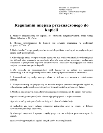 Załącznik do Zarządzenia Nr 0050.80.2012 Burmistrza Miasta i Gminy Gryfino z dnia 4 lipca 2012 r. Regulamin miejsca przeznaczonego do kąpieli 1. Miejsce przeznaczone do kąpieli jest obiektem zorganizowanym przez Urząd Miasta i Gminy w Gryfinie. 2. Miejsce przeznaczone do kąpieli jest otwarte codziennie w godzinach od godz. 1000 do 1800. 3. Dzieci do lat 7 mogą przebywać na terenie kąpieliska oraz kąpać się wyłącznie pod opieką osób pełnoletnich. 4. Obowiązuje zakaz wstępu osobom będących pod wpływem środków odurzających lub których stan wskazuje na spożycie alkoholu oraz zakaz sprzedaży, podawania, wnoszenia i spożywania napojów alkoholowych i środków odurzających na terenie miejsca przeznaczonego do kąpieli. 5. Ze względu na bezpieczeństwo osób kąpiących się zaleca się wzajemną obserwację, a w miarę potrzeby udzielanie pomocy i powiadomienie ratownika. 6. Ratownikami są osoby noszące ubiór w kolorze czerwonym z emblematem WOPR. 7. Wszystkie osoby znajdujące się na terenie miejsca przeznaczonego do kąpieli są zobowiązane podporządkować się poleceniom ratowników pełniących dyżur. 8. Osobom znajdującym się na terenie miejsca przeznaczonego do kąpieli nie wolno: a) przekraczać granicę strefy dla nie umiejących pływać – boje czerwone, b) przekraczać granicę strefy dla umiejących pływać – żółte boje, c) wchodzić do wody wbrew zakazowi ratownika oraz w czasie, w którym wywieszona jest flaga czerwona, d) niszczyć urządzeń i sprzętu znajdującego się na miejscu przeznaczonym do kąpieli, e) zakłócać wypoczynku i kąpieli innych osób, a szczególności: - popychać i wrzucać inne osoby do wody, - zaśmiecać i brudzić terenu miejsca przeznaczonego do kąpieli, 9. Osoby naruszające porządek publiczny lub przepisy niniejszego regulaminu będą usuwane z terenu miejsca przeznaczonego do kąpieli niezależnie od ewentualnego skierowania sprawy na drogę postępowania w sprawach o wykroczeniach. 10. Osoby niszczące i uszkadzające sprzęt wodny lub urządzenia na terenie miejsca przeznaczonego do kąpieli ponoszą odpowiedzialność materialną za wyrządzone szkody. 11. Parkowanie pojazdów mechanicznych na terenie miejsca przeznaczonego do kąpieli jest zabronione. 12. Zabrania się wprowadzania psów i innych zwierząt na teren miejsca przeznaczonego do kąpieli. Wszelkie uwagi dotyczące miejsca przeznaczonego do kąpieli oraz łamania zasad zawartych w regulaminie prosimy zgłaszać do Straży Miejskiej w Gryfinie tel. 91 416 81 60 (całodobowo) lub do Ośrodka Sportu i Rekreacji w Gryfinie tel. 91 416 30 11 (pn-pt w godz. 7.00 – 15.00)