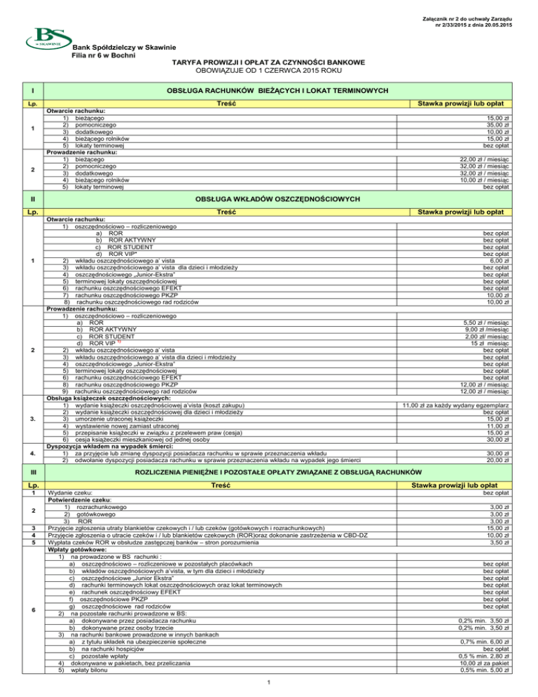 taryfa prowizji i opłat - Bank Spółdzielczy w Skawinie