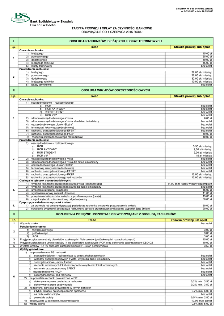 Załącznik nr 2 do uchwały Zarządu nr 2/33/2015 z dnia 20.05.2015 Bank Spółdzielczy w Skawinie Filia nr 6 w Bochni TARYFA PROWIZJI I OPŁAT ZA CZYNNOŚCI BANKOWE OBOWIĄZUJE OD 1 CZERWCA 2015 ROKU OBSŁUGA RACHUNKÓW BIEŻĄCYCH I LOKAT TERMINOWYCH I Treść Lp. 1 2 II Lp. 1 2 3. 4. III Lp. 1 2 3 4 5 6 Stawka prowizji lub opłat Otwarcie rachunku: 1) bieżącego 2) pomocniczego 3) dodatkowego 4) bieżącego rolników 5) lokaty terminowej Prowadzenie rachunku: 1) bieżącego 2) pomocniczego 3) dodatkowego 4) bieżącego rolników 5) lokaty terminowej 15,00 zł 35,00 zł 10,00 zł 15,00 zł bez opłat 22,00 zł / miesiąc 32,00 zł / miesiąc 32,00 zł / miesiąc 10,00 zł / miesiąc bez opłat OBSŁUGA WKŁADÓW OSZCZĘDNOŚCIOWYCH Treść Stawka prowizji lub opłat Otwarcie rachunku: 1) oszczędnościowo – rozliczeniowego a) ROR b) ROR AKTYWNY c) ROR STUDENT d) ROR VIP* 2) wkładu oszczędnościowego a’ vista 3) wkładu oszczędnościowego a’ vista dla dzieci i młodzieży 4) oszczędnościowego „Junior-Ekstra” 5) terminowej lokaty oszczędnościowej 6) rachunku oszczędnościowego EFEKT 7) rachunku oszczędnościowego PKZP 8) rachunku oszczędnościowego rad rodziców Prowadzenie rachunku: 1) oszczędnościowo – rozliczeniowego a) ROR b) ROR AKTYWNY c) ROR STUDENT d) ROR VIP 1) 2) wkładu oszczędnościowego a’ vista 3) wkładu oszczędnościowego a’ vista dla dzieci i młodzieży 4) oszczędnościowego „Junior-Ekstra” 5) terminowej lokaty oszczędnościowej 6) rachunku oszczędnościowego EFEKT 8) rachunku oszczędnościowego PKZP 9) rachunku oszczędnościowego rad rodziców Obsługa książeczek oszczędnościowych: 1) wydanie książeczki oszczędnościowej a’vista (koszt zakupu) 2) wydanie książeczki oszczędnościowej dla dzieci i młodzieży 3) umorzenie utraconej książeczki 4) wystawienie nowej zamiast utraconej 5) przepisanie książeczki w związku z przelewem praw (cesja) 6) cesja książeczki mieszkaniowej od jednej osoby Dyspozycja wkładem na wypadek śmierci: 1) za przyjęcie lub zmianę dyspozycji posiadacza rachunku w sprawie przeznaczenia wkładu 2) odwołanie dyspozycji posiadacza rachunku w sprawie przeznaczenia wkładu na wypadek jego śmierci bez opłat bez opłat bez opłat bez opłat 6,00 zł bez opłat bez opłat bez opłat bez opłat 10,00 zł 10,00 zł 5,50 zł / miesiąc 9,00 zł /miesiąc 2,00 zł/ miesiąc 15 zł miesiąc bez opłat bez opłat bez opłat bez opłat bez opłat 12,00 zł / miesiąc 12,00 zł / miesiąc 11,00 zł za każdy wydany egzemplarz bez opłat 15,00 zł 11,00 zł 15,00 zł 30,00 zł 30,00 zł 20,00 zł ROZLICZENIA PIENIĘŻNE I POZOSTAŁE OPŁATY ZWIĄZANE Z OBSŁUGĄ RACHUNKÓW Treść Stawka prowizji lub opłat Wydanie czeku: Potwierdzenie czeku: 1) rozrachunkowego 2) gotówkowego 3) ROR Przyjęcie zgłoszenia utraty blankietów czekowych i / lub czeków (gotówkowych i rozrachunkowych) Przyjęcie zgłoszenia o utracie czeków i / lub blankietów czekowych (ROR)oraz dokonanie zastrzeżenia w CBD-DZ Wypłata czeków ROR w obsłudze zastępczej banków – stron porozumienia Wpłaty gotówkowe: 1) na prowadzone w BS rachunki : a) oszczędnościowo – rozliczeniowe w pozostałych placówkach b) wkładów oszczędnościowych a’vista, w tym dla dzieci i młodzieży c) oszczędnościowe „Junior Ekstra” d) rachunki terminowych lokat oszczędnościowych oraz lokat terminowych e) rachunek oszczędnościowy EFEKT f) oszczędnościowe PKZP g) oszczędnościowe rad rodziców 2) na pozostałe rachunki prowadzone w BS: a) dokonywane przez posiadacza rachunku b) dokonywane przez osoby trzecie 3) na rachunki bankowe prowadzone w innych bankach a) z tytułu składek na ubezpieczenie społeczne b) na rachunki hospicjów c) pozostałe wpłaty 4) dokonywane w pakietach, bez przeliczania 5) wpłaty bilonu 1 bez opłat 3,00 zł 3,00 zł 3,00 zł 15,00 zł 10,00 zł 3,50 zł bez opłat bez opłat bez opłat bez opłat bez opłat bez opłat bez opłat 0,2% min. 3,50 zł 0,2% min. 3,50 zł 0,7% min. 6,00 zł bez opłat 0,5 % min. 2,80 zł 10,00 zł za pakiet 0,5% min. 5,00 zł 7 8 9 10. 11 12 13 14 15 16 17 18 Wypłaty gotówkowe: 1) z rachunku bieżącego 2) z rachunku pomocniczego 3) z rachunku dodatkowego 4) z rachunku bieżącego rolników 5) z rachunków oszczędnościowo – rozliczeniowych 6) z rachunków wkładów oszczędnościowych a’vista 7) z rachunków wkładów oszczędnościowych a’vista dla dzieci i młodzieży 8) z rachunku oszczędnościowego EFEKT 9) z rachunku oszczędnościowego PKZP 10) z rachunku oszczędnościowego rad rodziców 11) z konta „Zlecenie do wypłaty” Uwaga: Minimalna kwota prowizji Wypłaty gotówkowe bez wcześniejszego zaawizowania kwot, które zgodnie z komunikatem Banku podlegają wcześniejszemu zgłoszeniu – opłata dodatkowa do opłaty określonej w poz.7 (nie dotyczy lokat) Niepodjęcie w terminie zamówionej kwoty wypłaty gotówkowej, która zgodnie z Komunikatem Banku podlega wcześniejszemu zgłoszeniu (nie dotyczy lokat) Polecenia przelewu: 1) pomiędzy rachunkami prowadzonymi w BS: a) za każdą złożoną dyspozycję przelewu pomiędzy rachunkami oszczędnościowymi a bieżącymi tego samego posiadacza rachunku b) pomiędzy pozostałymi rachunkami 2) na rachunki prowadzone w innych bankach: a) za każdą złożoną dyspozycję z rachunków bieżących b) za każdą złożoną dyspozycję z rachunków pomocniczych c) za każdą złożoną dyspozycję z rachunków oszczędnościowo-rozliczeniowych d) za każdą złożoną dyspozycję z rachunków oszczędnościowo-rozliczeniowych Student e) za każdą złożoną dyspozycję z rachunków wkładów oszczędnościowych a’vista f) za każdą złożoną dyspozycję z rachunków wkładów oszczędnościowych a’vista dla dzieci i młodzieży g) z rachunku oszczędnościowego EFEKT h) z rachunku oszczędnościowego PKZP i) z rachunku oszczędnościowego rad rodziców 3) potwierdzenie dyspozycji z rachunku bez uprzed