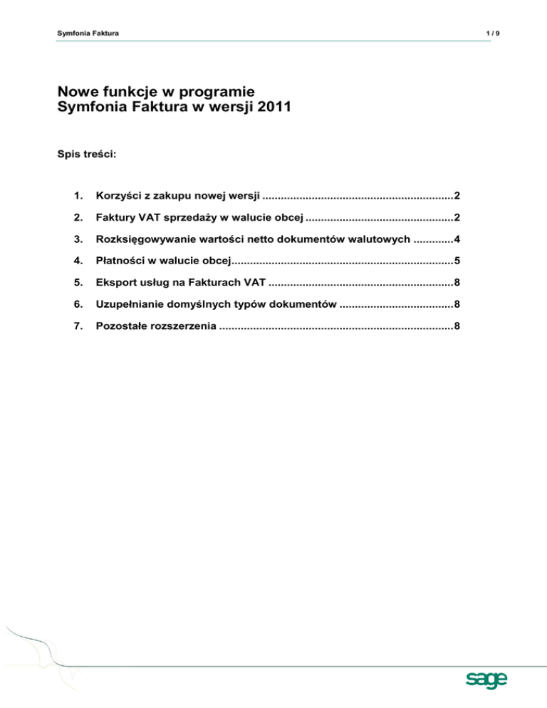 Symfonia Faktura Nowe funkcje w programie Symfonia Faktura w wersji 2011 Spis treści: 1. Korzyści z zakupu nowej wersji .............................................................. 2 2. Faktury VAT sprzedaży w walucie obcej ................................................ 2 3. Rozksięgowywanie wartości netto dokumentów walutowych ............. 4 4. Płatności w walucie obcej........................................................................ 5 5. Eksport usług na Fakturach VAT ............................................................ 8 6. Uzupełnianie domyślnych typów dokumentów ..................................... 8 7. Pozostałe rozszerzenia ............................................................................ 8 1/9 Symfonia Faktura 2/9 Korzyści z zakupu nowej wersji 1. Zmniejszenie pracochłonności przy wystawianiu i ewidencji faktur oraz płatności walutowych poprzez: a. Eliminację zbędnych dodatkowych czynności. b. Automatyzację wykonywanych operacji. 2. Zmniejszenie ryzyka popełnienia błędu poprzez: a. Automatyzację operacji ustalania kursu waluty obcej właściwego dla wystawianego dokumentu. b. Bezpieczne korygowanie dokumentów. Faktury VAT sprzedaży w walucie obcej Dotychczas Symfonia Faktura umożliwiała wystawianie faktur VAT w walucie obcej, ale tylko na podstawie cen brutto. W wersji 2011 ta funkcjonalność została rozszerzona o możliwość wystawiania tego typu faktur również na podstawie cen netto. Aby korzystać z nowej funkcjonalności należy w nagłówku dokumentu wybrać rodzaj ceny: NETTO. Jednocześnie umożliwiono podanie dla tych typów dokumentów dwóch oddzielnych kursów: „dla VAT” – należy podać kurs wymagany zgodnie z ustawą o podatku VAT. Program domyślnie podpowiada ten kurs na podstawie daty wystawienia dokumentu. Kurs ten jest wykorzystywany do obliczenia kwoty podatku VAT oraz wartości prezentowanych w rejestrze VAT. „CIT/PIT” – należy podać kurs wymagany zgodnie z ustawą o podatku dochodowym. Program domyślnie podpowiada ten kurs na podstawie daty sprzedaży dokumentu. Kurs ten jest zapisywany wraz z rozrachunkiem dotyczącym tego dokumentu, ponadto jest wykorzystywany do obliczenia rentowności sprzedaży oraz w dekretacji wartości przychodu i rozrachunku. Ponieważ podatek VAT należy wykazywać zawsze w walucie krajowej, podsumowanie tego dokumentu prezentuje wartość netto oraz wartość brutto wyrażone w walucie obcej, natomiast kwotę podatku VAT w walucie PLN. Została również wprowadzona możliwość wystawienia dokumentu korygującego z tytułu błędnie podanego kursu VAT. Symfonia Faktura 3/9 Program automatycznie oblicza korektę wartości netto, kwoty podatku VAT i wartości brutto z tytułu zmiany kursu. Z tego też powodu program blokuje jednoczesną korektę kursu oraz wartości, ilości lub stawki VAT pozycji dokumentu. Aby dokonać takiej korekty, należy wystawić dwa dokumenty korygujące: jeden dotyczący zmiany kursu, a drugi dotyczący pozostałych zmian. Zmiana kursu „CIT/PIT” nie wymaga ani edycji faktury, ani wystawiania do niej korekty. Wystarczy w dokumencie ustawić kursor w polu kursu „CIT/PIT” i kliknąć na przycisk pojawi się komunikat jak na rysunku poniżej: . Po wybraniu nowego kursu Po wybraniu opcji „Tak”, nowy kurs „CIT/PIT” zostanie zapisany w tym dokumencie oraz we wszystkich jego korektach i w rozrachunkach dotyczących tych dokumentów. Zestawienia Skutkiem powyższych zmian są następujące zmiany w zestawieniach: Zestawienia sprzedaży przedstawiające wartości netto, VAT i brutto w PLN prezentują te wartości przeliczone wg kursu „dla VAT”. Zestawienia sprzedaży przedstawiające wartość przychodu oraz kosztu własnego sprzedaży w PLN prezentują te wartości przeliczone wg kursu „CIT/PIT”. Zestawienia przedstawiające wartość rozrachunków w PLN prezentują wartości przeliczone wg kursu zapisanego w rozrachunku, którym na ogół jest kurs „CIT/PIT”. Symfonia Faktura 4/9 Dekretacja Dekretacje dokumentów walutowych w wersji 2011 Symfonia Faktura można przeglądać zarówno w walucie obcej jak i w PLN. Domyślnie dla dokumentów walutowych wyświetlana jest dekretacja w walucie obcej. Aby obejrzeć dekretację w PLN, należy nacisnąć klawisze Lewy Alt+W. Dekretacja w PLN dokumentu wystawionego w walucie obcej w programie Symfonia Faktura może nie być zbilansowana ze względu na różnice w obliczaniu kwoty podatku VAT oraz wartości netto i brutto w PLN. Różnica między stronami zapisu, po przesłaniu do programu Symfonia Finanse i Księgowość v. 2011 zostanie zaksięgowana na konto wskazane w ustawieniach tego programu. Więcej informacji na temat tej funkcjonalności znajduje się z dokumencie „Faktury walutowe w Symfonia Faktura.PDF” dostępnym w menu Pomoc\ Dokumentacja. Uwaga: Aby w pełni korzystać z nowej funkcjonalności zalecane jest księgowanie tego typu faktur w programie Symfonia Finanse i Księgowość v. 2011 za pomocą nowego typu dokumentu. Księgowanie za pomocą dotychczasowego typu faktury sprzedaży będzie możliwe tylko dla faktur, w których kursy „dla VAT” i „CIT/PIT” są równe. Rozksięgowywanie wartości netto dokumentów walutowych Dotychczas rozksięgowywanie na kilka kont księgowych wartości netto dokumentów walutowych często skutkowało niezbilansowaniem zapisów w PLN. W efekcie każdy taki dokument po przesłaniu do programu Symfonia Finanse i Księgowość wymagał od użytkownika ręcznego poprawia zapisów w PLN. W związku z tym w programie Symfonia Faktura v. 2011 wprowadzono zmiany w mechanizmie tworzenia dekretacji, które pozwolą na uniknięcie tych niedogodności. Nowy mechanizm tworząc dekretację dokumentu porównuje wartość netto dokumentu przeliczoną na PLN z sumą zapisów dekretujących tą wartość w PLN. Jeśli pojawia się różnica, to poprawia wartość największego zapisu, tak by ich suma była zgodna z równow