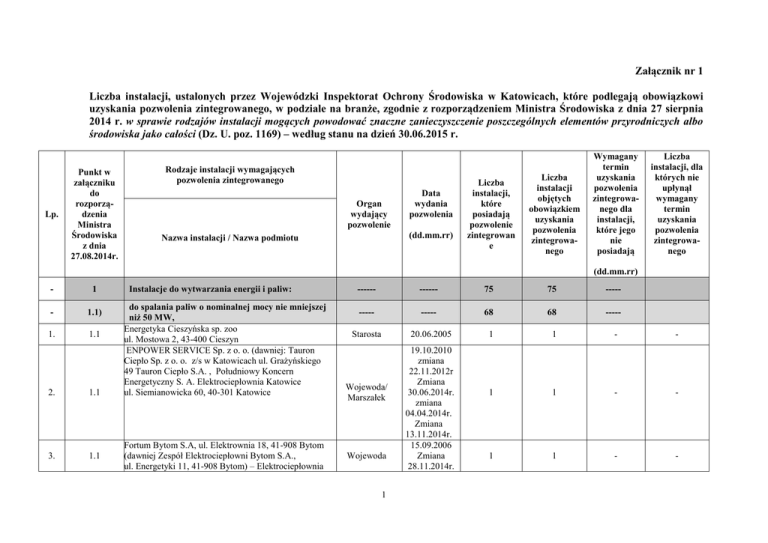 Załącznik nr 1 Liczba instalacji, ustalonych przez Wojewódzki Inspektorat Ochrony Środowiska w Katowicach, które podlegają obowiązkowi uzyskania pozwolenia zintegrowanego, w podziale na branże, zgodnie z rozporządzeniem Ministra Środowiska z dnia 27 sierpnia 2014 r. w sprawie rodzajów instalacji mogących powodować znaczne zanieczyszczenie poszczególnych elementów przyrodniczych albo środowiska jako całości (Dz. U. poz. 1169) – według stanu na dzień 30.06.2015 r. Lp. Punkt w załączniku do rozporządzenia Ministra Środowiska z dnia 27.08.2014r. Rodzaje instalacji wymagających pozwolenia zintegrowanego Organ wydający pozwolenie Data wydania pozwolenia (dd.mm.rr) Nazwa instalacji / Nazwa podmiotu Liczba instalacji, które posiadają pozwolenie zintegrowan e Liczba instalacji objętych obowiązkiem uzyskania pozwolenia zintegrowanego Wymagany termin uzyskania pozwolenia zintegrowanego dla instalacji, które jego nie posiadają Liczba instalacji, dla których nie upłynął wymagany termin uzyskania pozwolenia zintegrowanego (dd.mm.rr) - 1 - 1.1) 1. 1.1 2. 1.1 3. 1.1 Instalacje do wytwarzania energii i paliw: do spalania paliw o nominalnej mocy nie mniejszej niż 50 MW, Energetyka Cieszyńska sp. zoo ul. Mostowa 2, 43-400 Cieszyn ENPOWER SERVICE Sp. z o. o. (dawniej: Tauron Ciepło Sp. z o. o. z/s w Katowicach ul. Grażyńskiego 49 Tauron Ciepło S.A. , Południowy Koncern Energetyczny S. A. Elektrociepłownia Katowice ul. Siemianowicka 60, 40-301 Katowice Fortum Bytom S.A, ul. Elektrownia 18, 41-908 Bytom (dawniej Zespół Elektrociepłowni Bytom S.A., ul. Energetyki 11, 41-908 Bytom) – Elektrociepłownia ------ ------ 75 75 ----- ----- ----- 68 68 ----- Starosta 20.06.2005 1 1 - - 1 1 - - 1 1 - - Wojewoda/ Marszałek Wojewoda 1 19.10.2010 zmiana 22.11.2012r Zmiana 30.06.2014r. zmiana 04.04.2014r. Zmiana 13.11.2014r. 15.09.2006 Zmiana 28.11.2014r. Lp. Punkt w załączniku do rozporządzenia Ministra Środowiska z dnia 27.08.2014r. Rodzaje instalacji wymagających pozwolenia zintegrowanego Organ wydający pozwolenie Data wydania pozwolenia (dd.mm.rr) Nazwa instalacji / Nazwa podmiotu Liczba instalacji, które posiadają pozwolenie zintegrowan e Liczba instalacji objętych obowiązkiem uzyskania pozwolenia zintegrowanego Wymagany termin uzyskania pozwolenia zintegrowanego dla instalacji, które jego nie posiadają Liczba instalacji, dla których nie upłynął wymagany termin uzyskania pozwolenia zintegrowanego (dd.mm.rr) 4. 1.1 5. 1.1 6. 1.1 7. 1.1 8. 1.1 9. 1.1 10. 1.1 „Miechowice” ZPC „Carbo - Energia” Sp. z o.o. Zabrze, Ciepłownia „Nowy Wirek”, ul. Tunkla 112, 41-708 Ruda Śl. Kompania Węglowa S.A. Elektrociepłownie, Rybnik. Elektrociepłownia „Anna” w Pszowie ul. P. Skwary 21 ArcelorMittal Poland S.A. Oddział w Sosnowcu (dawniej Mittal Steel Poland S.A. oddział w Sosnowcu) Kompania Węglowa S.A. Elektrociepłownie, Rybnik. Ciepłownia „Jankowice” w Rybniku ul. Jastrzębska 12, Veolia Tarnowskie Góry Sp. z o.o. 42-600 Tarnowskie Góry ul. Zagórska 179 (Dawniej: DALKIA Tarnowskie Góry Sp. z o.o. 42-600 Tarnowskie Góry ul. Zagórska 179, dawniej: Miejskie Przedsiębiorstwo Energetyki Cieplnej Sp. z .o.o. Ciepłownia „Przyjaźń”w Tarnowskich Górach) TAURON Dystrybucja S.A. ( dawniej:ENION S.A. Oddział w Częstochowie Zakład Energetyczny Częstochowa. Ciepłownia ZAWODZIE) ul. Mirowska 24/32, Częstochowa Kompania Węglowa S.A. Elektrociepłownie, Rybnik, Elektrociepłownia Chwałowice ul. 1-go Maja 26 w Rybniku 11.08.2006 zmiana 10.11.2014r. 30.06.2005 zmiana 27.11.2014r. Starosta Starosta 1 1 - - 1 1 - - Wojewoda 07.08.2006 1 1 - - Starosta 30.06.2006 zmiana 12.12.2014r. 1 1 - - Starosta 26.06.2006 Zmiana 05.12.2014 1 1 - - Starosta 20.06.2007 1 1 - - Starosta 30.06.2006 Zmiana 11.12.2013r. Zmiana 12.12.2014r. 1 1 - - 2 Lp. Punkt w załączniku do rozporządzenia Ministra Środowiska z dnia 27.08.2014r. Rodzaje instalacji wymagających pozwolenia zintegrowanego Organ wydający pozwolenie Data wydania pozwolenia (dd.mm.rr) Nazwa instalacji / Nazwa podmiotu Liczba instalacji, które posiadają pozwolenie zintegrowan e Liczba instalacji objętych obowiązkiem uzyskania pozwolenia zintegrowanego Wymagany termin uzyskania pozwolenia zintegrowanego dla instalacji, które jego nie posiadają Liczba instalacji, dla których nie upłynął wymagany termin uzyskania pozwolenia zintegrowanego (dd.mm.rr) 11. 1.1 ZPC „Carbo-Energia” Sp. z o.o. Zabrze, Elektrociepłownia „Mikołaj” ul. Szyb Walenty, 41-706 Ruda Śląska 12. 1.1 13. 1.1 14. 1.1 Nadwiślańska Spółka Energetyczna Sp. z o.o.Brzeszcze, Zakład Ciepłowniczy Nr 2 „Czeczott” w Woli ul. Pszczyńska 2, Wola Ciepłownia „Siemianowice” Sp. z o.o. Rejon I ul. Przodowników Pracy 1 41-100 Siemianowice Śląskie Ciepłownia Rydułtowy Sp. z o.o. ul. A. Mickiewicza 21, 44-280 Rydułtowy 15. 1.1 ZPC „Carbo-Energia” Sp. z o.o. Zabrze Ciepłownia „Bielszowice”, ul. Halembska 160, 41-711 Ruda Śl. 16. 1.1 17. 1.1 FORTUM POWER & HEAT POLSKA SP. Z O. O. – (dawniej FORTUM CZĘSTOCHOWA S.A.)Ciepłownia Rejtan ul. Rejtana 37/39 Częstochowa Zakłady Energetyki Cieplnej S A, Katowice, Ciepłownia W 3 „Mysłowice”, ul. Świerczyny 3, 41400 Mysłowice 15.09.2006 Zmiana 22.08.2012 zmiana 20.11.2014r. 30.06.2006 Starosta Starosta 19.06.2007 Zmiana 5.03.2013r. 20.03.2007 zmiana 27.11.2014r. 11.08.2006 zmiana 20.11.2014r. 19.10.2005 Zmiana 31.2.2013r 30.07.2004 Zmiana 29.11.2011 Nowe pozwolenie 29.08.2014 Zmiana Starosta Starosta Starosta Starosta Starosta 3 1 1 - 1 1 - - 1 1 - - 1 1 - - 1 1 - - 1 1 - - 1 1 - Lp. Punkt w załączniku do rozporządzenia Ministra Środowiska z dnia 27.08.2014r. Rodzaje instalacji wymagających pozwolenia zintegrowanego Organ wydający pozwolenie Data wydania pozwolenia (dd.mm.rr) Nazwa instalacji / Nazwa podmiotu Liczba instalacji, które posiadają pozwolenie zintegrowan e Liczba instalacji objętych obowiązkiem uzyskania pozwolenia zinteg