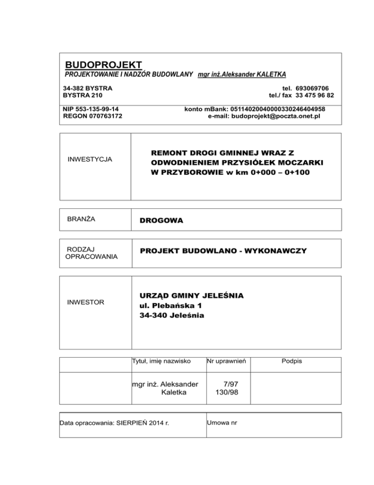 BUDOPROJEKT PROJEKTOWANIE I NADZÓR BUDOWLANY mgr inż.Aleksander KALETKA 34-382 BYSTRA BYSTRA 210 tel. 693069706 tel./ fax 33 475 96 82 NIP 553-135-99-14 REGON 070763172 INWESTYCJA konto mBank: 05114020040000330246404958 e-mail: [email protected] REMONT DROGI GMINNEJ WRAZ Z ODWODNIENIEM PRZYSIÓŁEK MOCZARKI W PRZYBOROWIE w km 0+000 – 0+100 BRANŻA DROGOWA RODZAJ OPRACOWANIA PROJEKT BUDOWLANO - WYKONAWCZY INWESTOR URZĄD GMINY JELEŚNIA ul. Plebańska 1 34-340 Jeleśnia Tytuł, imię nazwisko WYKONAWCA mgr inż. Aleksander Kaletka Data opracowania: SIERPIEŃ 2014 r. Nr uprawnień 7/97 130/98 Umowa nr Podpis OPRACOWANIE ZAWIERA I. Część opisowa - 1 Opis techniczny Podstawa opracowania Cel i zakres popracowania Charakterystyka inwestycji Cel remontu drogi Stan drogi przed remontem Założenia projektowe przyjęte do realizacji remontu Uwagi 2 Informacja dotycząca bezpieczeństwa i ochrony zdrowia SIERPIEŃ 2014r . -BUDOPROJEKT Projektowanie i Nadzór Budowlanymgr inż. Aleksander Kaletka 34-382 Bystra 210 tel./fax: 33 475 96 82 kom. 693-069-706, e-mail: [email protected] 2 1. O P I S TECHNICZNY Odbudowy drogi wraz z odwodnieniem przysiółek Moczarki w Przyborowie w km 0+000 - 0+100 1. Podstawa opracowania. - Zlecenie Urzędu Gminy Jeleśnia - Polskie i Branżowe Normy Budowlane w zakresie związanym z opracowaniem. - Wizja i pomiary w terenie. - Uzgodnienia zakresu i technologii wykonania prac z inwestorem. 2. Cel i zakres opracowania Niniejsza dokumentacja obejmuje remont nawierzchni drogi gminnej wraz z odbudową zniszczonych murów oporowych i ścinek wlotowych i wylotowych dwóch przepustów okularowych na potoku biegnącego wzdłuż drogi, który w wyniku długotrwałych opadów i silnego nurtu został zniszczony i w obecnym stanie technicznym stwarza zagrożenie dla mieszkańców mieszkających przy tej drodze. Droga położona w miejscowości Przyborów, Gmina Jeleśnia. 3. Charakterystyka inwestycji W celu zabezpieczenia przepustów od drogą przed dalszym podmywaniem, projektuje się wykonanie odbudowy murów i ścinek wlotowych i wylotowych wraz z odbudową części wypadowej pod przepustami. Po wykonaniu odbudowy murów i ścianek na przepustach zabudowane zostaną bariery ochronne typu SP 06/2. 4. Cel remontu drogi. Intencją opracowania dokumentacji technicznej jest poprawa bezpieczeństwa ruchu kołowego i pieszego na odcinku drogi zniszczonej w wyniku intensywnych opadów atmosferycznych. Remont w/w drogi jest potrzebny gdyż w wyniku obfitych opadów deszczu nastąpiło naruszenie korpusu drogi gminnej szczególnie na przepustach. Aby zapobiec dalszemu podmywaniu korpusu drogi gminnej, należy dokonać remontu murów oraz nawierzchni drogi oraz zamontować bariery ochronne wzdłuż muru zabezpieczające przed wpadnięciem do cieku. 5. Stan drogi przed remontem. Projekt dotyczy remontu drogi gminnej, położonej w miejscowości Przyborów przysiółek Moczarki, gm. Jeleśnia, a w szczególności wykonanie odbudowy zniszczonych murów i ścianek na przepustach oraz naprawę zniszczonej nawierzchni drogi gminnej biegnącej wzdłuż potoku. W wyniku obfitych opadów atmosferycznych zniszczone są 3 mury oporowe i ścianki wlotowe i wylotowe przepustów okularowych oraz wymyta została nawierzchnia drogi. Podmyta droga zagraża bezpieczeństwu poruszających się po drodze stanowiącej jedyny dojazd do budynków mieszkalnych. 6. Założenia projektowe przyjęte do realizacji remontu. – – – – – – – Po konsultacjach i uzgodnieniu z Inwestorem przyjęto technologię remontu drogi: wykonanie podlania istniejących ław fundamentowych ścinek i murów wykonanie kotwienia zbrojenia i nadbetonowania murów i ścianek wykonanie przedłużenia murów wykonanie koszy siatkowo- kamiennych wykonanie zasypki za murami wykonanie nawierzchni mineralno-bitumicznej wykonanie poboczy z tłucznia 7. Uwagi Roboty należy prowadzić pod nadzorem osoby posiadającej odpowiednie kwalifikacje i uprawnienia budowlane do nadzorowania robót drogowych. Użyte materiały posiadać muszą wszystkie wymagane atesty i dopuszczenia do stosowania w budownictwie. 4 2. INFORMACJA DOTYCZĄCA BEZPIECZEŃSTWA I OCHRONY ZDROWIA 1. Zakres i kolejność robót Odbudowa drogi wraz z odwodnieniem przysiółek Moczarki w Przyborowie, w km 0+000 – 0+100 Zakres robót przy realizacji zaprojektowanego przedsięwzięcia obejmuje wykonanie odbudowy murów i ścinek przepustów okularowych oraz odbudowę nawierzchni mineralno-bitumicznej: 2. Elementy mogące stwarzać zagrożenie bezpieczeństwa i zdrowia ludzi - prace w wykopach stanowią zagrożenie przysypania ziemią, 3.Najczęściej występujące zagrożenia podczas realizacji robót ziemnych Przewidywane zagrożenie to: - Zasypanie pracowników w wyniku zawalenia się ścian wykopów - Wpadnięcie do wykopu na skutek uderzenia (np. łyżką koparki) - Obsunięcie się ziemi z krawędzi wykopu lub poślizgnięcie się - Uderzenie pracownika w wykopie spadającą bryłą ziemi, kamieniem lub innym przedmiotem - Porażenie prądem podczas prowadzenia robót w pobliżu przewodów energetycznych - Zawadzenie sprzętem o wysokim zasięgu o linię energetyczną napowietrzną - Nieprzestrzeganie warunków BHP podczas robót przy czynnych instalacjach (szczególnie przewodów energetycznych) 4. Instruktaż pracowników Pracownicy biorący udział w procesie budowlanym powinni być przeszkoleni w ramach okresowych szkoleń BHP, zgodnie z przepisami szczegółowymi. Ponadto bezpośrednio przed przystąpieniem do realizacji robót związanych z przedmiotową inwestycją należy przeprowadzić indywidualny instruktaż polegający na: - opracowaniu instrukcji bezpiecznego wykonywania prac opisanych w pkt. l oraz zaznajomienia się z nią pracowników. - szczegółowym poinformowaniu pracowników o występujących zagrożeniach podczas realizacji robót zgodnie z pkt 3 i 4. - przedstawieniu metod postępowania w przypadku wystąpienia bezpośredniego zagrożenia 