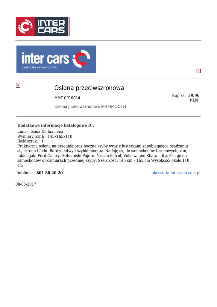 Osłona przeciwszronowa MMT CP10014 Kup za: 39.96 PLN Osłona przeciwszronowa MAMMOOTH Dodatkowe informacje katalogowe IC: Linia: Zima De lux maxi Wymiary [cm]: 145x165x110 Ilość sztuk: 1 Praktyczna osłona na przednią oraz boczne szyby wraz z lusterkami zapobiegająca osadzaniu się szronu i lodu. Bardzo łatwy i szybki montaż. Nadaję się do samochodów terenowych, van, takich jak: Ford Galaxy, Mitsubishi Pajero, Nissan Patrol, Volkswagen Sharan, itp. Pasuje do samochodów o rozmiarach przedniej szyby: Szerokość: 145 cm – 165 cm Wysokość: około 110 cm Infolinia: 801 80 20 20 08-03-2017 akcesoria.intercars.com.pl