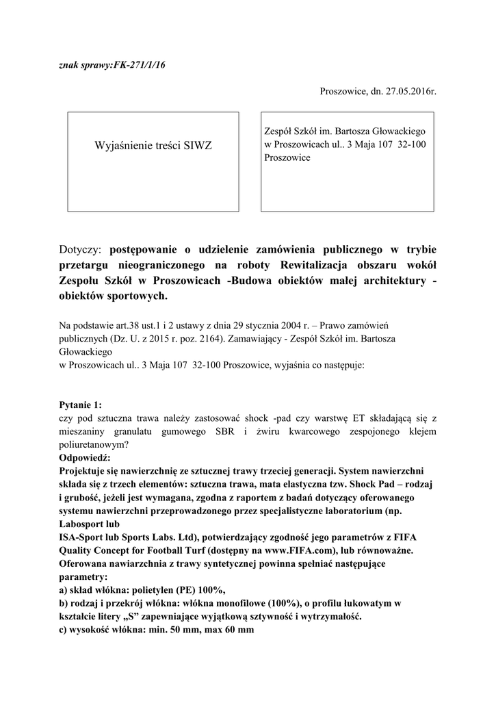 znak sprawy:FK-271/1/16 Proszowice, dn. 27.05.2016r. Wyjaśnienie treści SIWZ Zespół Szkół im. Bartosza Głowackiego w Proszowicach ul.. 3 Maja 107 32-100 Proszowice Dotyczy: postępowanie o udzielenie zamówienia publicznego w trybie przetargu nieograniczonego na roboty Rewitalizacja obszaru wokół Zespołu Szkół w Proszowicach -Budowa obiektów małej architektury obiektów sportowych. Na podstawie art.38 ust.1 i 2 ustawy z dnia 29 stycznia 2004 r. – Prawo zamówień publicznych (Dz. U. z 2015 r. poz. 2164). Zamawiający - Zespół Szkół im. Bartosza Głowackiego w Proszowicach ul.. 3 Maja 107 32-100 Proszowice, wyjaśnia co następuje: Pytanie 1: czy pod sztuczna trawa należy zastosować shock -pad czy warstwę ET składającą się z mieszaniny granulatu gumowego SBR i żwiru kwarcowego zespojonego klejem poliuretanowym? Odpowiedź: Projektuje się nawierzchnię ze sztucznej trawy trzeciej generacji. System nawierzchni składa się z trzech elementów: sztuczna trawa, mata elastyczna tzw. Shock Pad – rodzaj i grubość, jeżeli jest wymagana, zgodna z raportem z badań dotyczący oferowanego systemu nawierzchni przeprowadzonego przez specjalistyczne laboratorium (np. Labosport lub ISA-Sport lub Sports Labs. Ltd), potwierdzający zgodność jego parametrów z FIFA Quality Concept for Football Turf (dostępny na www.FIFA.com), lub równoważne. Oferowana nawiarzchnia z trawy syntetycznej powinna spełniać następujące parametry: a) skład włókna: polietylen (PE) 100%, b) rodzaj i przekrój włókna: włókna monofilowe (100%), o profilu łukowatym w kształcie litery „S” zapewniające wyjątkową sztywność i wytrzymałość. c) wysokość włókna: min. 50 mm, max 60 mm d) grubość włókna: min. 230 μm, e) ciężar włókna – Dtex: min. 15.300, f) ilość włókien: min. 200.000 g) ilość pęczków: min. 8 400/m2 h) waga całkowita trawy: min. 2600 g/m2 i) kolor: 3 odcienie zieleni, nadające nawierzchnie wygląd trawy naturalnej. j) podkład trawy: poliuretanowy. Nie dopuszcza się podkładu lateksowego. k) wypełnienie trawy: piasek kwarcowy oraz barwiony na zielono granulat SBR Do oferty należy załączyć dokumenty dotyczące systemu nawierzchni z trawy syntetycznej: a) Raport z badań dotyczący oferowanego systemu nawierzchni tj. trawy syntetycznej, shock-padu jeżeli jest wymagany oraz wymaganego wypełnienia (dopuszcza się raport z badań z wypełnieniem z czarnym granulatem SBR) potwierdzający technologię produkcji sztucznej trawy, potwierdzający minimalne wymagane parametry systemu nawierzchni oraz spełnianie wymogów FIFA Quality Concept for Football Turf z określeniem wszystkich elementów systemu nawierzchni wykonane przez autoryzowane laboratorium (np.: Labosport, ISA Sport, Sportslabs, Ercat lub inne równoważne), b) Badania lub deklaracja zgodności z normą PN-EN 15330-1:2008. d) Kartę techniczna oferowanej nawierzchni, potwierdzoną przez jej producenta e) Certyfikat FPP dla producenta trawy (FIFA Preferred Producer) lub równoważny f) Atest PZH lub równoważny dla oferowanej nawierzchni i wypełnienia. g) Autoryzację producenta trawy syntetycznej, wystawiona dla wykonawcy na realizowaną inwestycję wraz z potwierdzeniem gwarancji udzielonej przez producenta na tę nawierzchnię. h) Próbkę A4 oferowanej nawierzchni Pytanie 2: Jeśli należy ułożyć warstwę ET ,to proszę podać jej grubość odpowiednio dla nawierzchni poliuretanowej i dla sztucznej trawy. Odpowiedź: Nawierzchnia sportowa Podkład: Elastyczna przepuszczalna warstwa podkładowa typu ET gr. min 30 mm. Nawierzchnia: Dolna warstwa z granulatu SBR gr. min. 10 mm, górna warstwa wykonana z kolorowego granulatu EPDM z produkcji pierwotnej, barwionego w masie, nakładany metodą natryskową, grubości min. 2 mm,. Nawierzchnia poliuretanowa bieżni w kolorze czerwonym/bordo. Boiska do koszykówki i siatkówki kolor, pomomarańczowy i szary Wymagania techniczne dla nawierzchni boiska zgodne z normą PN-EN 14877:2008 Nawierzchnie syntetyczne niekrytych terenów sportowych. Specyfikacja. Poz. Określenie parametru, jednostka Wartość wymagana 1. Wytrzymałość na rozciąganie [MPa] ≥ 1,05 2. Wydłużenie w chwili zerwania warstwy dolnej [%] ≥ 85 3. Wytrzymałość na rozdzieranie (N) ≥ 150 4. 5. 6. 7. Odporność na ścieranie w aparacie Tobera [g] Współczynnik tarcia kinetycznego – nawierzchnia sucha – nawierzchnia mokra Odkształcenie pionowe w temp. 23ºC [mm] Amortyzacja wstrząsów, redukcja siły na podł. betonowym % Odporność na uderzenie: - powierzchnia odcisku kulki, mm² - ślady zniszczenia ≤ 0,650 ≥ 0,5 ≥ 0,3 < 1,2 ≥ 37 600 ± 80 Brak śladów zniszczenia Wymagania w zakresie nierówności nawierzchni. Odcinek pomiarowy 3,0 m: – wymagania docelowe 6 mm – max. dopuszczalne odchylenie 8 mm Dopuszczalne – max. ilość odchyleń w przedziale > 6 mm ≤ 8 mm 4 nierówności Odcinek pomiarowy 0,3 m: nawierzchni – wymaganie ≤ 2 mm – max. dopuszczalne odchylenie 0 – max. ilość odchyleń 0 Dokumenty i certyfikaty, które powinny udokumentować dobrą jakość produktu: Aktualny certyfikat IAAF na produkt rekomendacja techniczną ITB Badania potwierdzające bezpieczeństwo ekologiczne według normy DIN 18035- 6:2004, wydane przez laboratorium posiadające akredytacje, potwierdzające wartości pierwiastków śladowych. Karta techniczna oferowanej nawierzchni potwierdzona przez jej producenta. Atest PZH dla oferowanej nawierzchni. Autoryzacja producenta nawierzchni poliuretanowej wystawiona dla wykonawcy na realizowaną inwestycję wraz z potwierdzeniem 60 miesięcznej gwarancji udzielonej przez producenta na tę nawierzchnię. Pytanie 3: Prosimy o potwierdzenie ,ze prawidłowa nawierzchnia na boisko do koszykówki i siatkówki i na bieżnie to nawierzchni a poliuretanowa przepuszczalna dla wody typu natrysk gr 13 mm układana na ET gr min 30 mm? Odpowiedź: Wymagana warstwa ET 30mm, warstwa poluretanoowa nie mniej niż 12